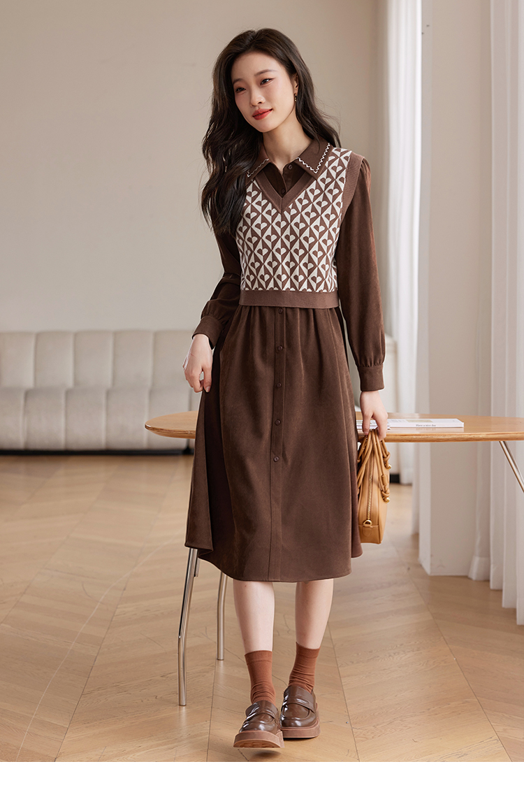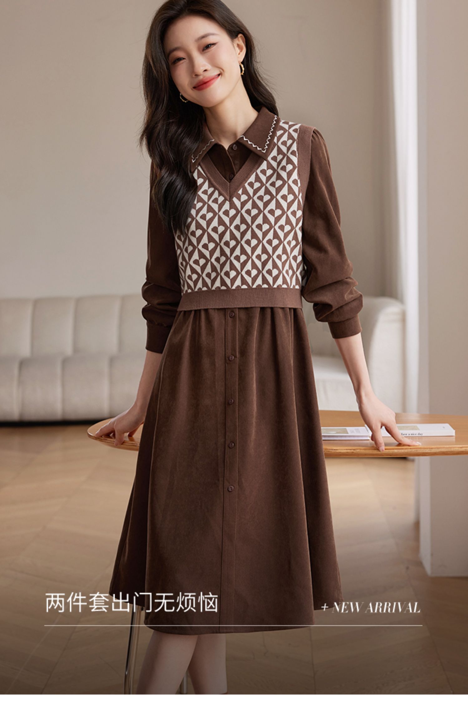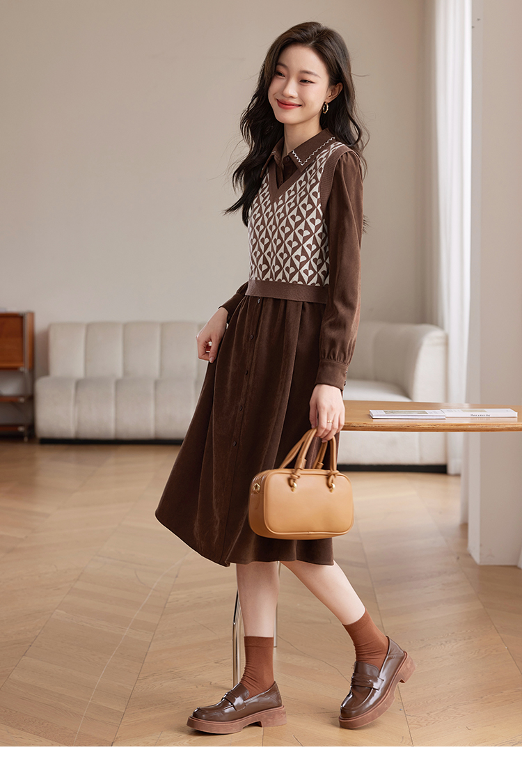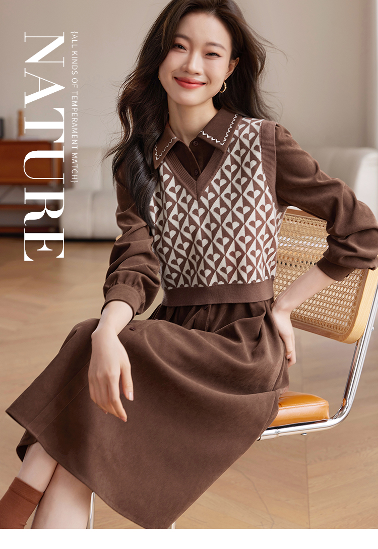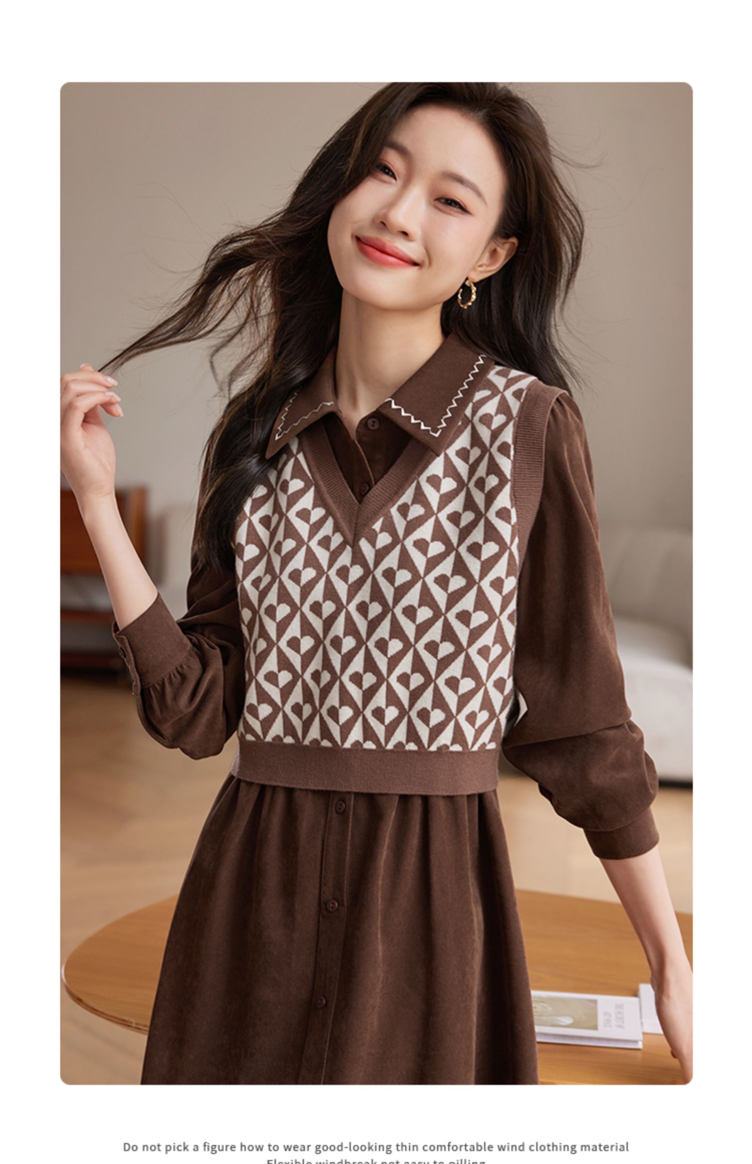 【专属特价】熙世界学院风长袖连衣裙套装女士秋冬提花针织马甲衬衫裙子两件套