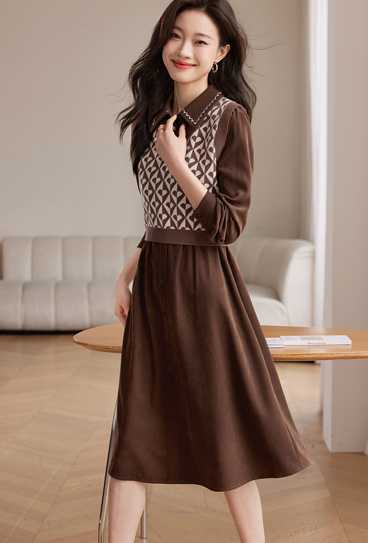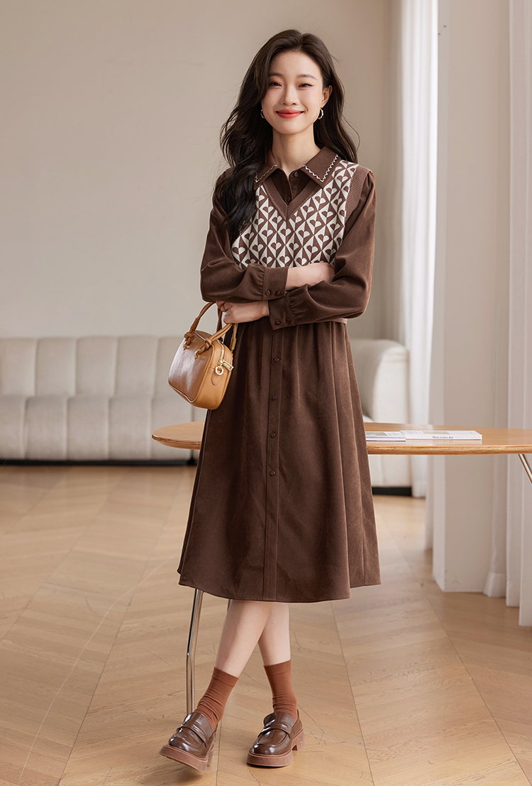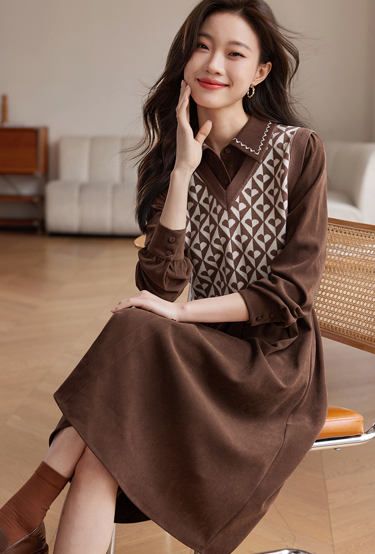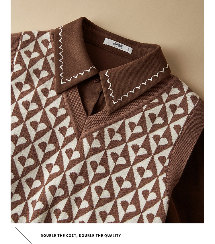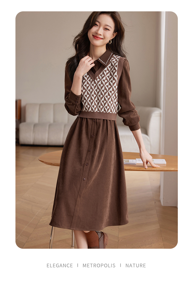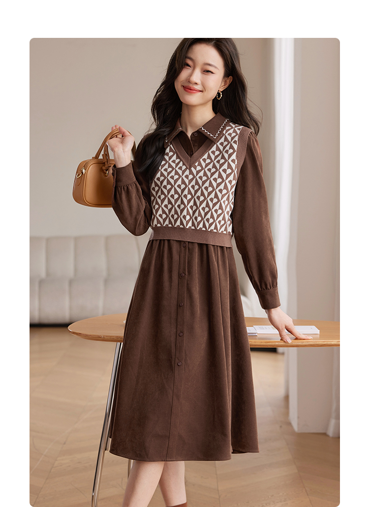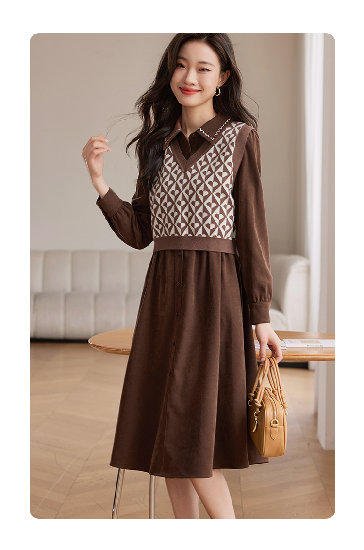 【专属特价】熙世界学院风长袖连衣裙套装女士秋冬提花针织马甲衬衫裙子两件套
