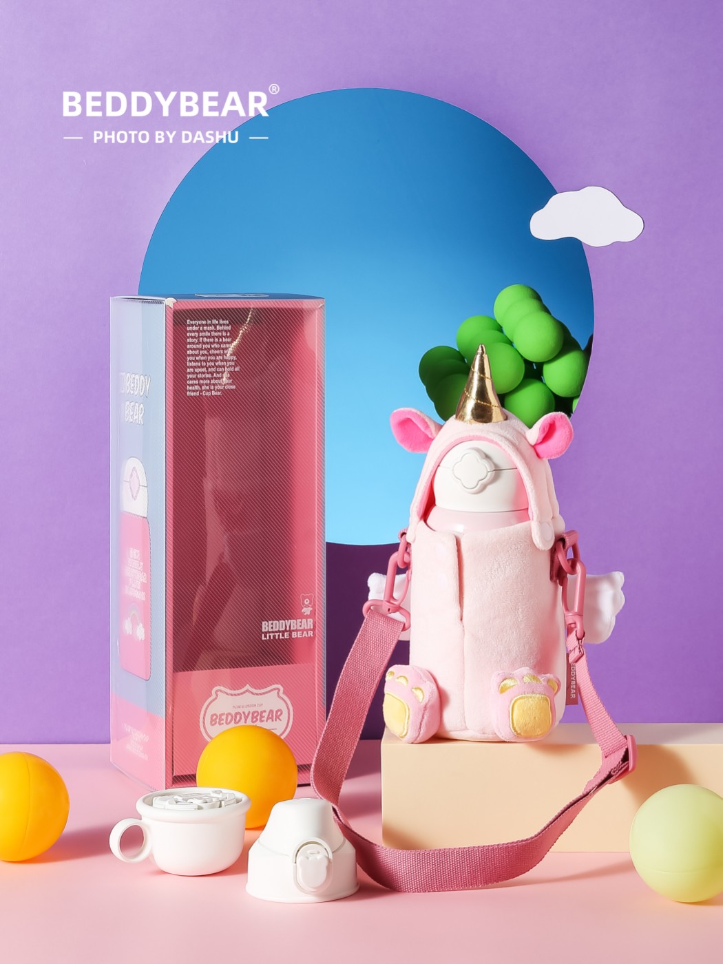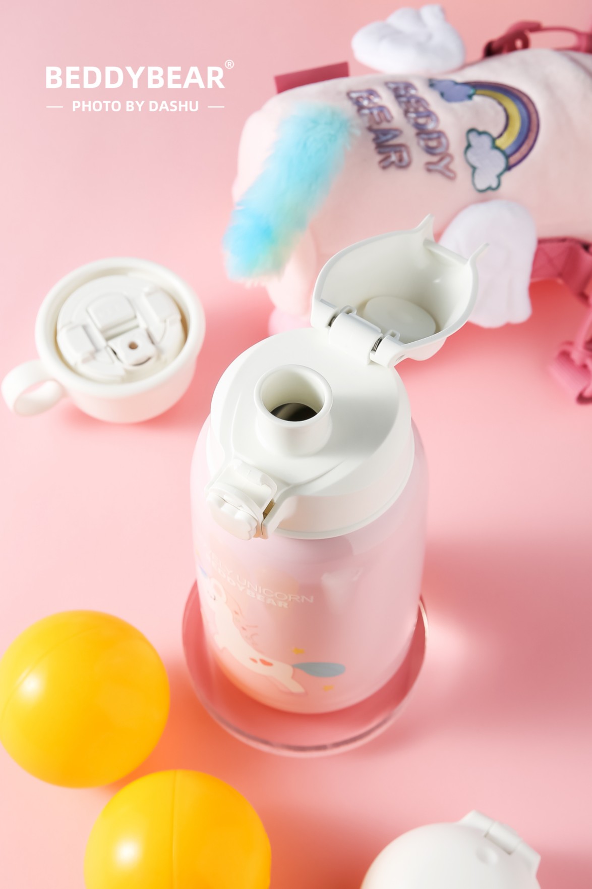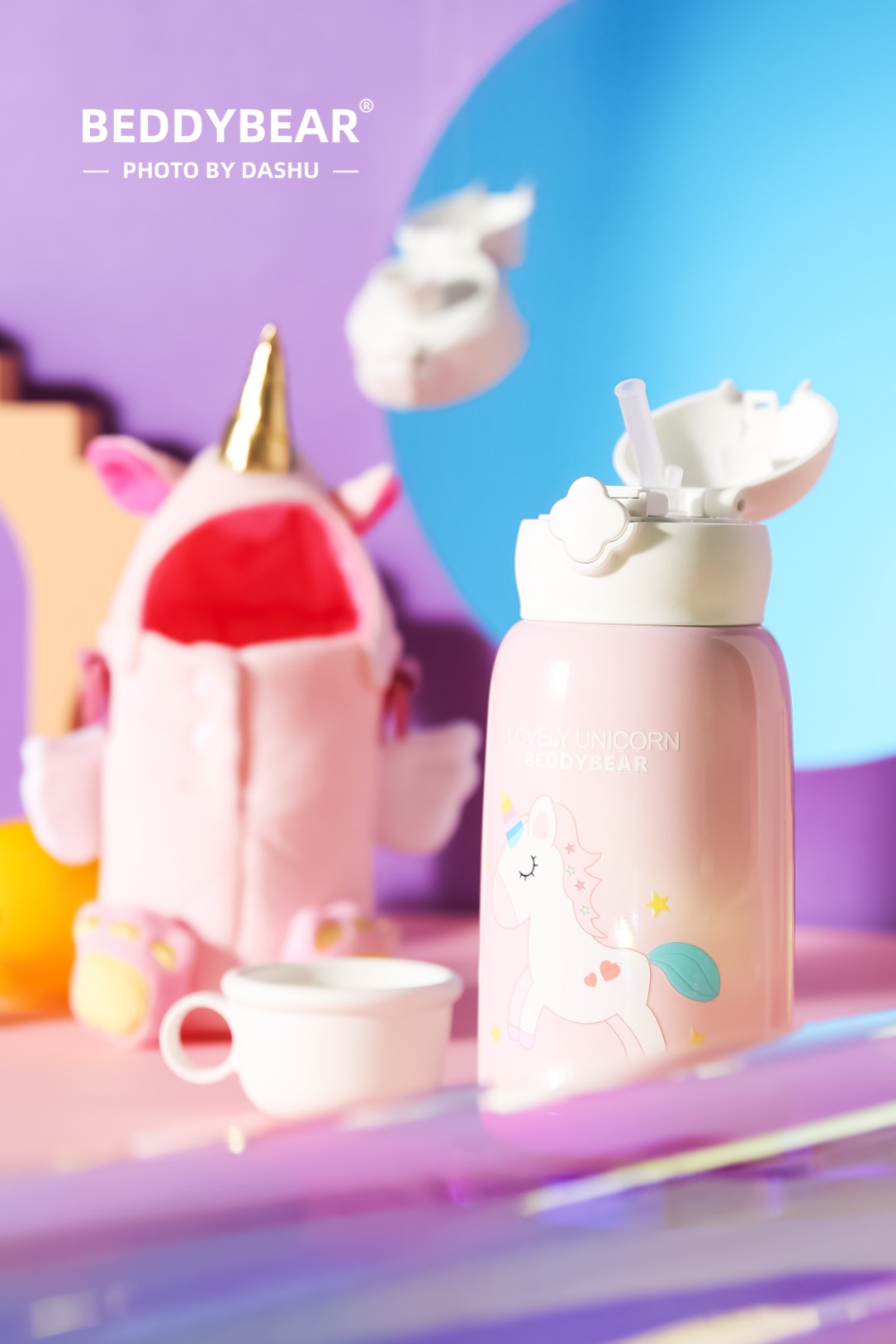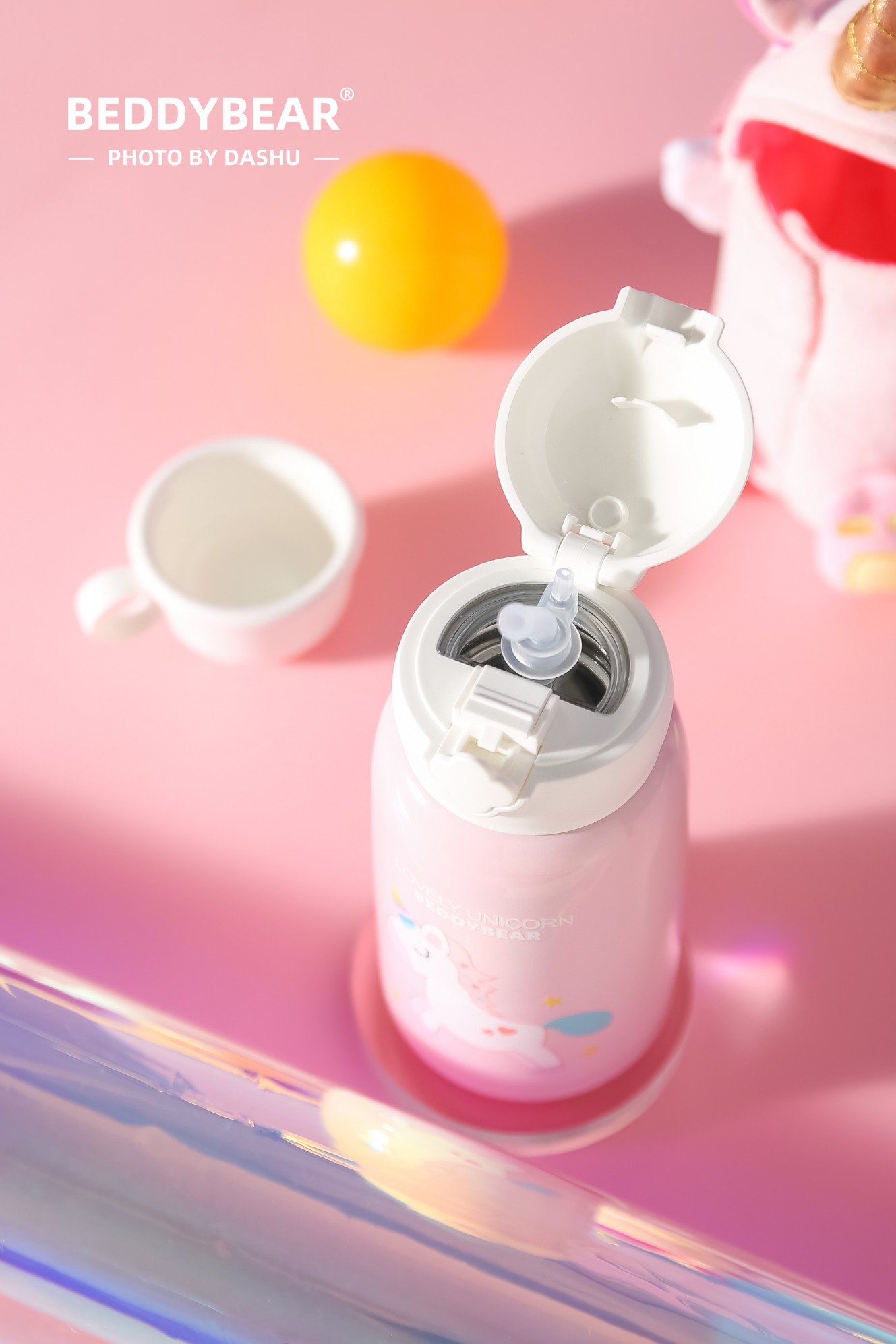 杯具熊新款四叶草儿童保温杯毛绒独角兽带吸管幼儿园小学生水杯-15