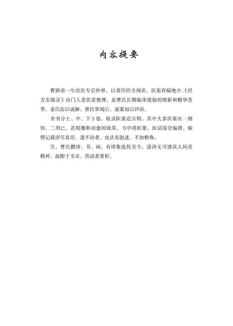 曹氏医案存稿绝少,幸得门人姜佐景整理而成《经方实验录》。此书是曹氏长期临床的缩影和精华,其中大多医案有一剂知,二剂已,甚则覆杯而愈的效果。