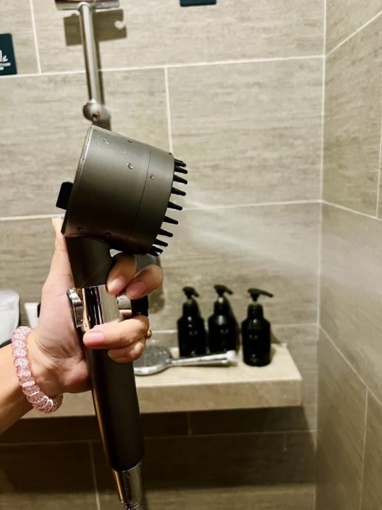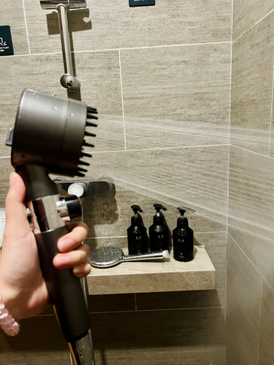 — 花洒也有开关|3档调控,1摁即止 花洒没有开关,真的是一个巨大的BUG‼ 比如:抹洗发水的时候,免不了关掉水龙头 重新开的时候满头泡泡,再去摸开关就很不方便 第 个开关,一键开关 往外推是关,往里推是开 推到一般自然就是水量减半。 不仅操作方便,而且下次开 还是这个水温,超级NICE啊! 第 个开关,在它的头部 3个档位:雨淋模式|混合模式|雾化模式 2、3档都非常适合洗澡和冲凉 1档的话,除了可以冲冲自己 卫生间地板、马桶、甚至沾满泥巴的鞋 都可以用ta冲,非常实用~