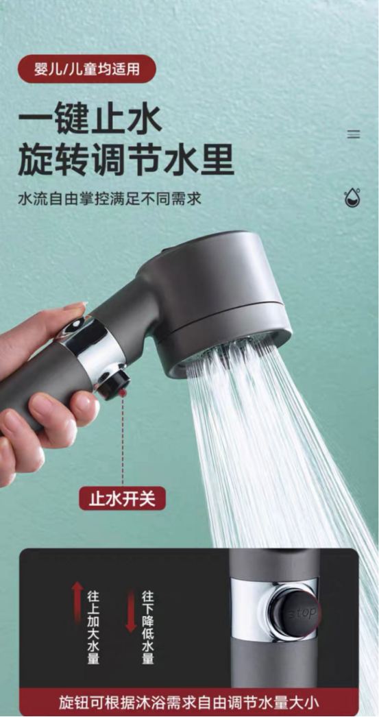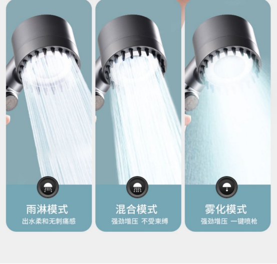 一定要买真的好用! 我这样说,它可以直接吊打普通的增压花洒! 可以定制专属于你的「洗澡模式」❗ 超强增压花洒,三档模式,可根据喜好选择,更爽更干净。 水柱超细密、柔和,淋在身上也不会痛,告别「洗澡水在我脸上胡乱的拍」 奇妙的开关键,不用关水龙头,不影响水温,一推按键就关,反向推按键就开了。 内置过滤芯,过滤掉自来水中杂质,守护你的肌肤和秀发