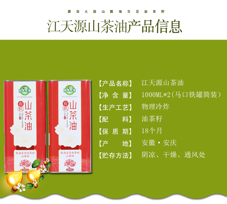 江天源纯正山茶油1000ml 2 精选野生油茶籽 物理冷榨 天然食用油