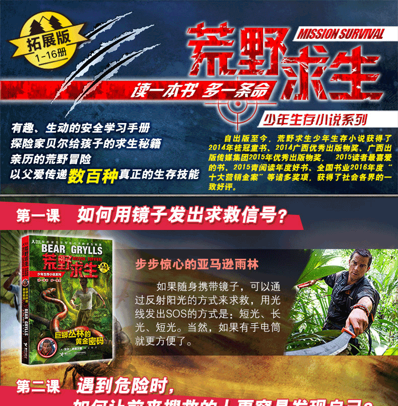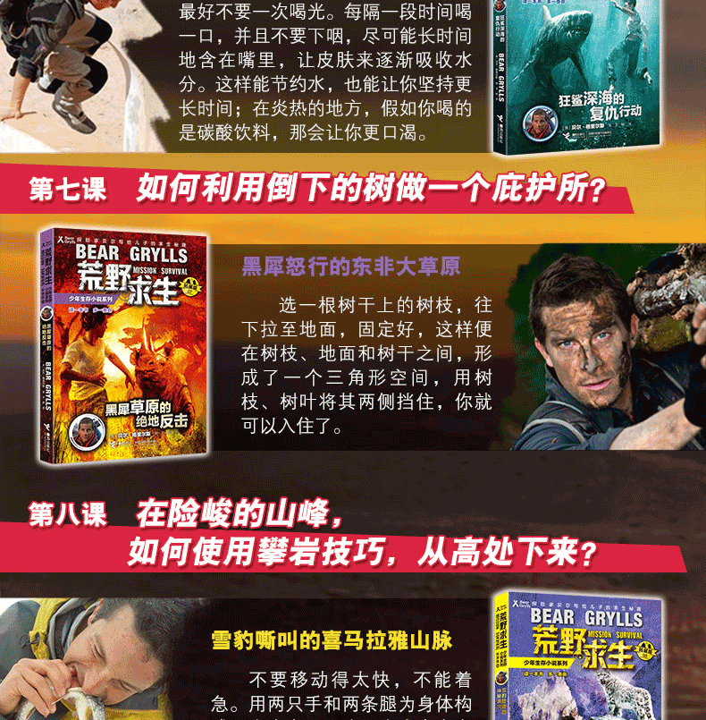 本系列是生存大师贝尔·格里尔斯专门为广大少年儿童,特别是为三个儿子创作的作品。贝尔将自己丰富的野外生存经验融入精彩的少年历险小说,在动人心魄的故事情节中,生动描述了上百种简洁而实用的求生技巧,传递了野外求生的永恒的法则“永远保持微笑,只要活着就有希望”,引领小读者在危险环境中,镇静从容,险境求生。