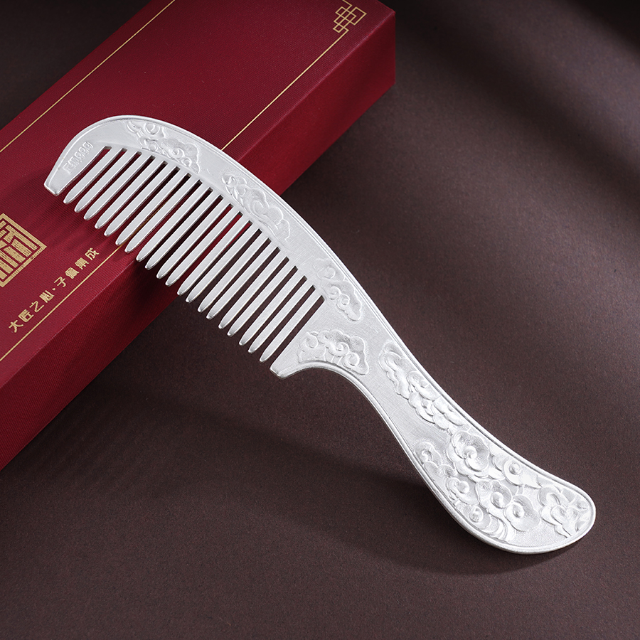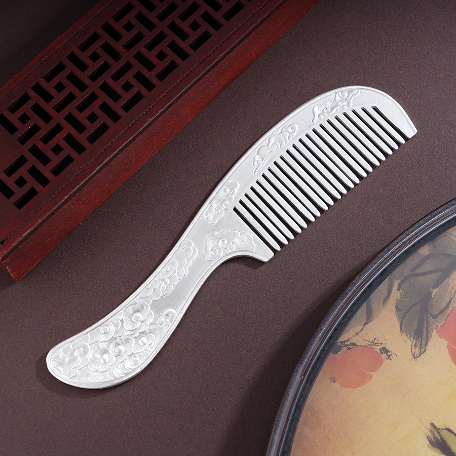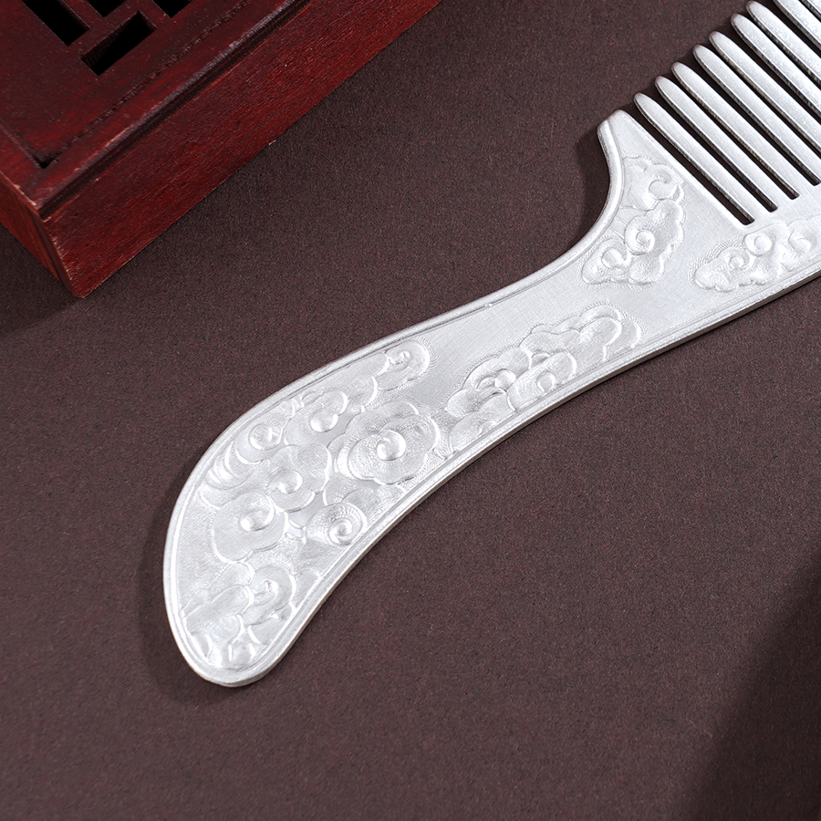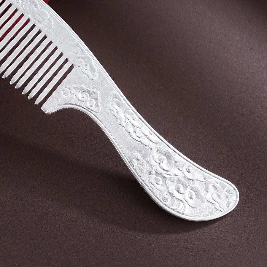 【寓意】:以錾刻古法,于方寸银梳表面,精雕祥云纹样。“祥瑞常伴,福寿宁安”的吉愿,都凝聚在了银光粼粼的圆韵之中。