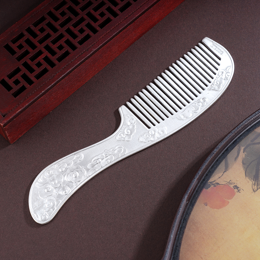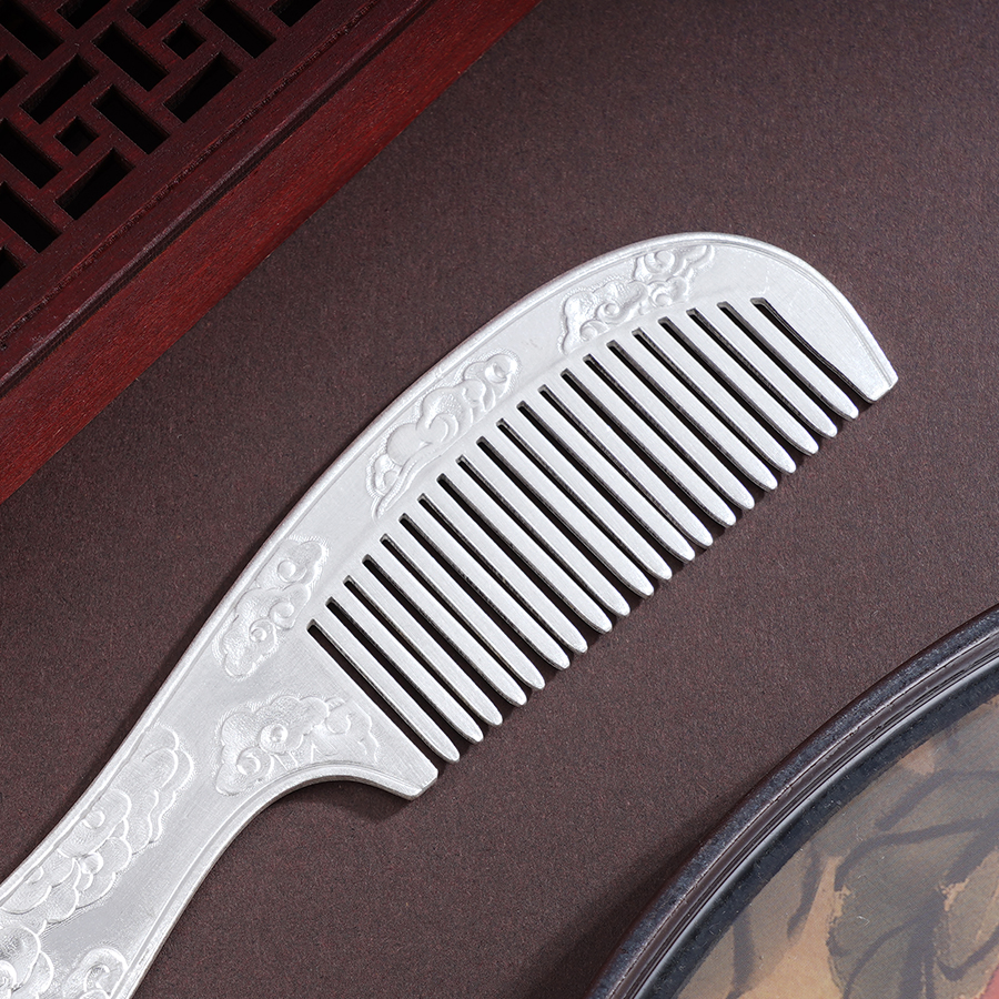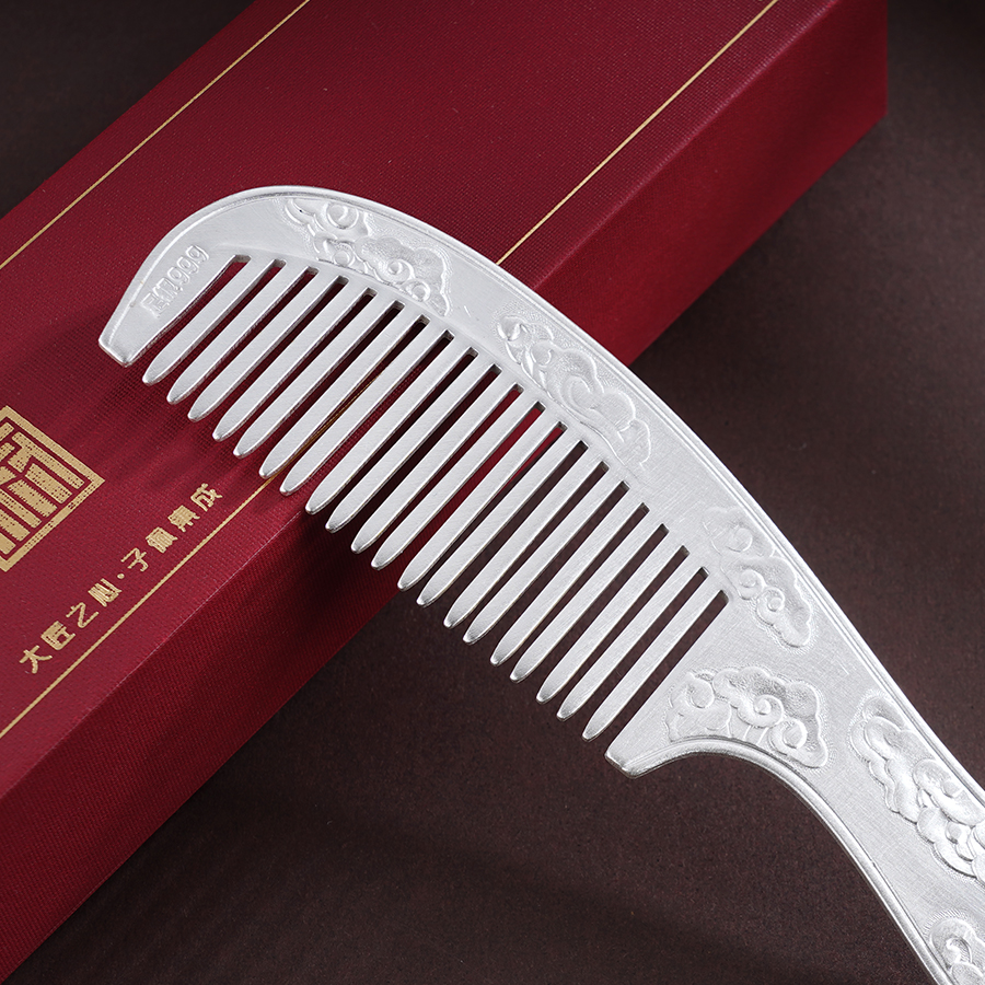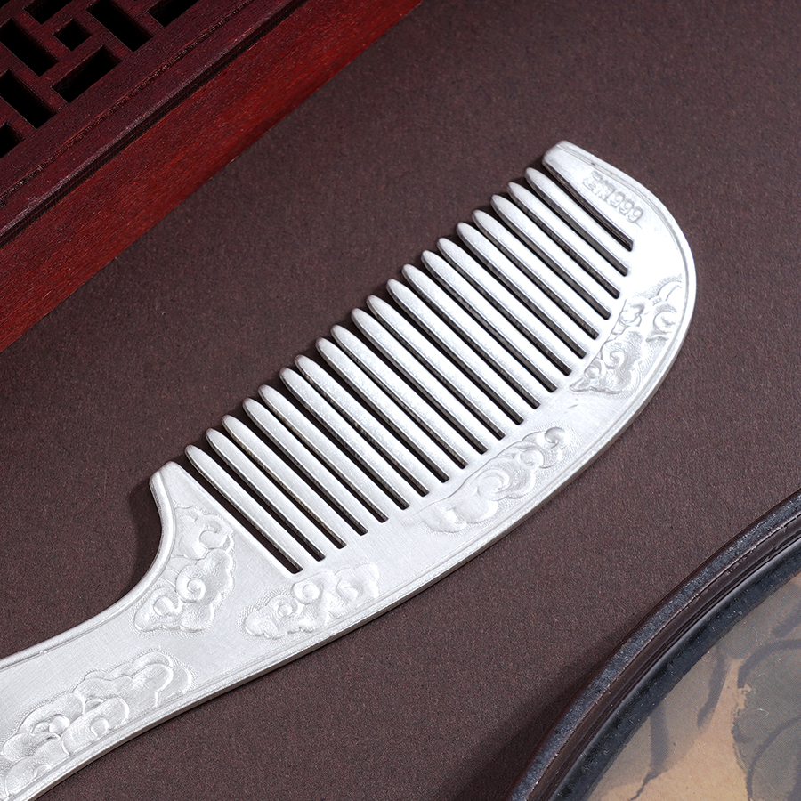 【寓意】:以錾刻古法,于方寸银梳表面,精雕祥云纹样。“祥瑞常伴,福寿宁安”的吉愿,都凝聚在了银光粼粼的圆韵之中。