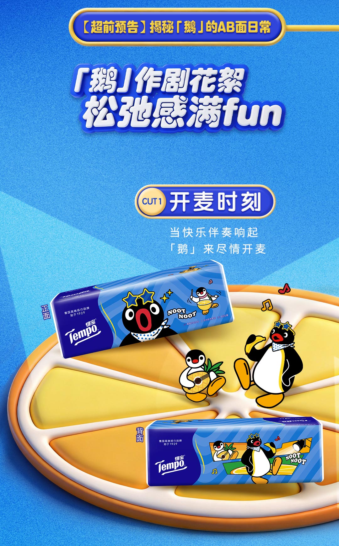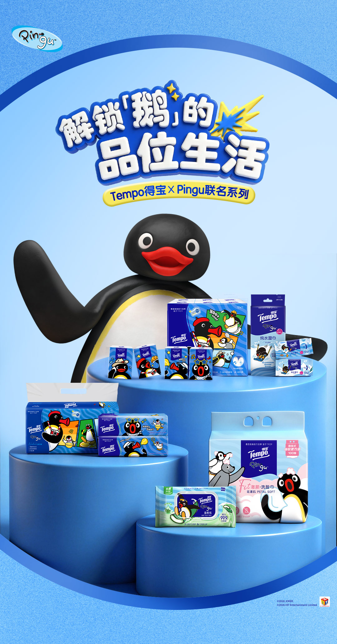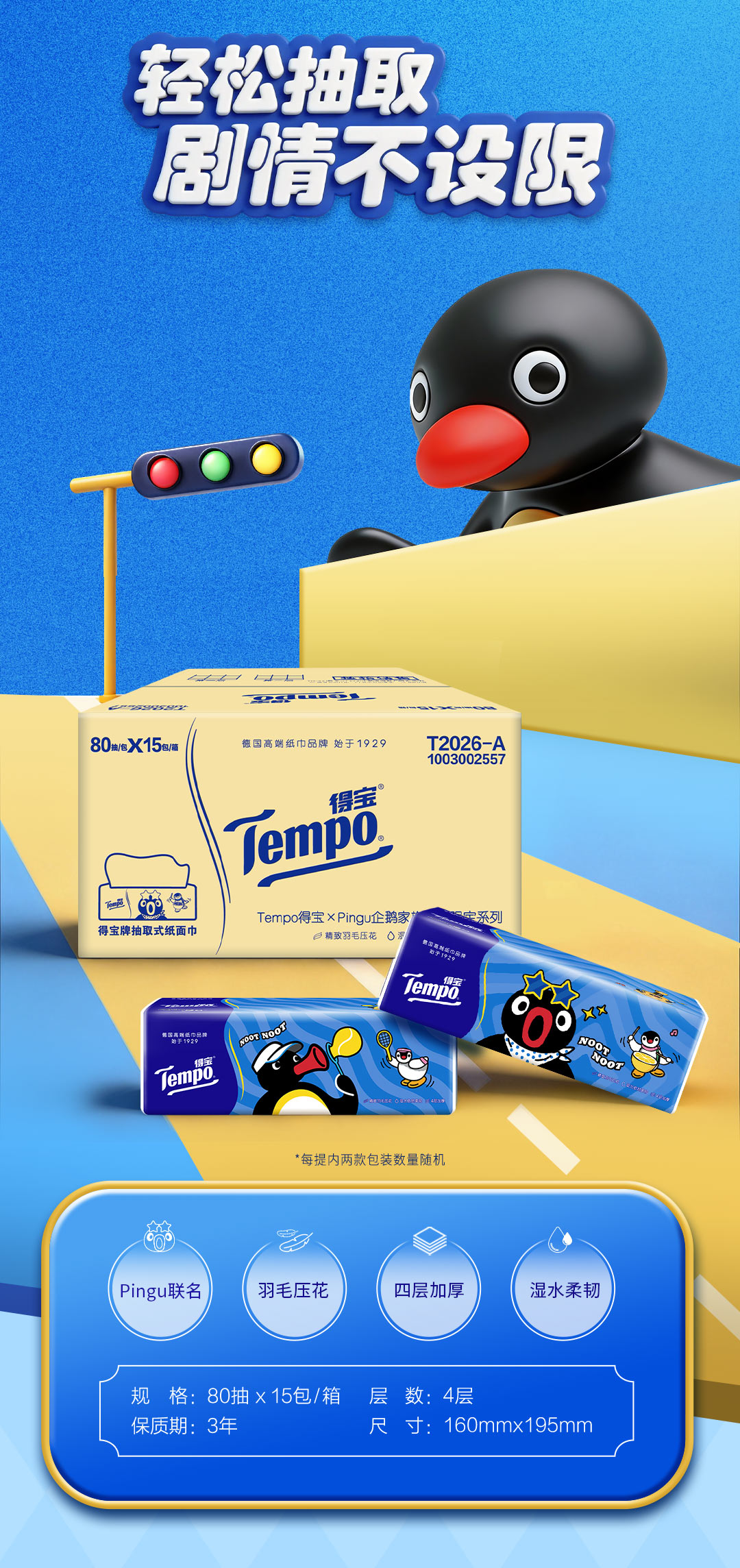 【新品】Tempo得宝 Pingu联名款 无香抽纸80抽*15包/箱 四层加厚 两款不同联名包装 一次拥有