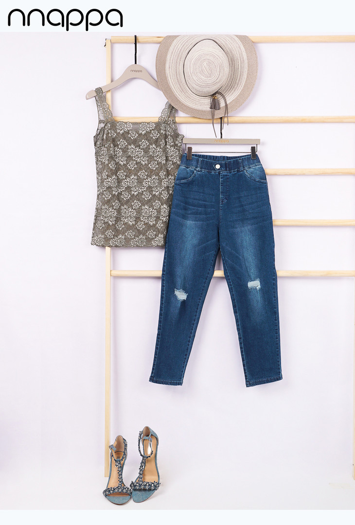 直筒膝盖破洞牛仔裤高腰修身松紧裤29069
