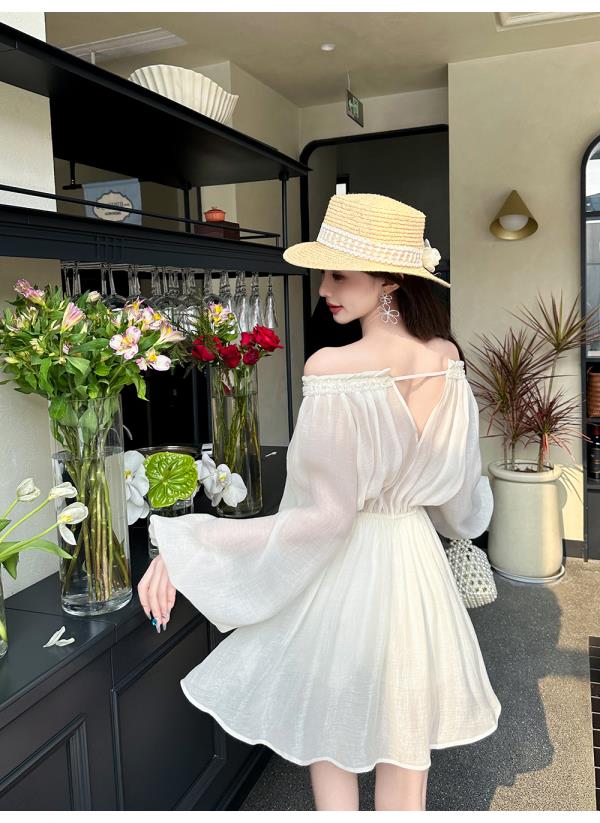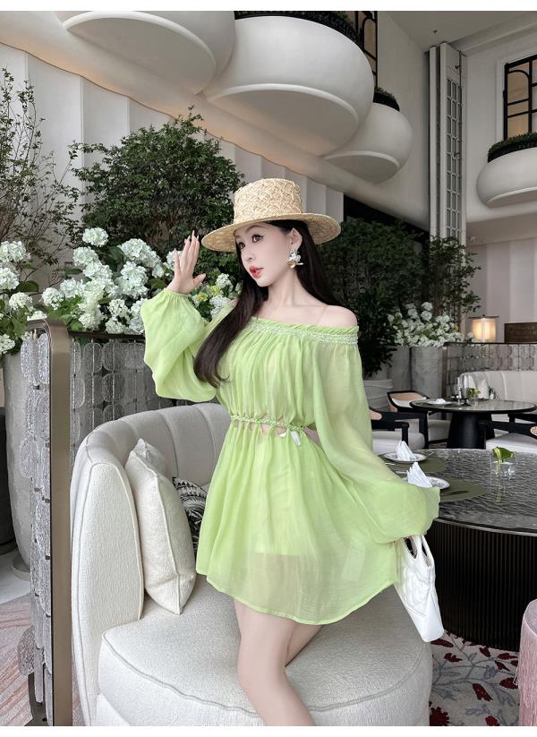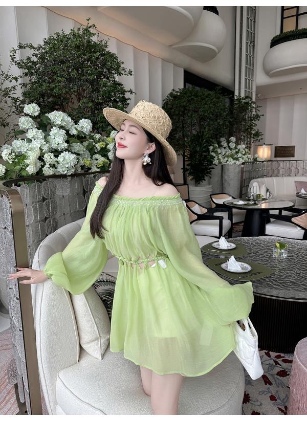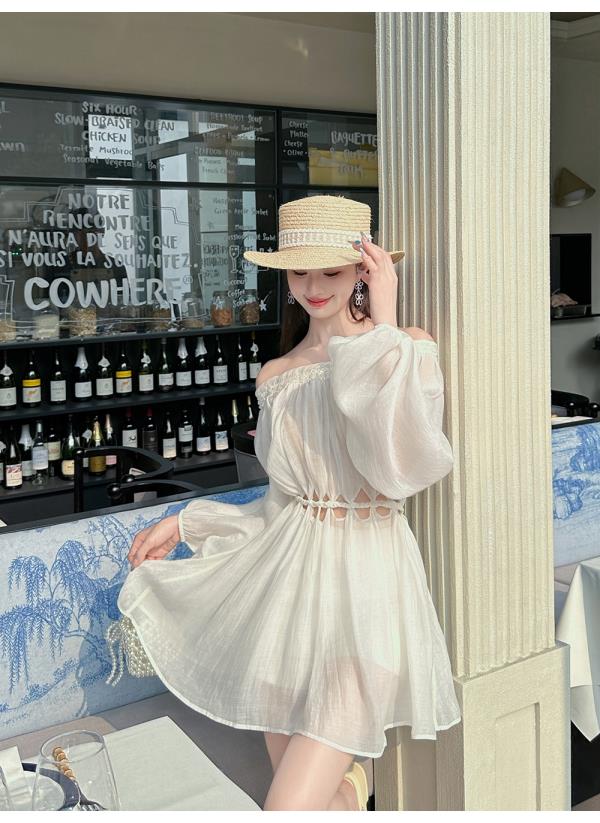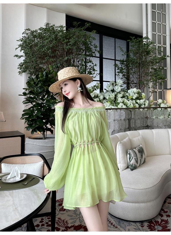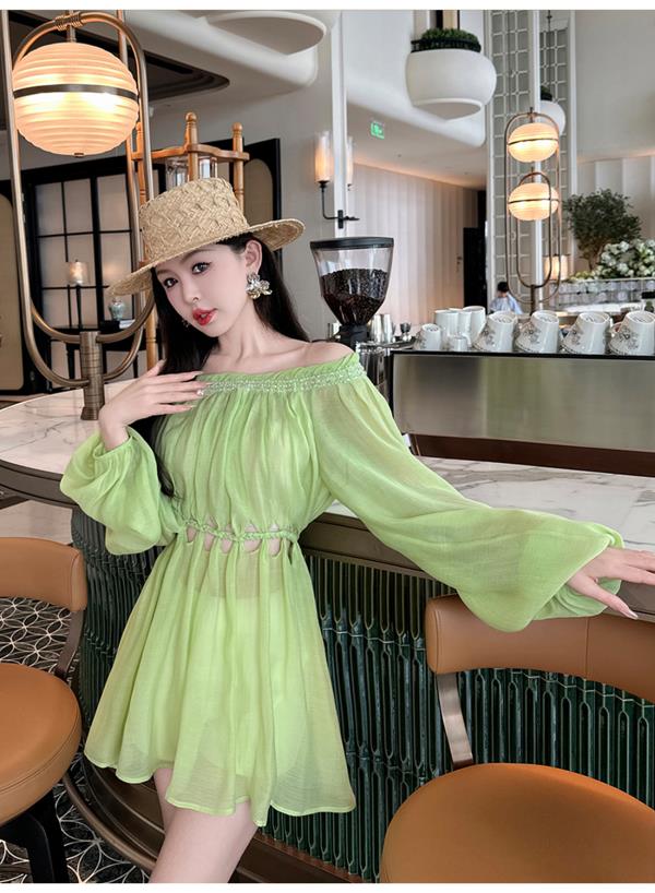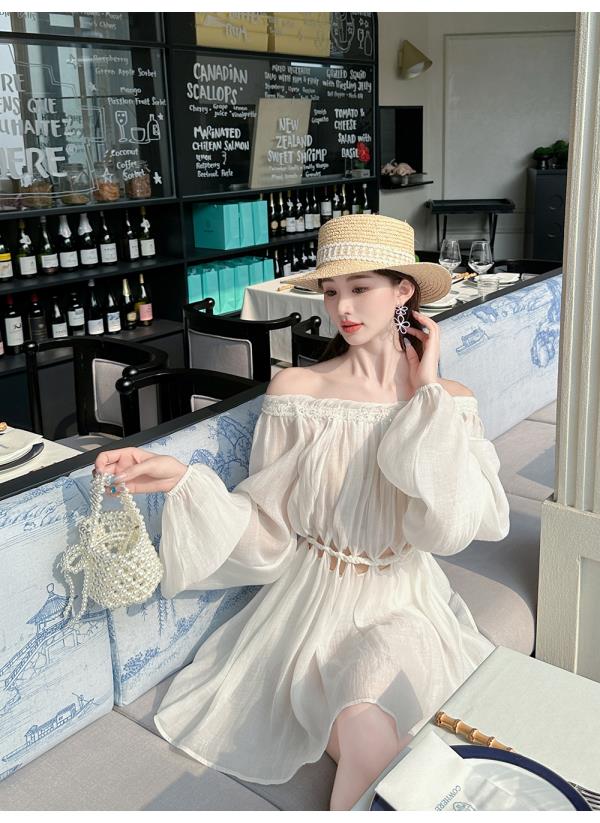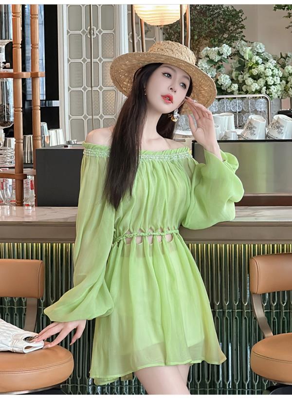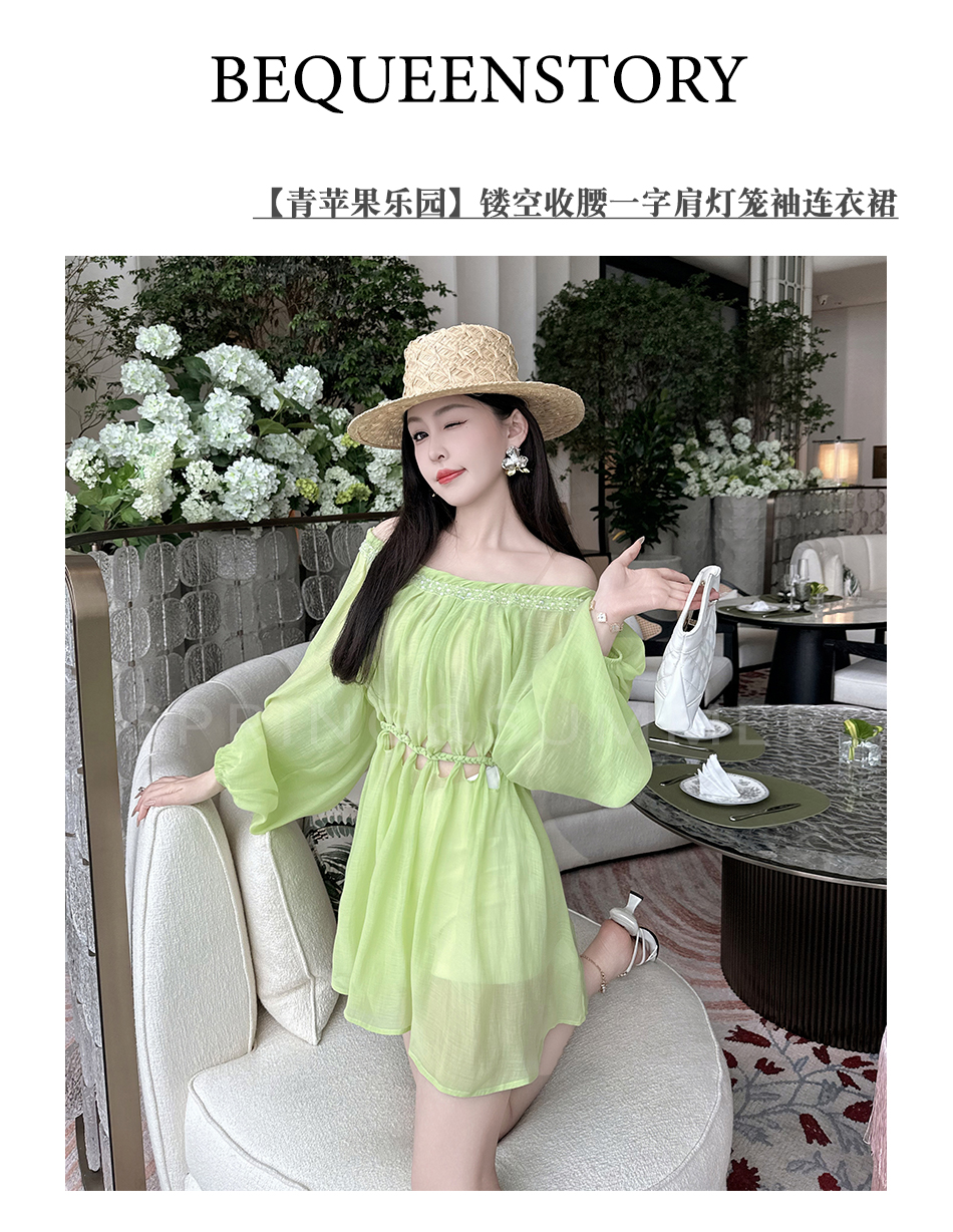 BeQueenStory【青苹果乐园】设计感镂空收腰一字肩灯笼袖连衣裙
