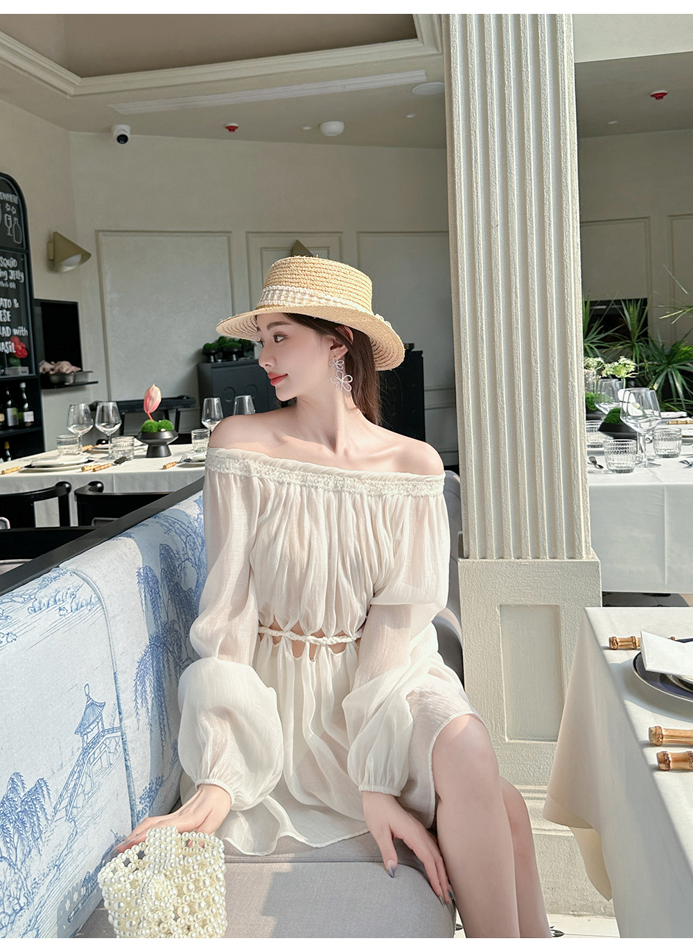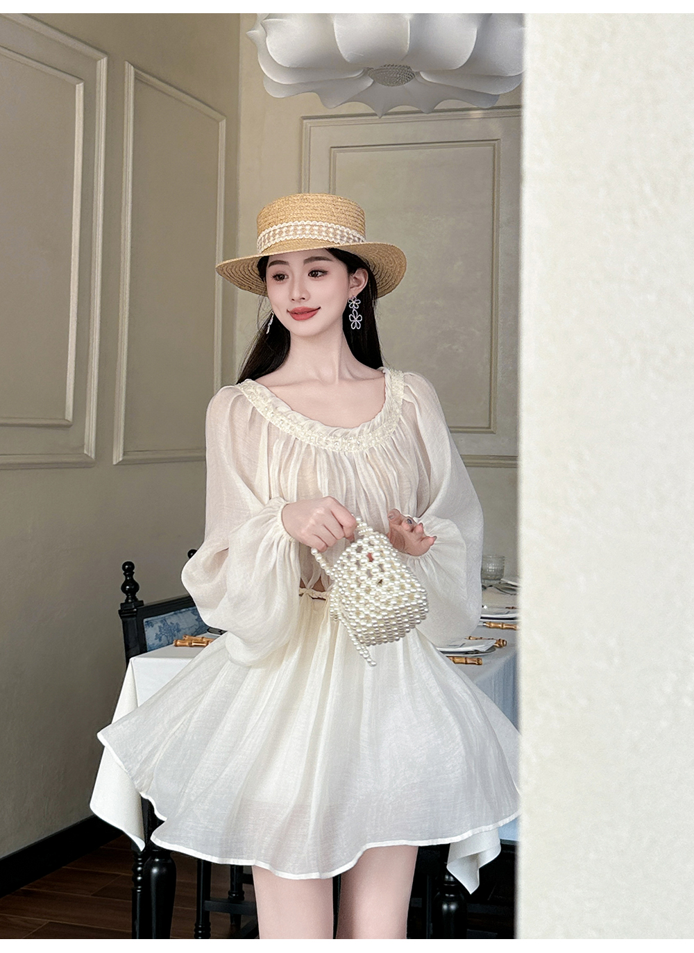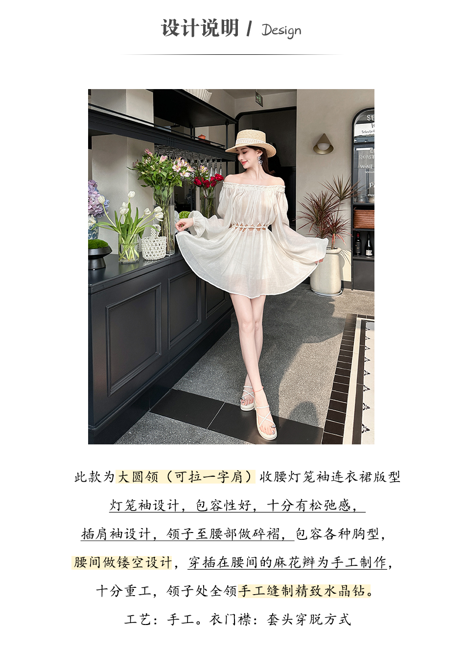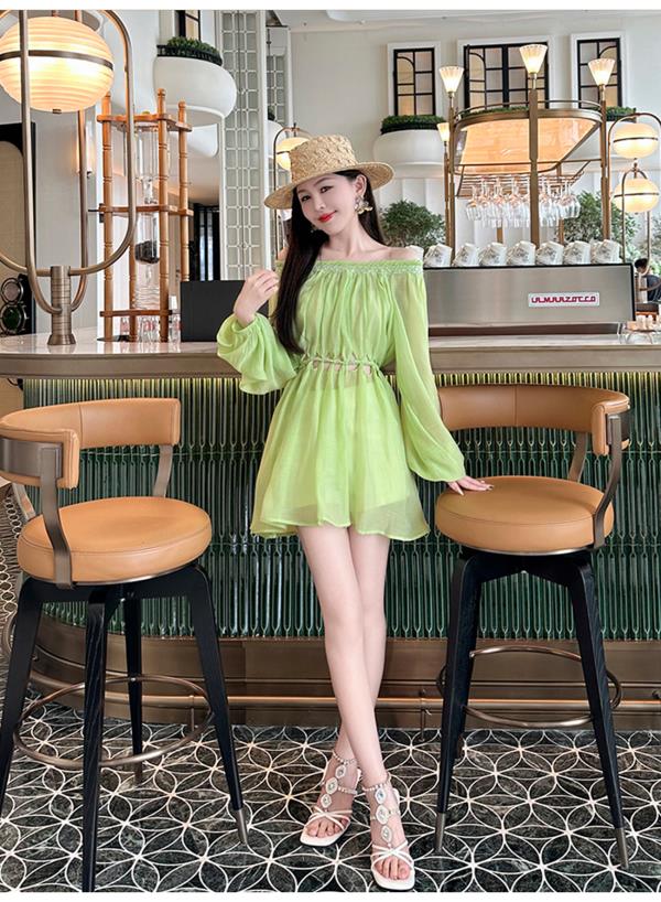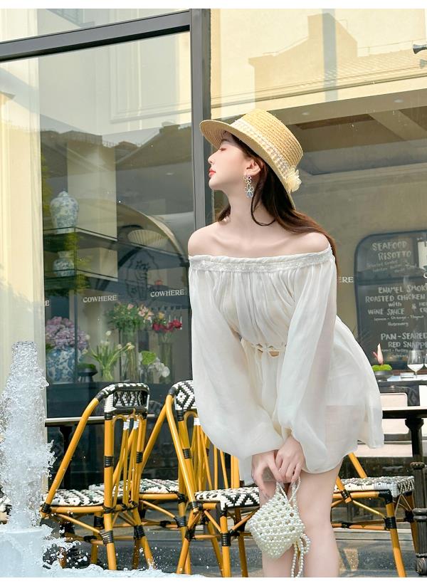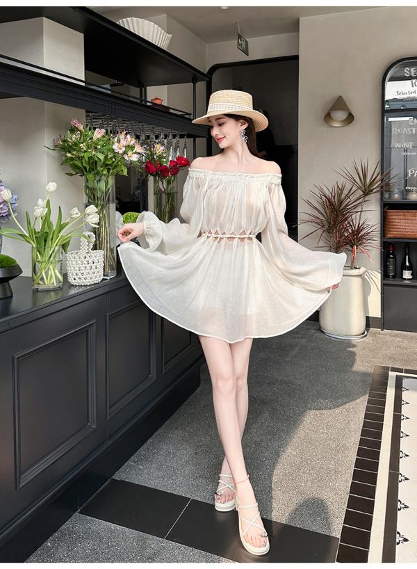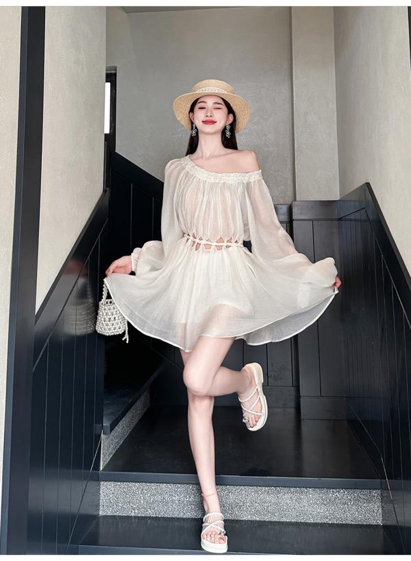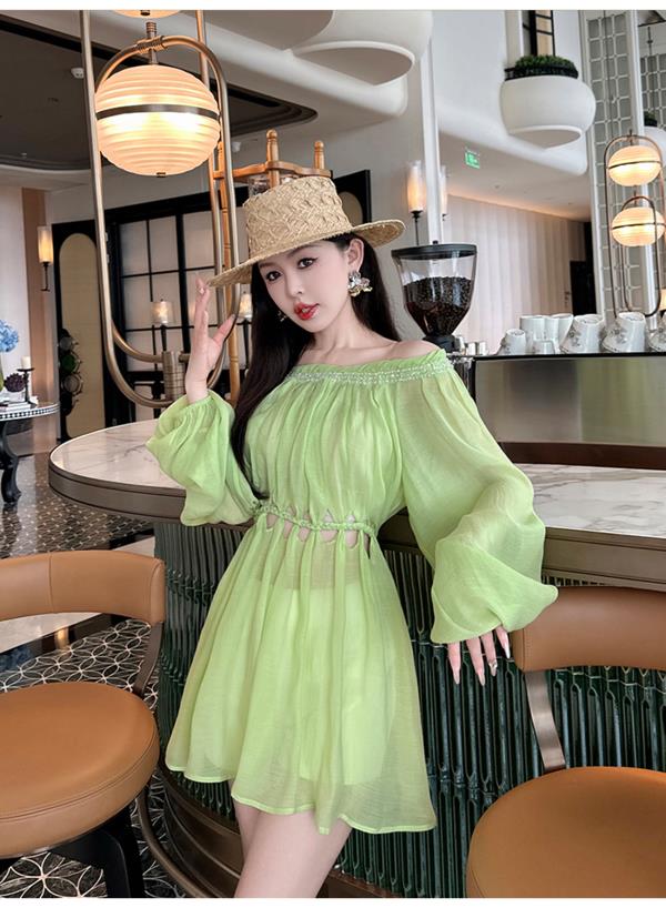 BeQueenStory【青苹果乐园】设计感镂空收腰一字肩灯笼袖连衣裙