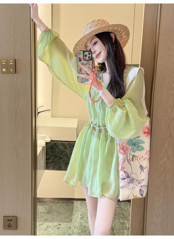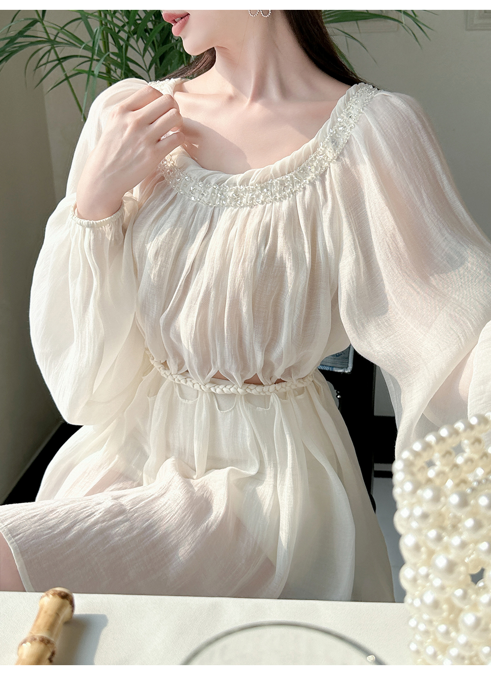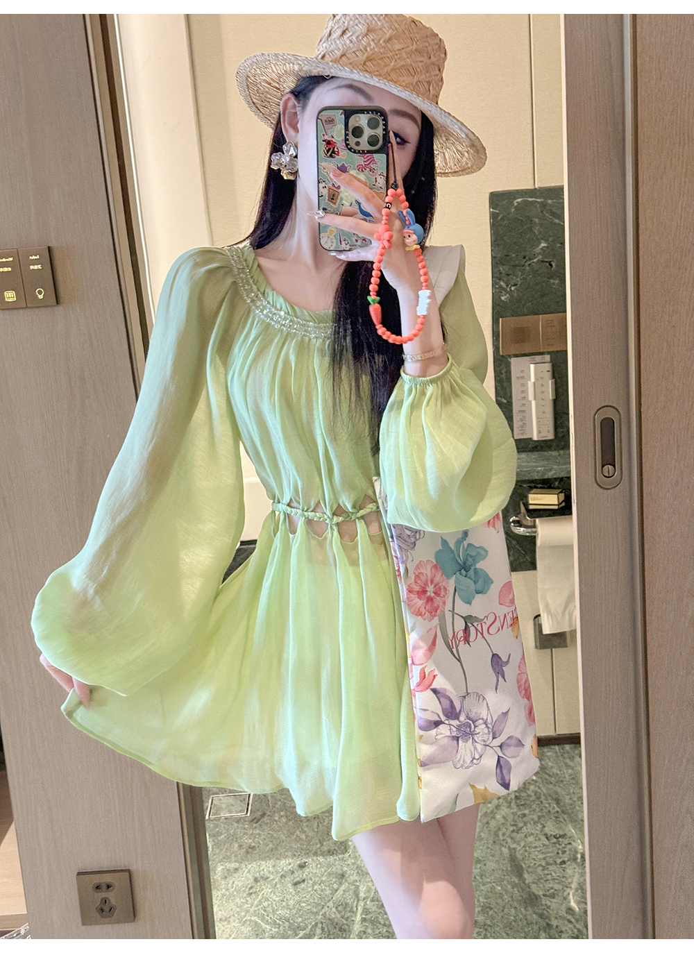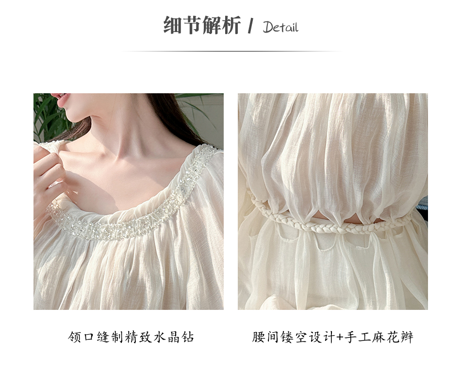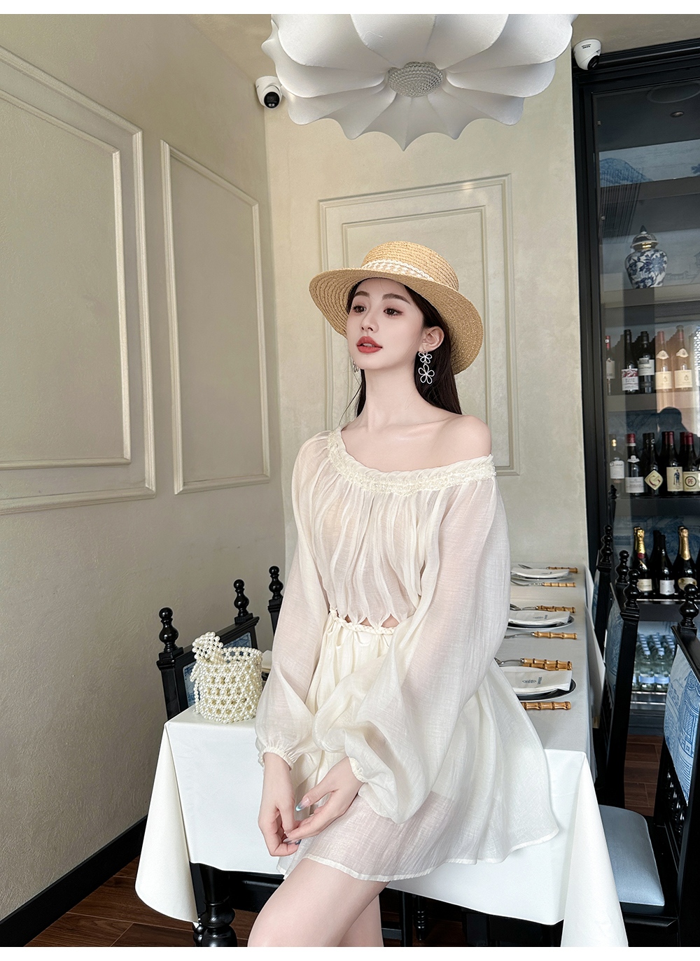 BeQueenStory【青苹果乐园】设计感镂空收腰一字肩灯笼袖连衣裙
