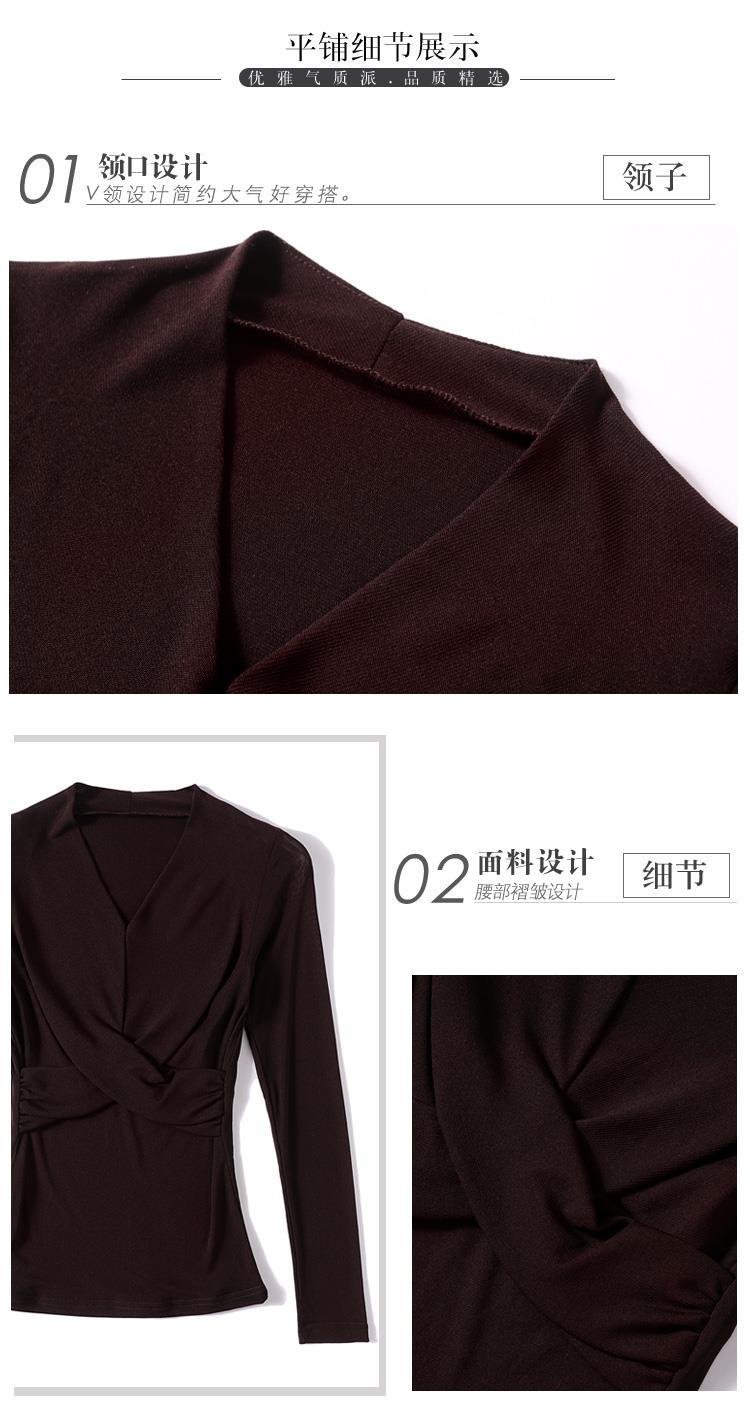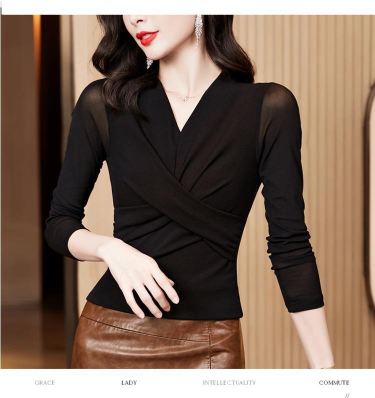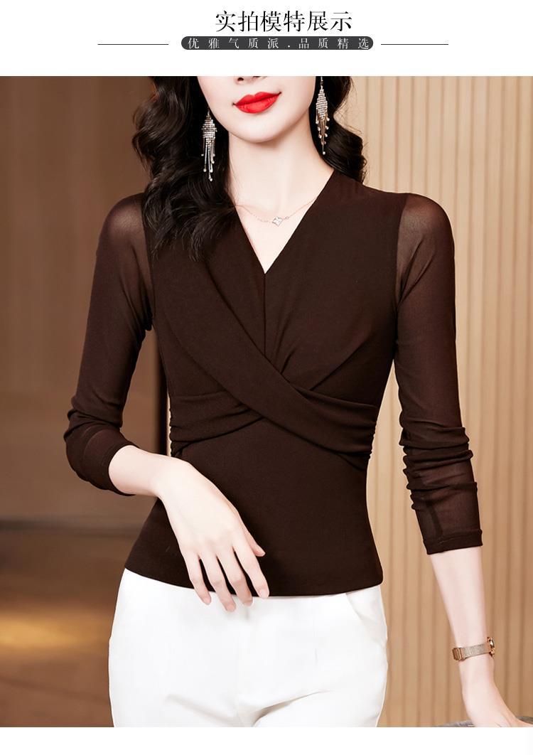 洋气时尚百搭V领长袖,纯色气质网纱打底衫KQL-M2381