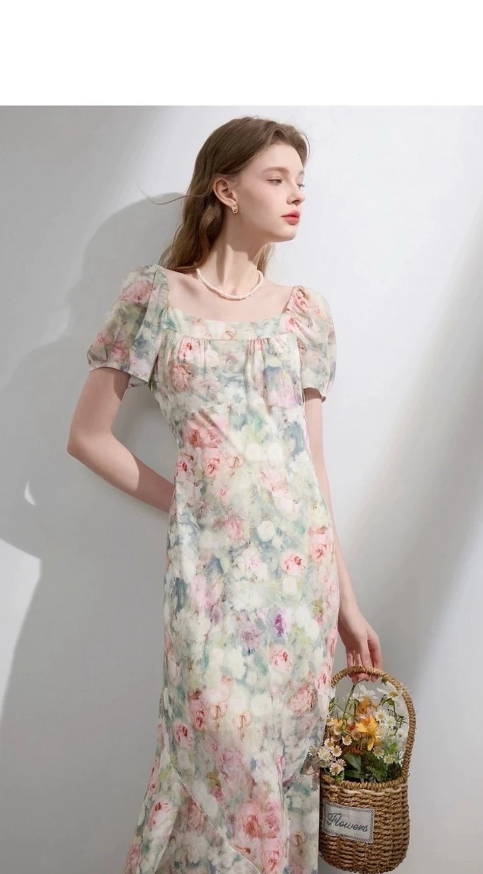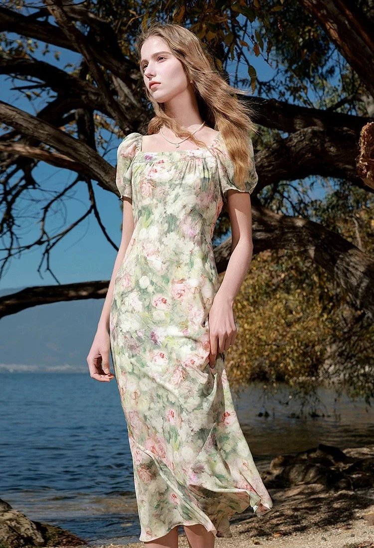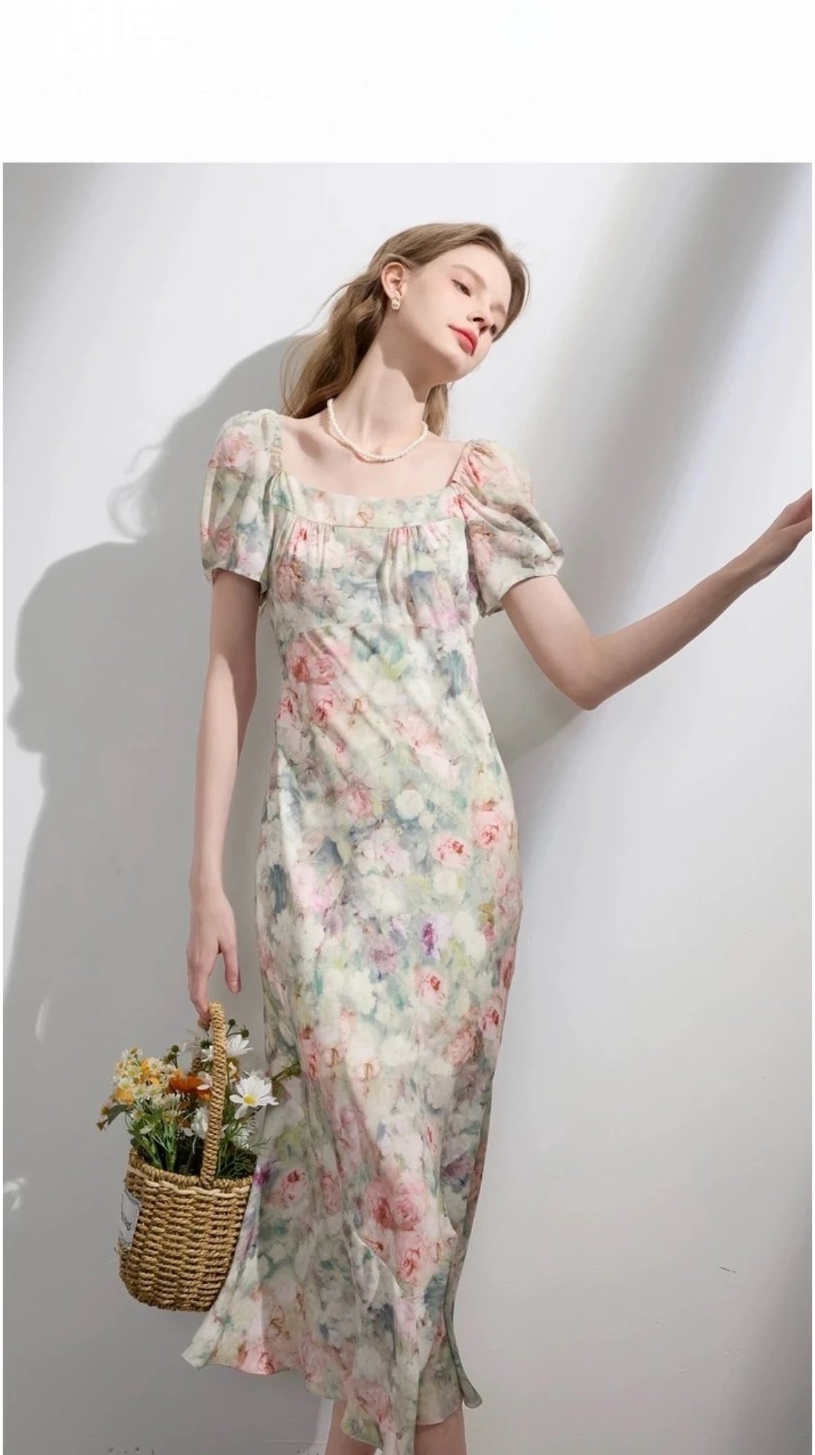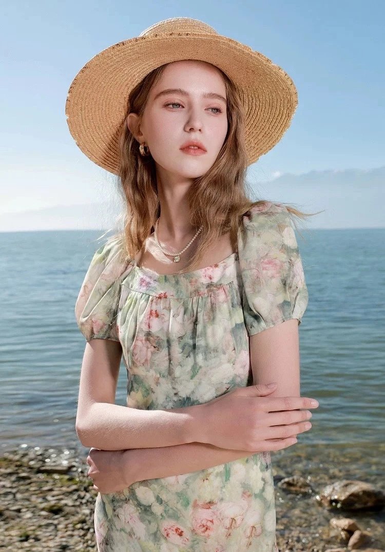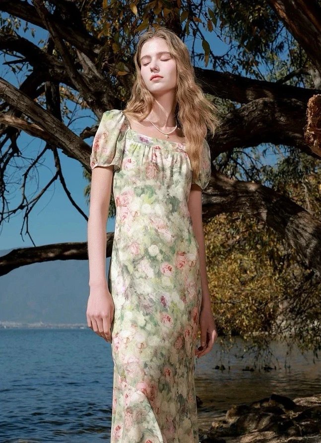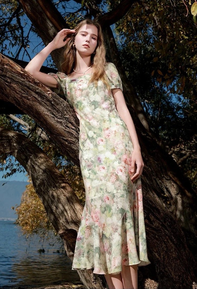 瞧这裙子上的花卉图案,色彩柔和、笔触朦胧