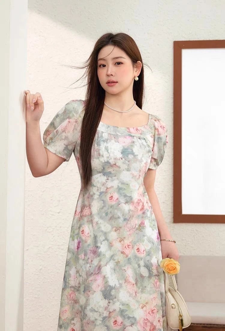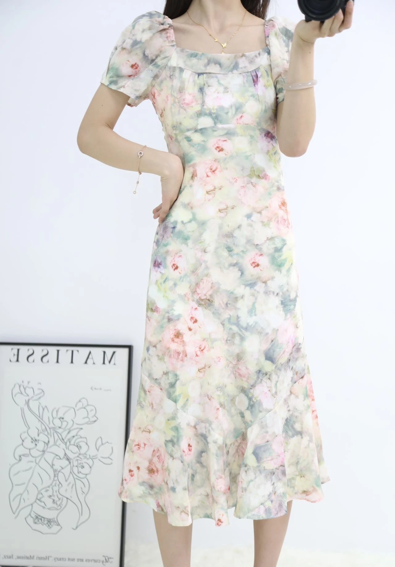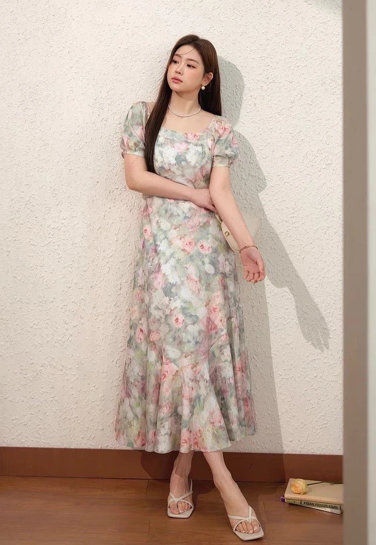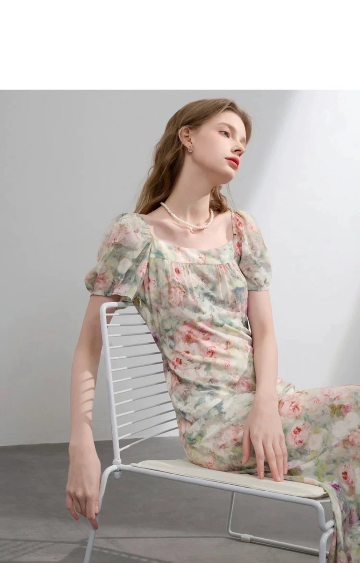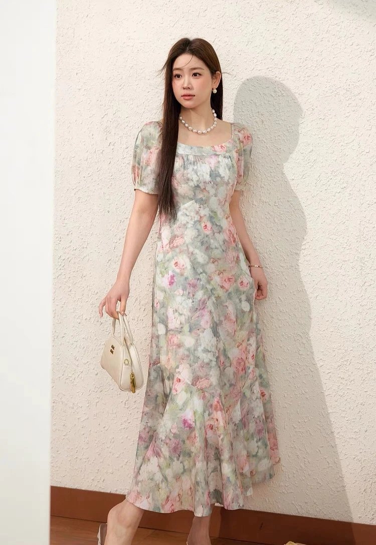 瞧这裙子上的花卉图案,色彩柔和、笔触朦胧