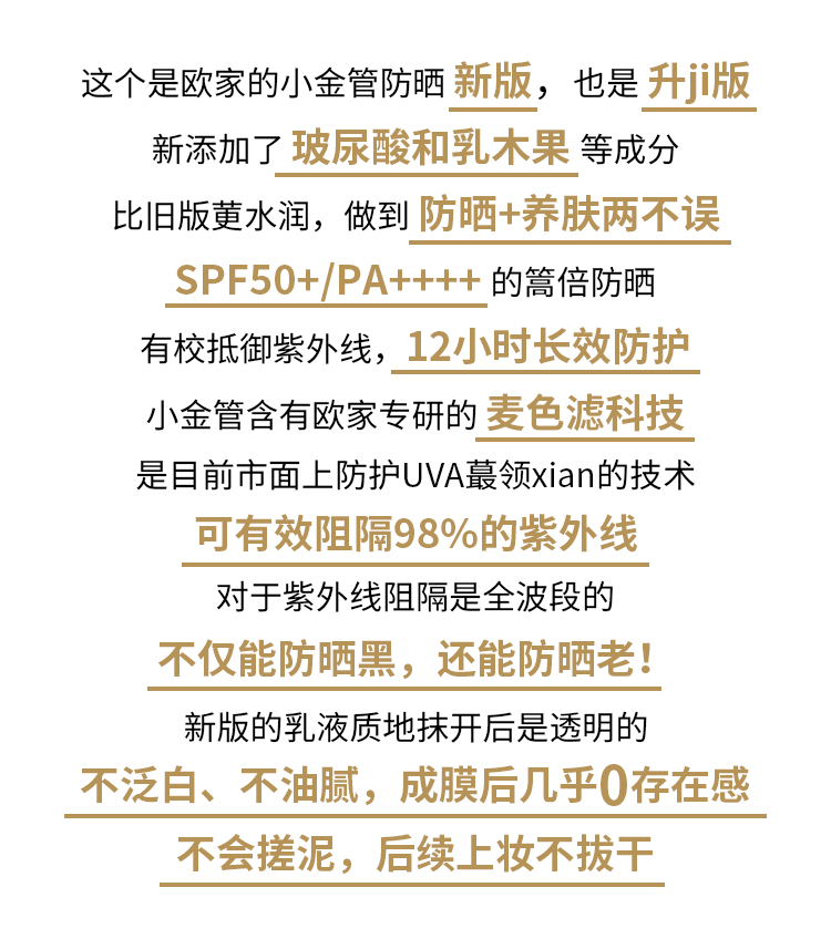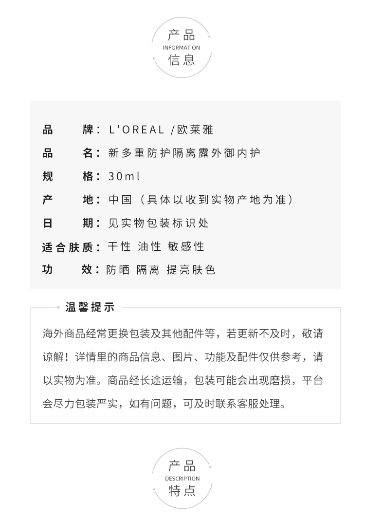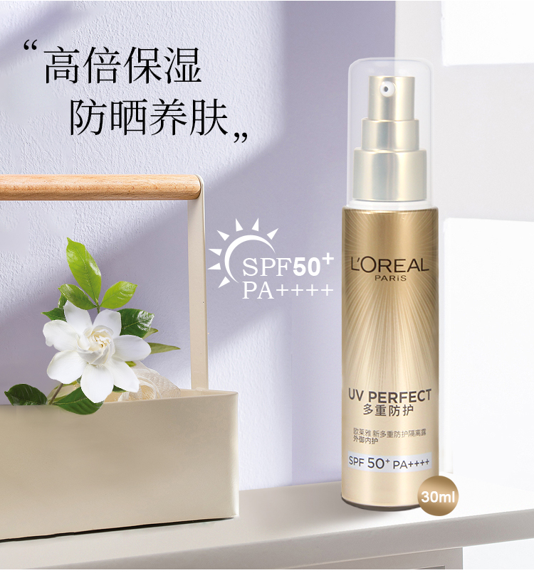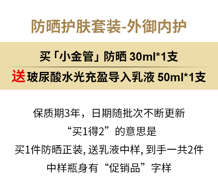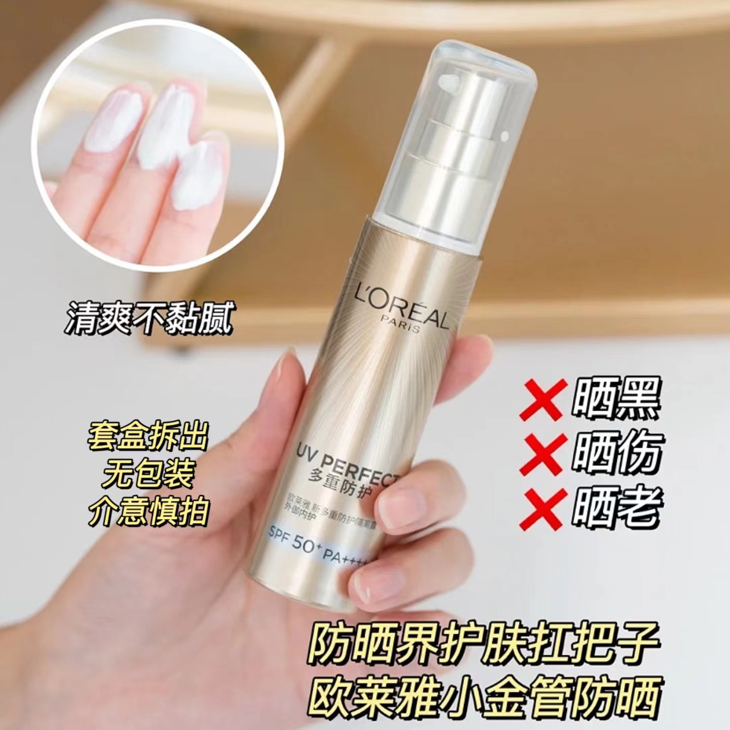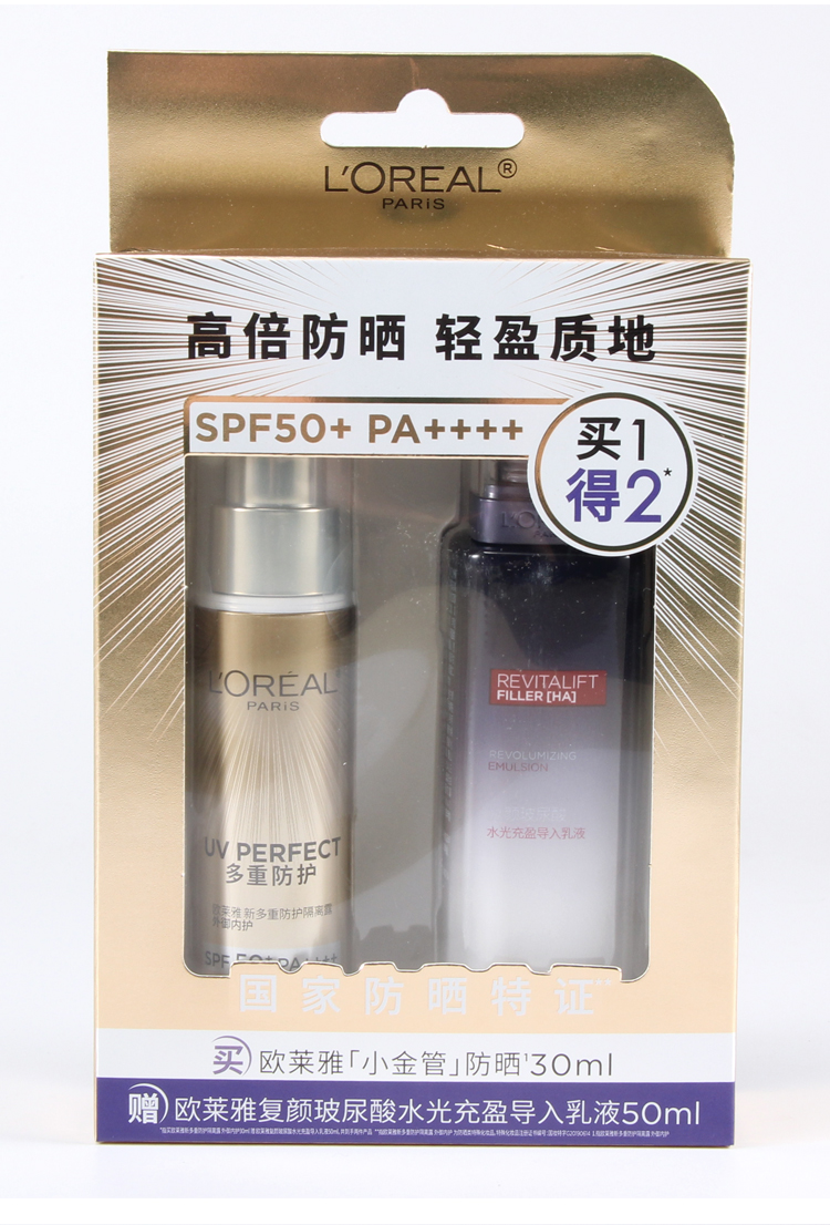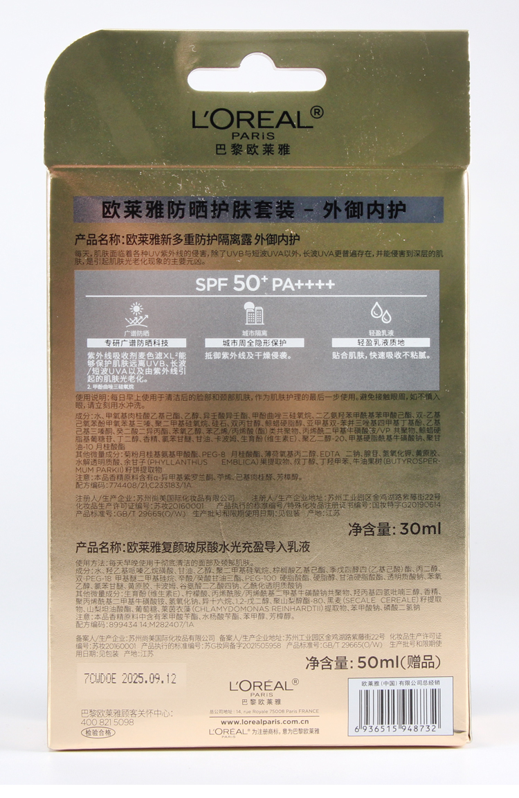 (买一得二)欧莱雅小金管防晒霜 多重防护隔离露外御内护30ml+注乳液50ml 女士男士SPF50防紫外线面部套装