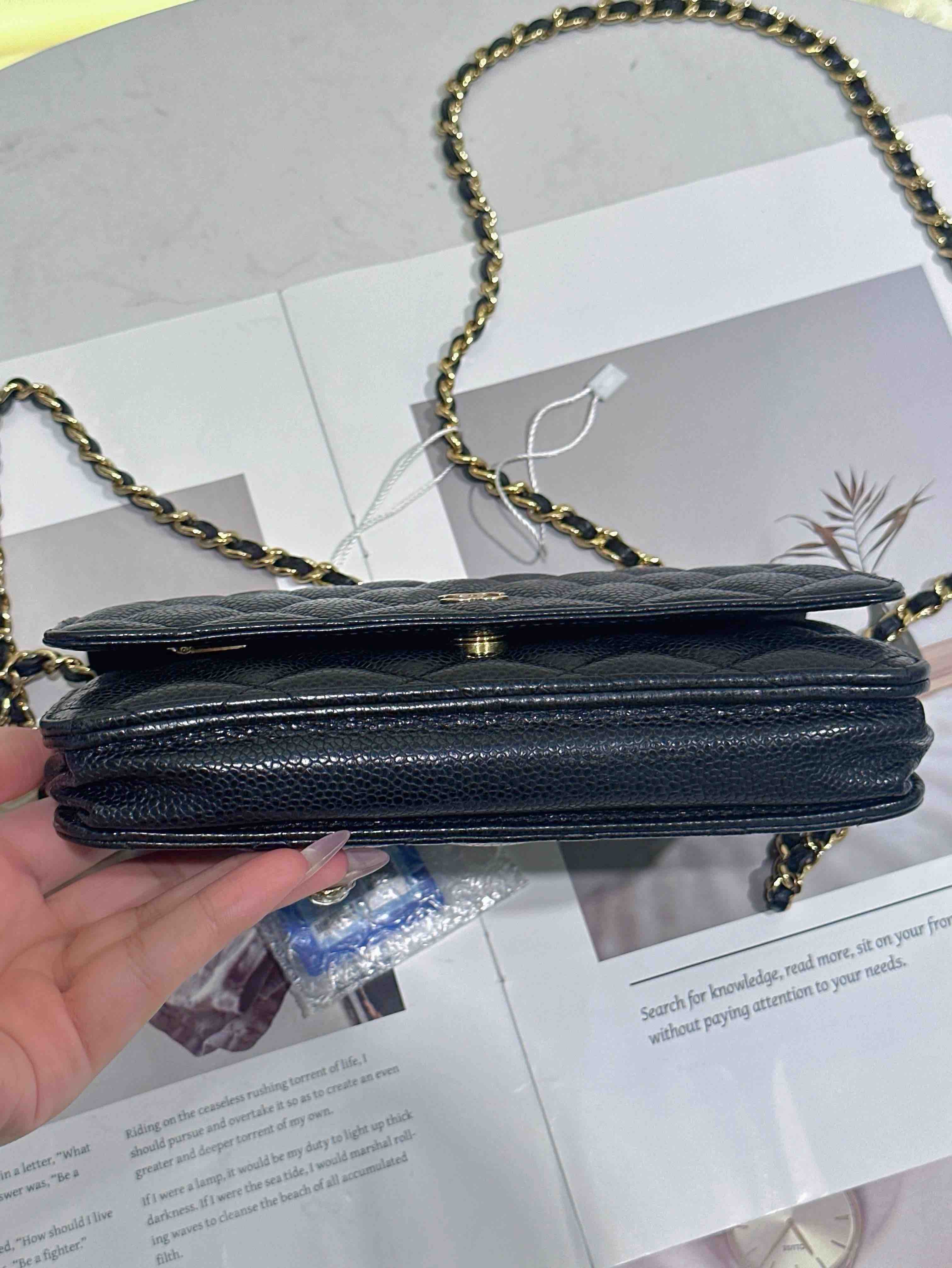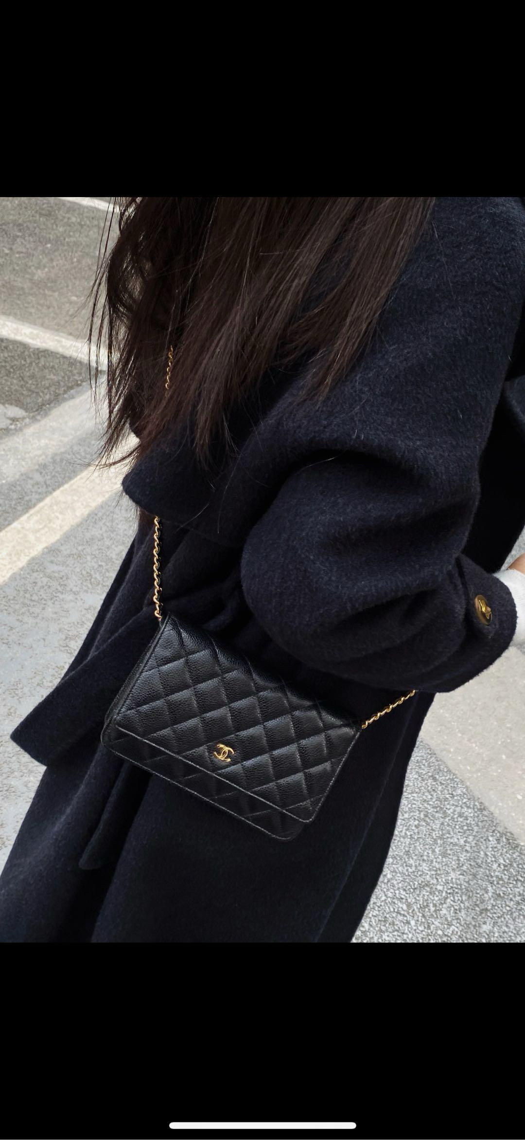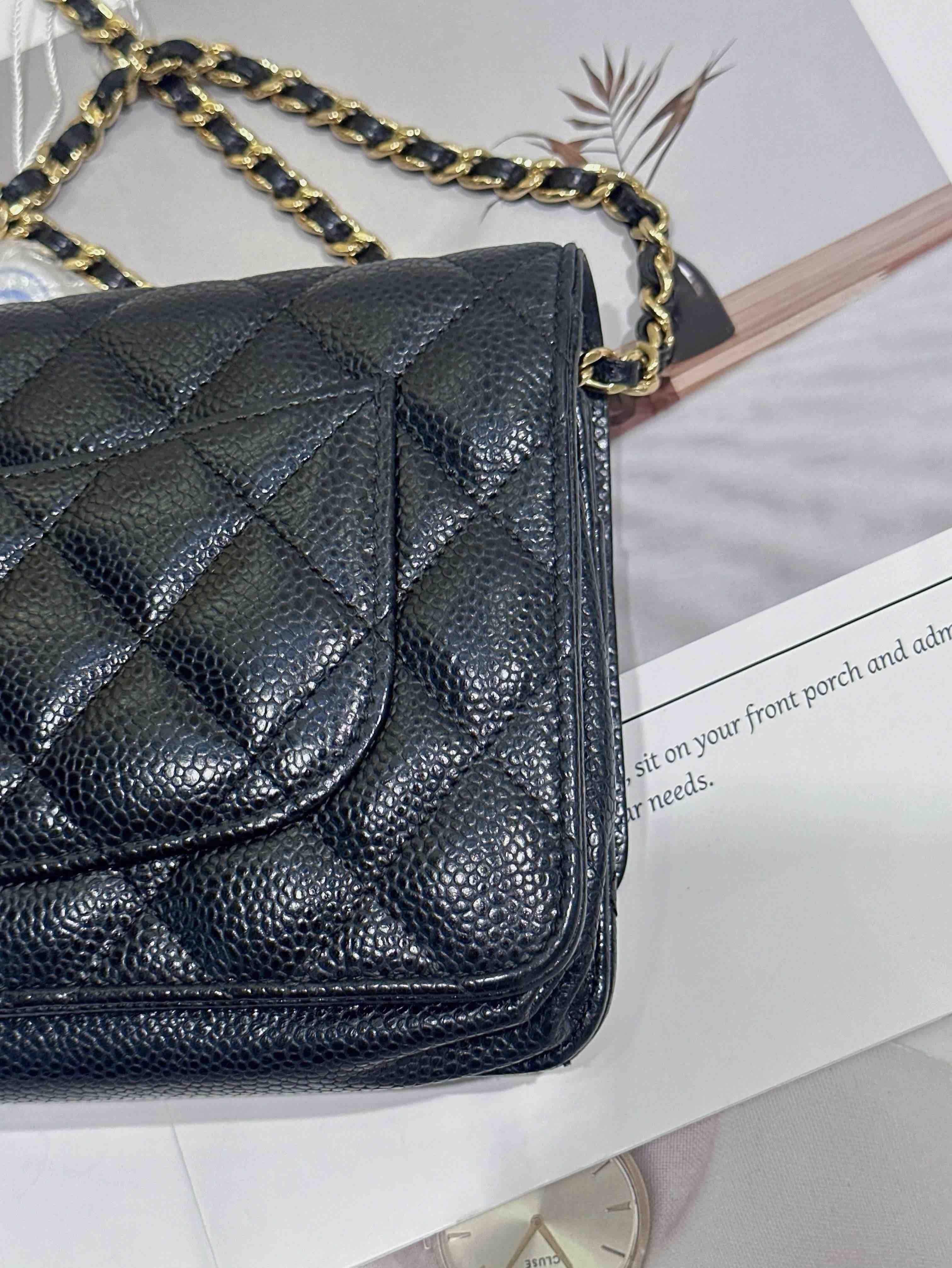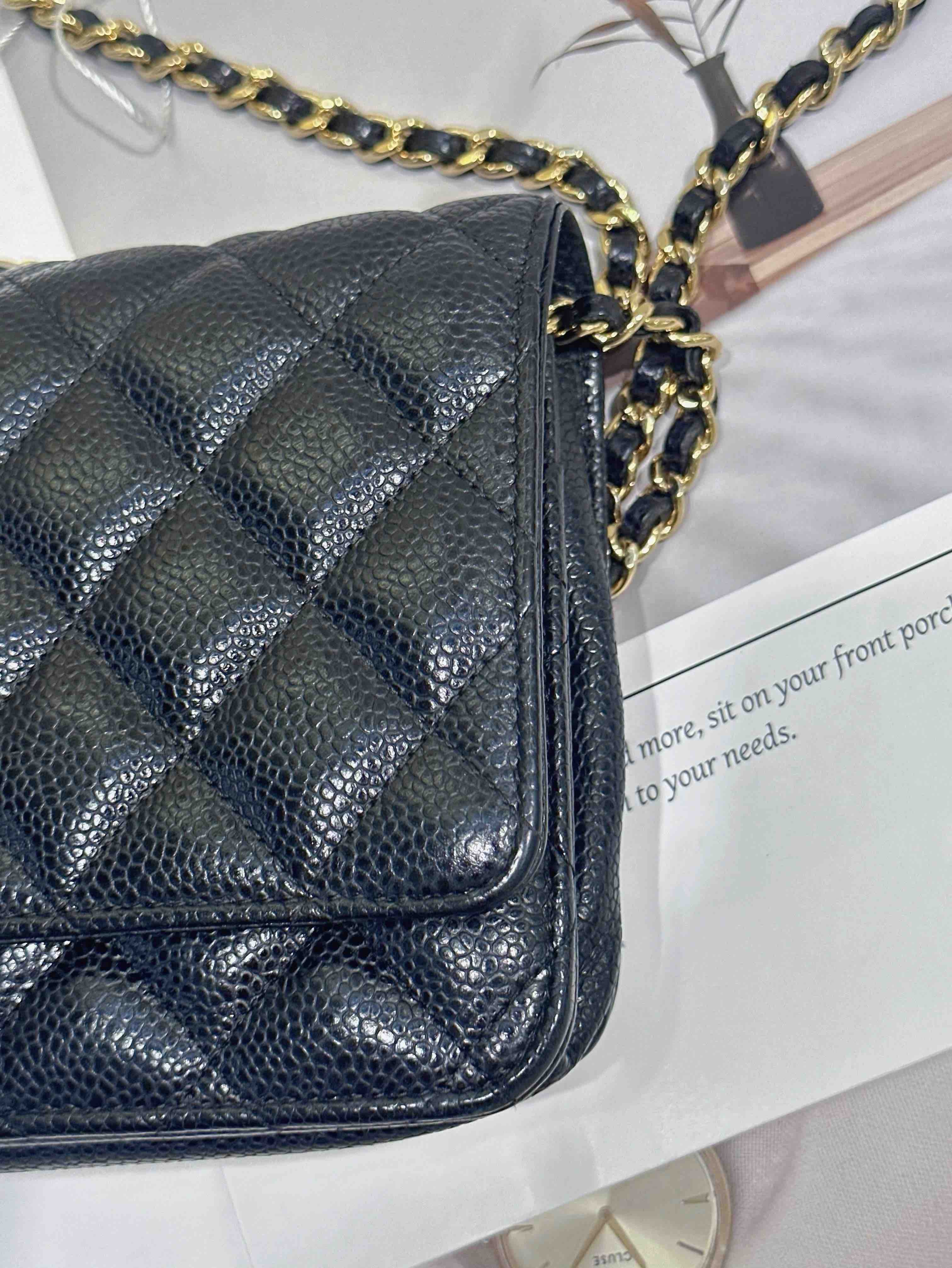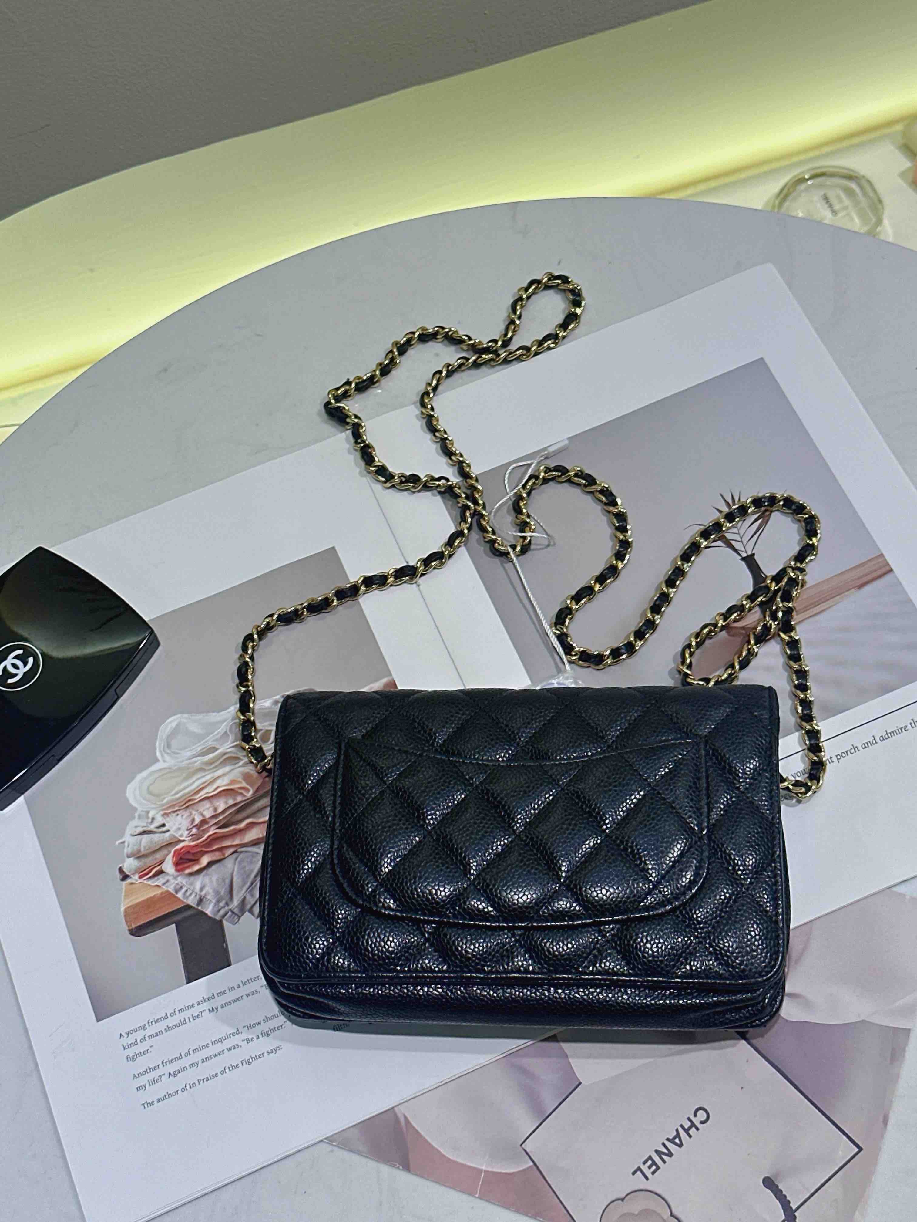 【商品詳情】正品二手 Chanel 黑金 荔枝纹牛皮 woc 链条包🌠 95新 19*13 镭射29开。包型有正常使用感 logo五金和包角有轻微使用摩擦感。经典不过时