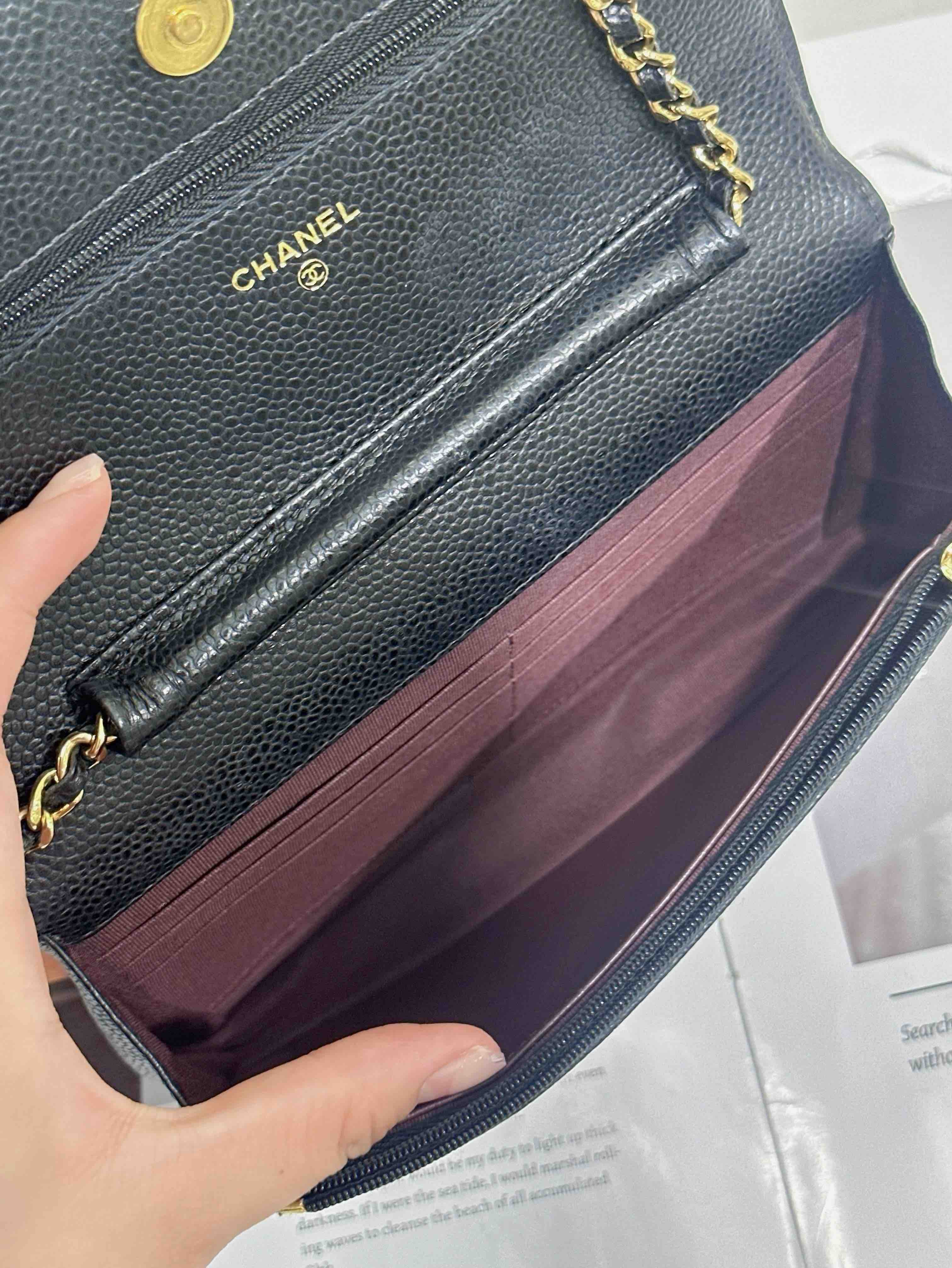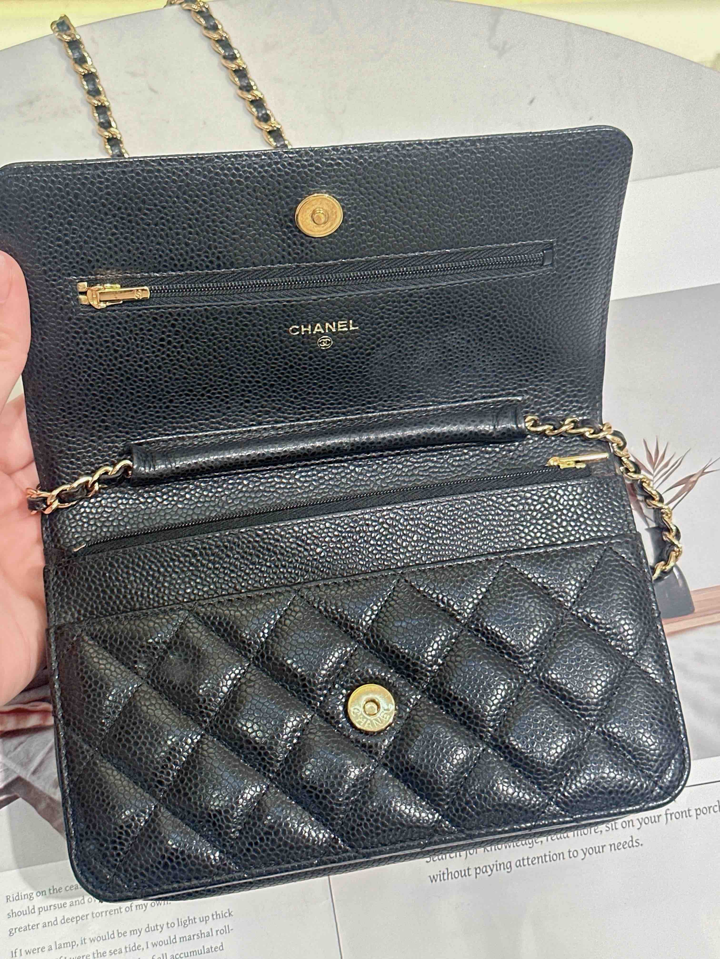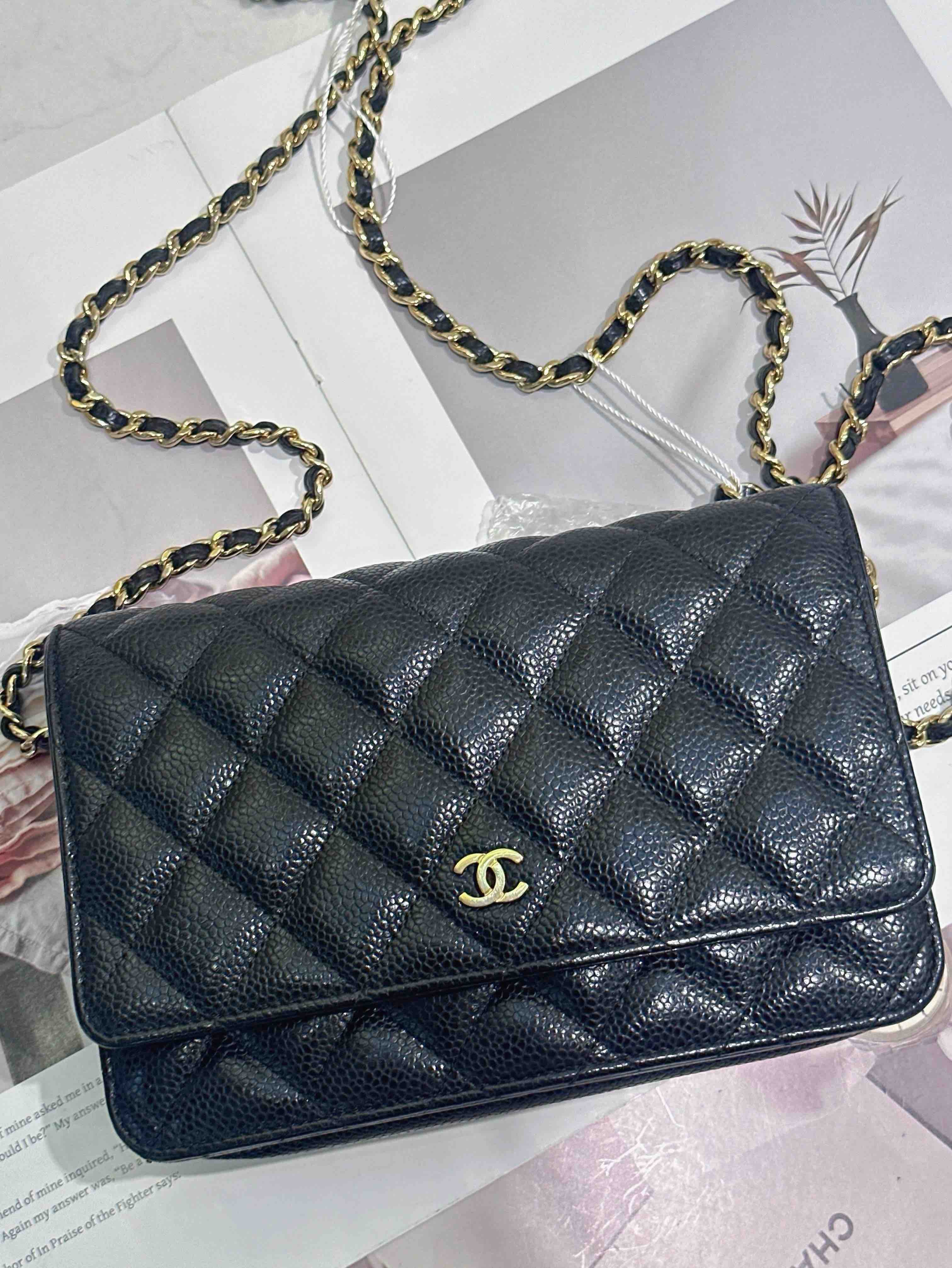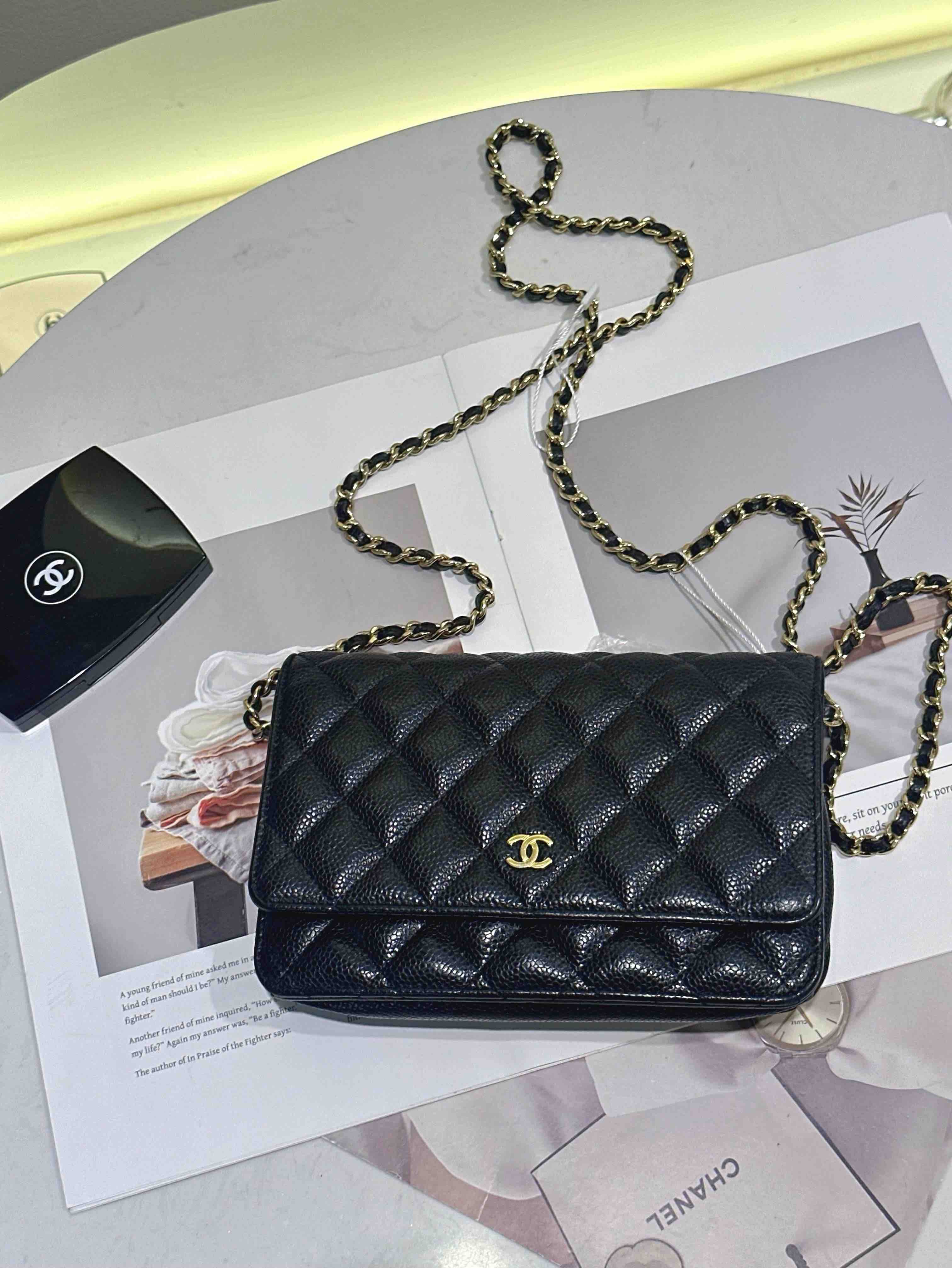 【商品詳情】正品二手 Chanel 黑金 荔枝纹牛皮 woc 链条包🌠 95新 19*13 镭射29开。包型有正常使用感 logo五金和包角有轻微使用摩擦感。经典不过时