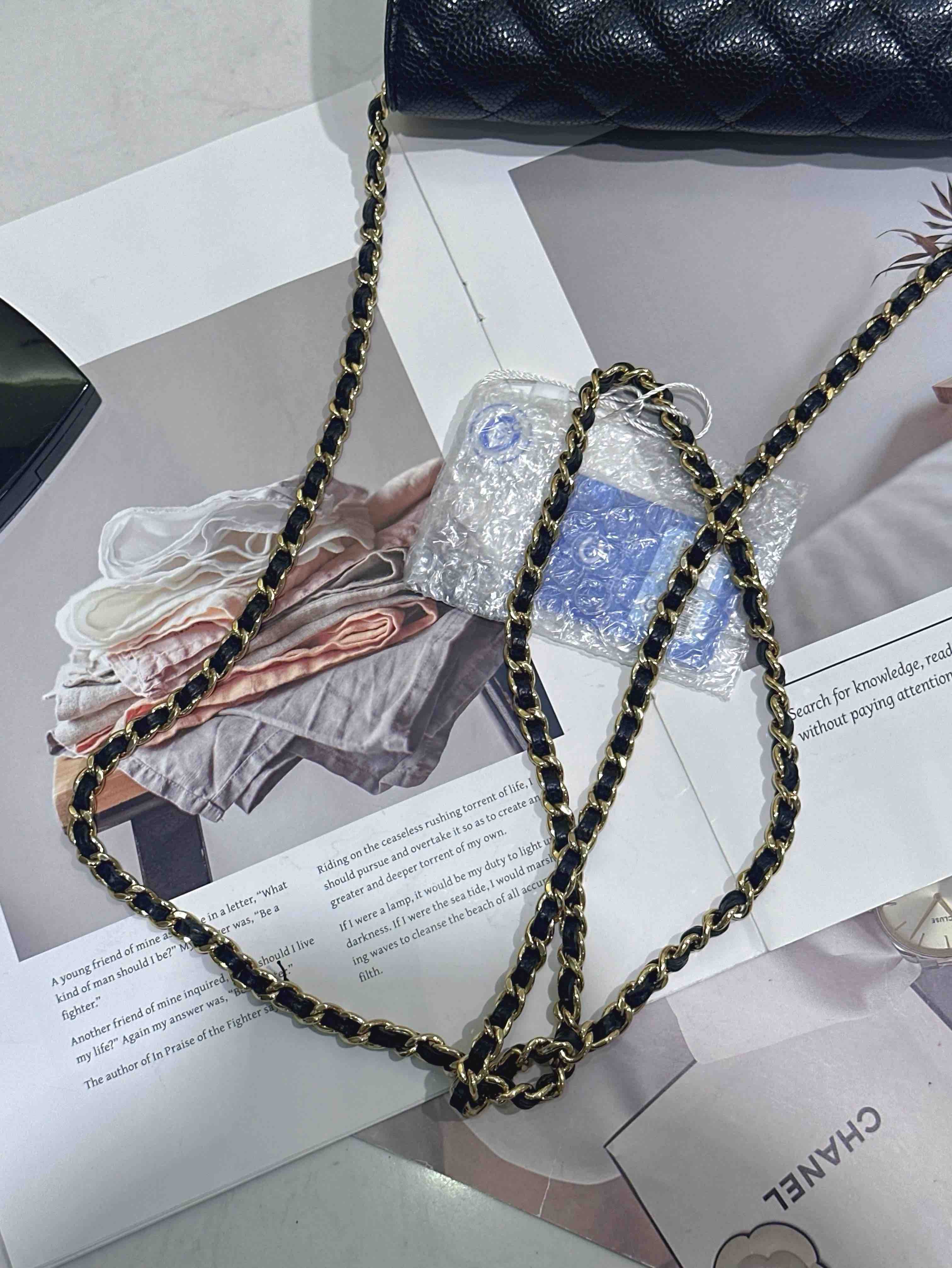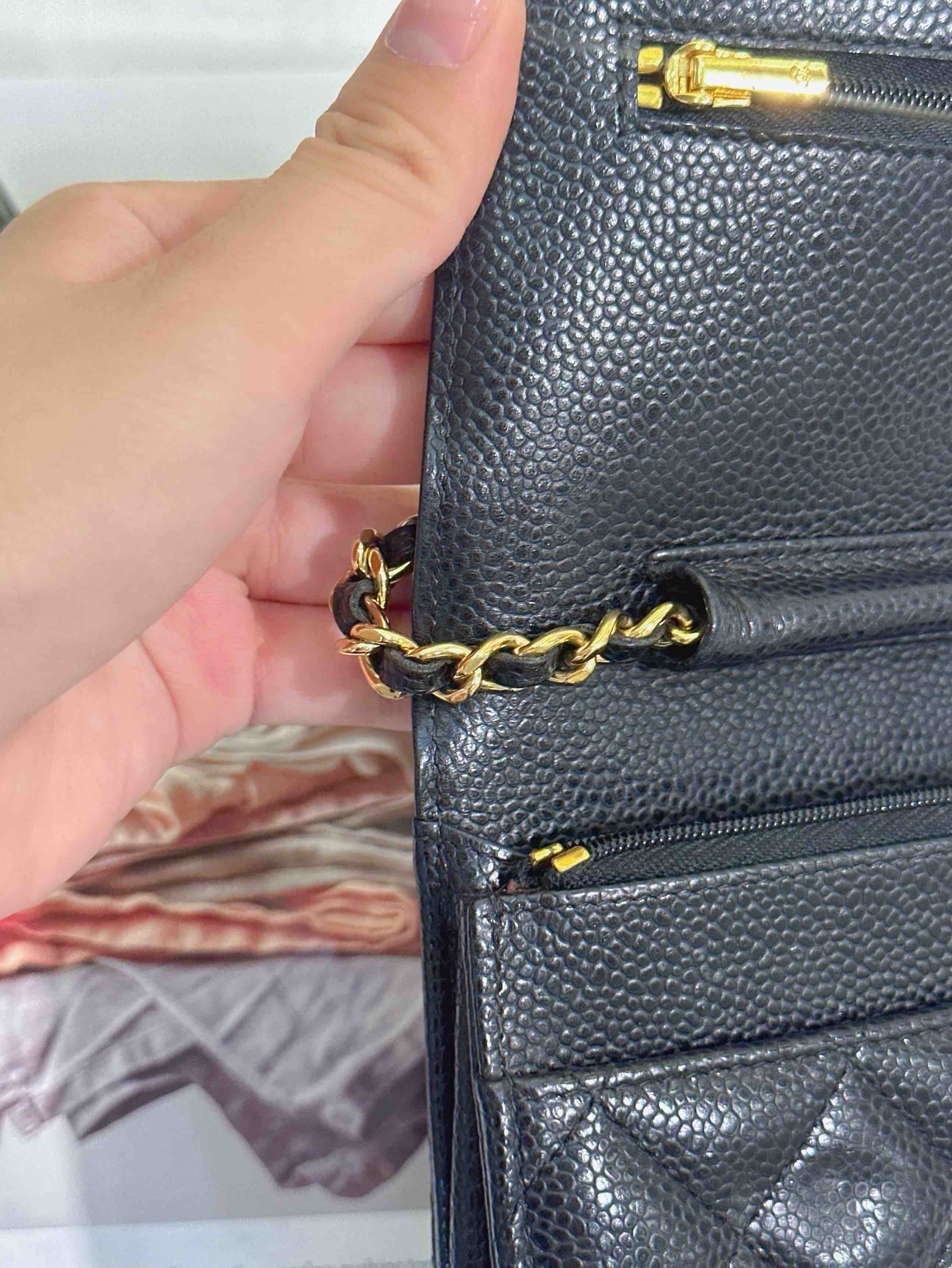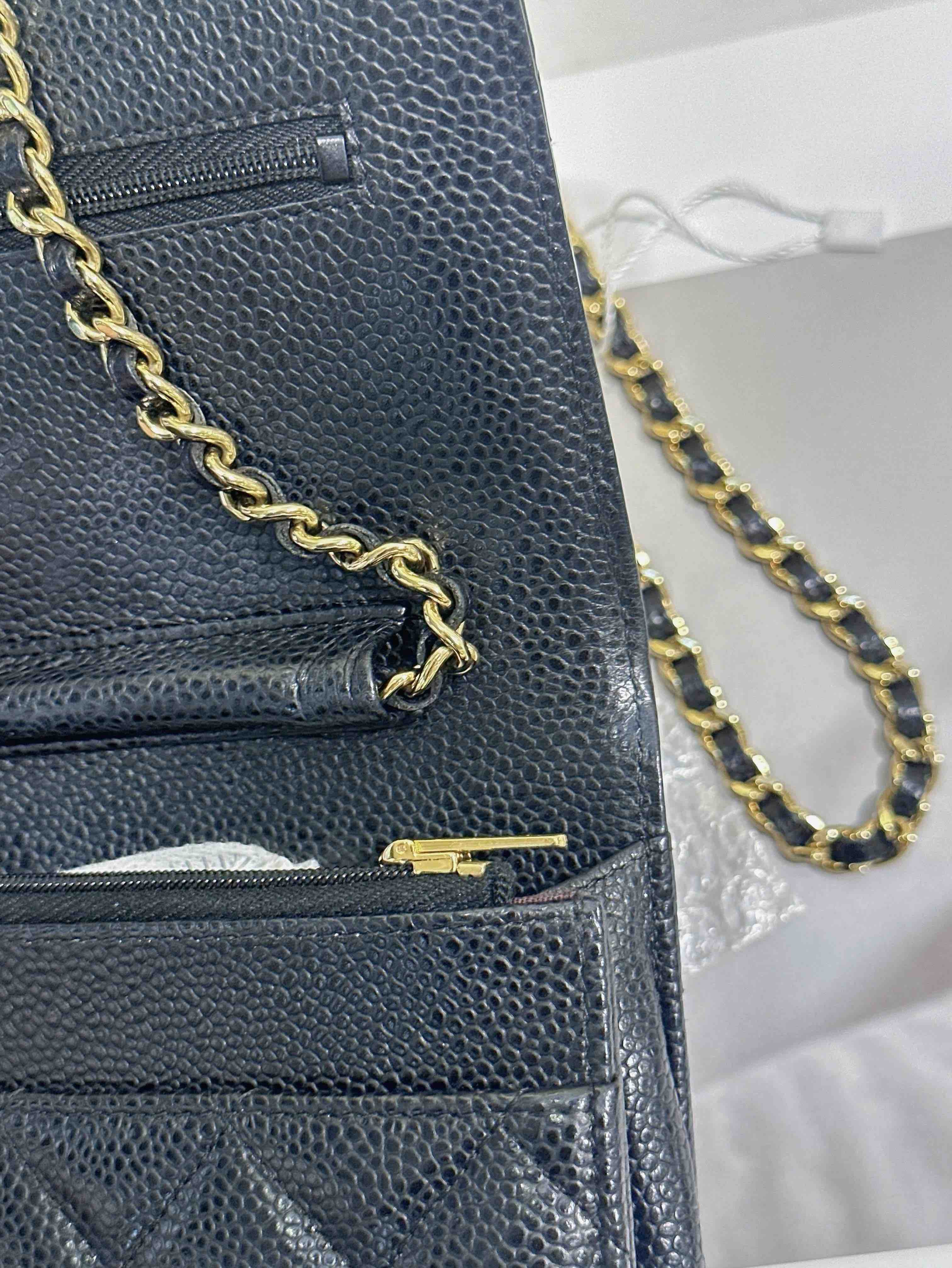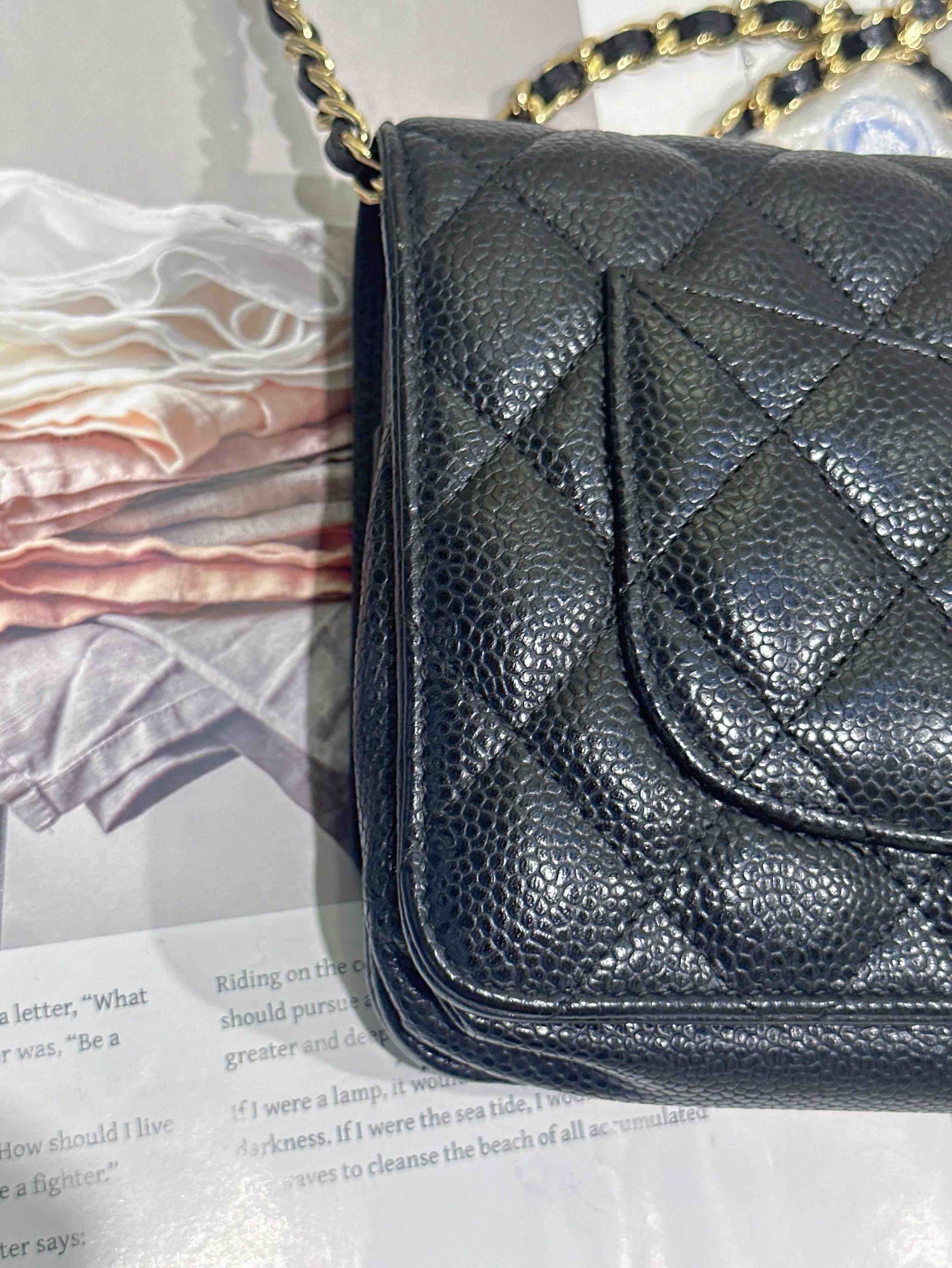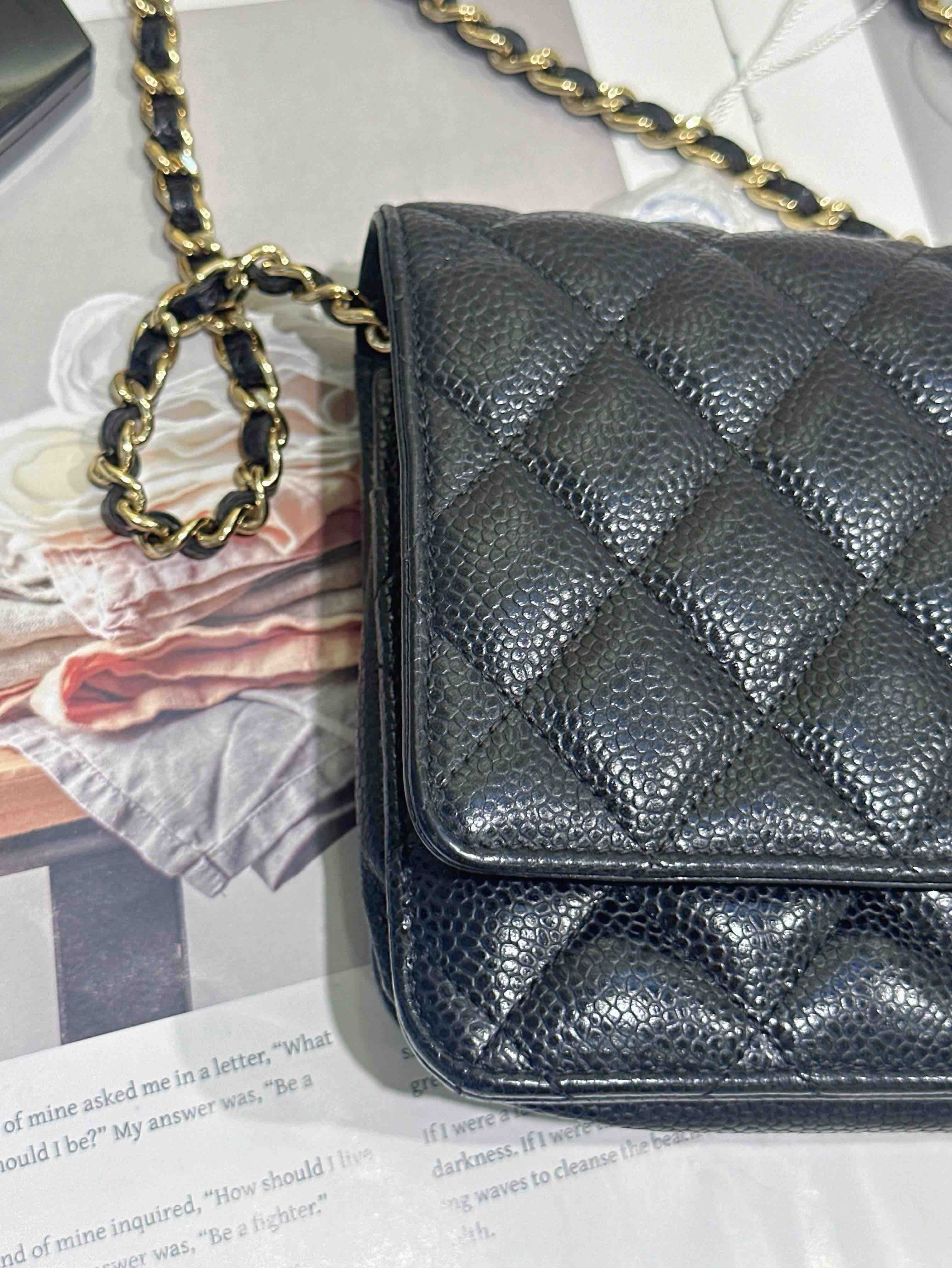 【商品詳情】正品二手 Chanel 黑金 荔枝纹牛皮 woc 链条包🌠 95新 19*13 镭射29开。包型有正常使用感 logo五金和包角有轻微使用摩擦感。经典不过时