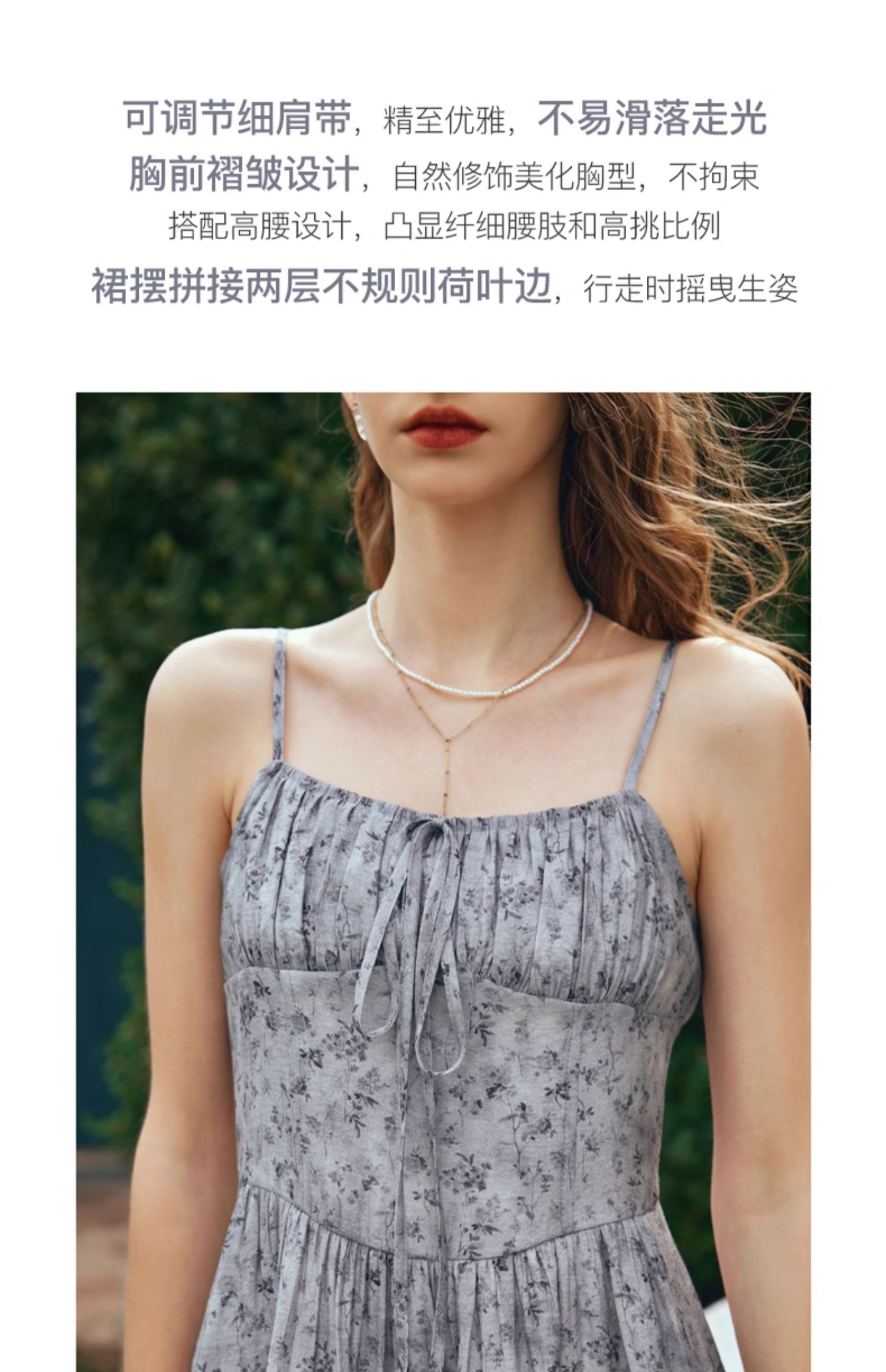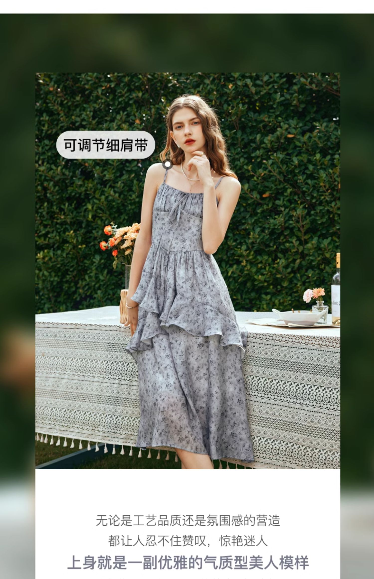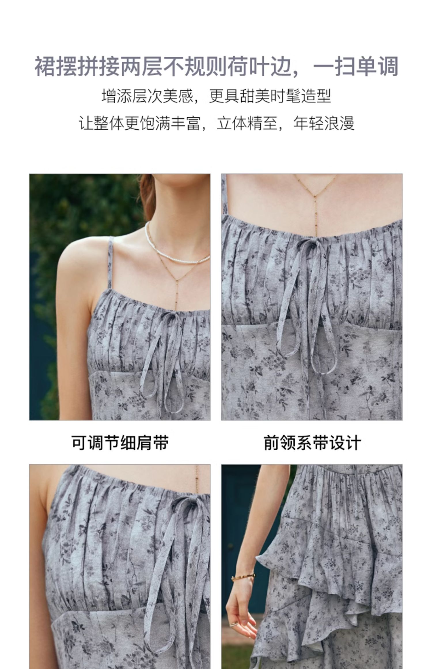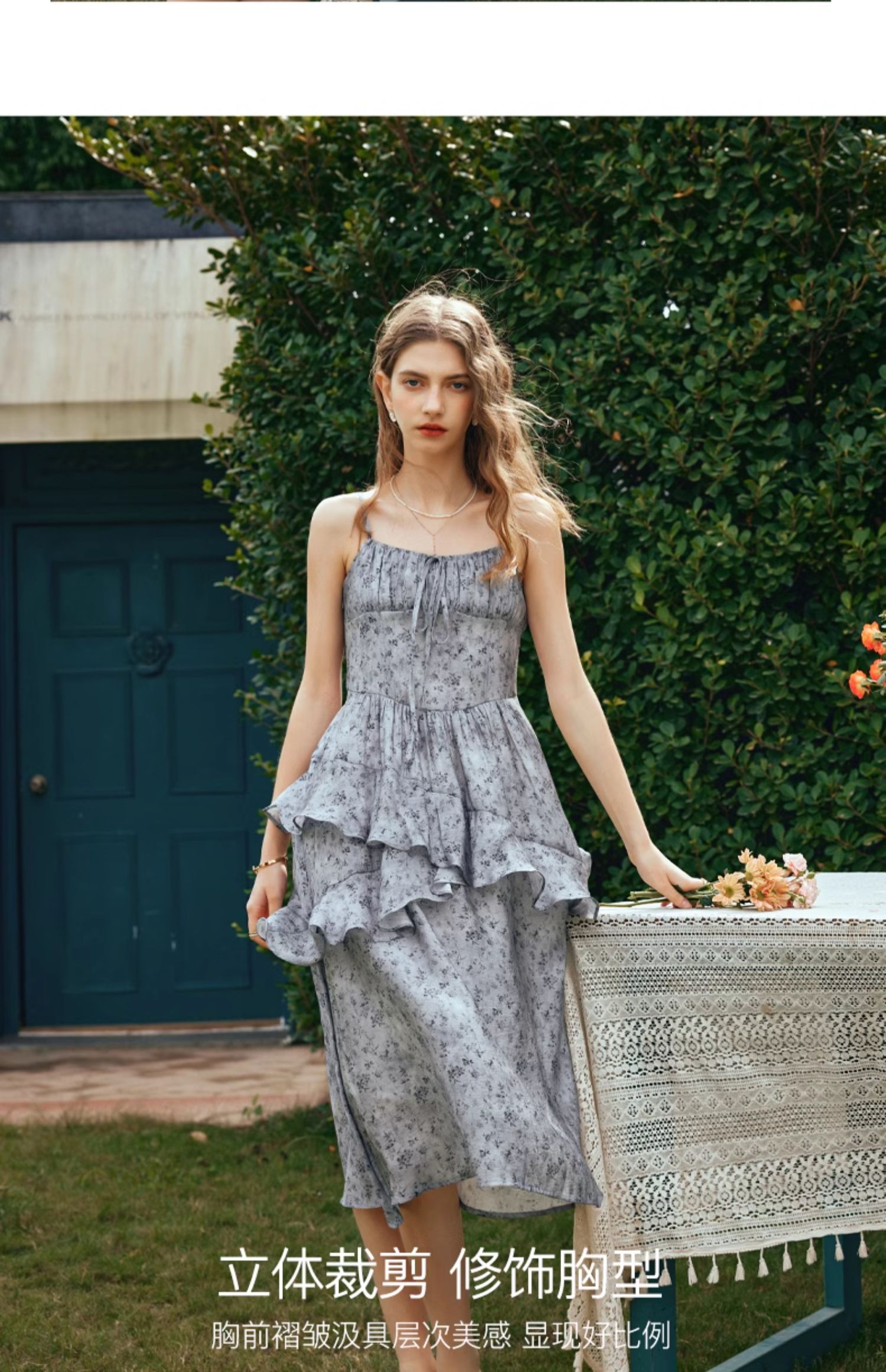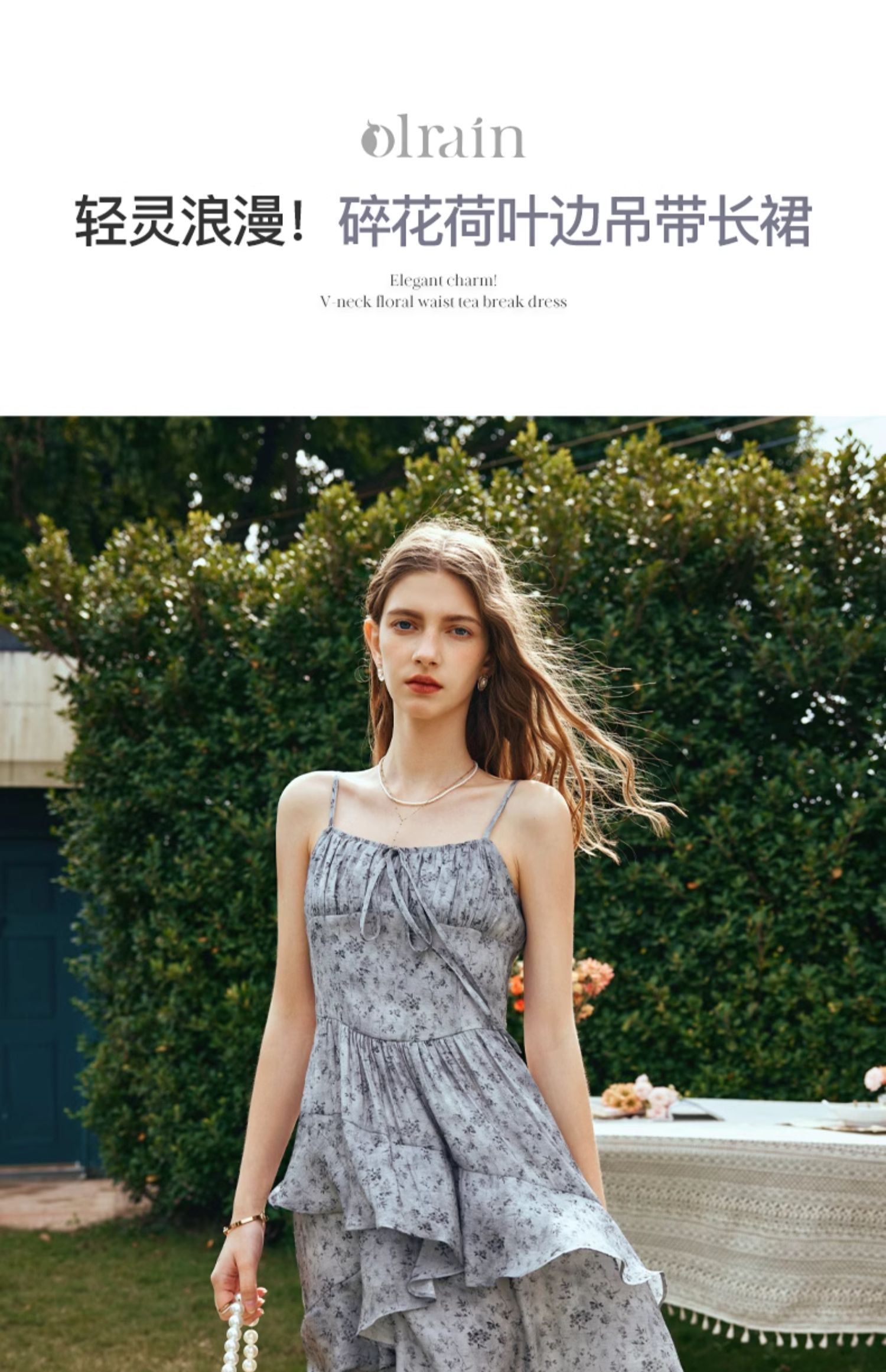 OLrain欧芮儿法式碎花吊带连衣裙女夏季2024年新款拼接荷叶边长裙