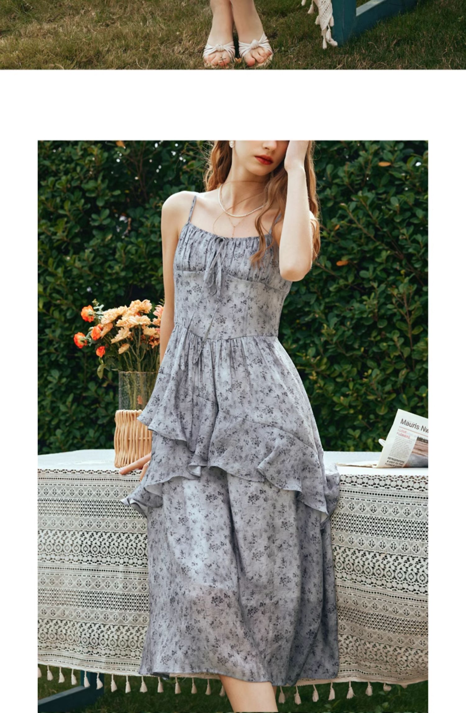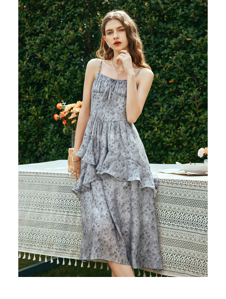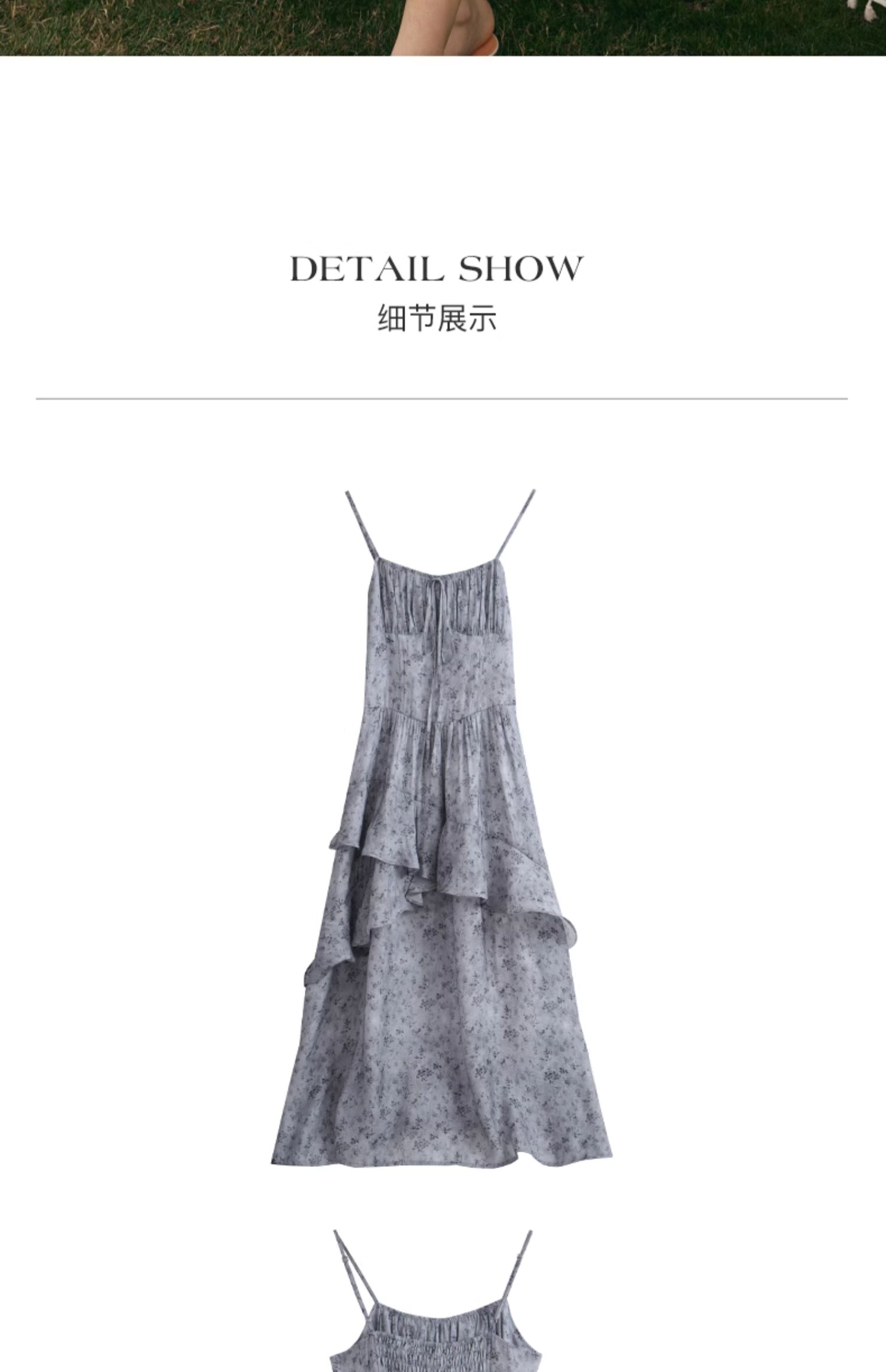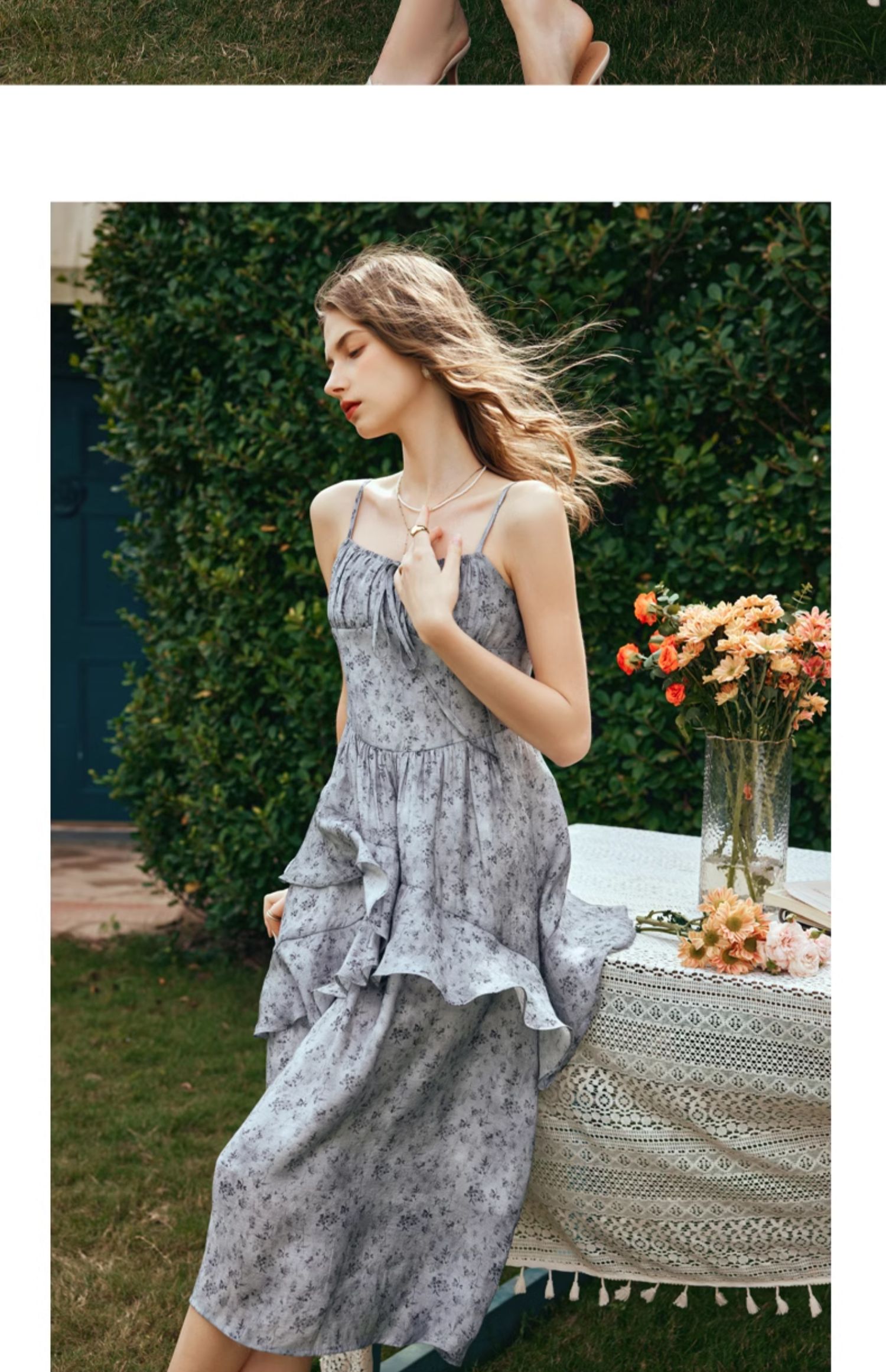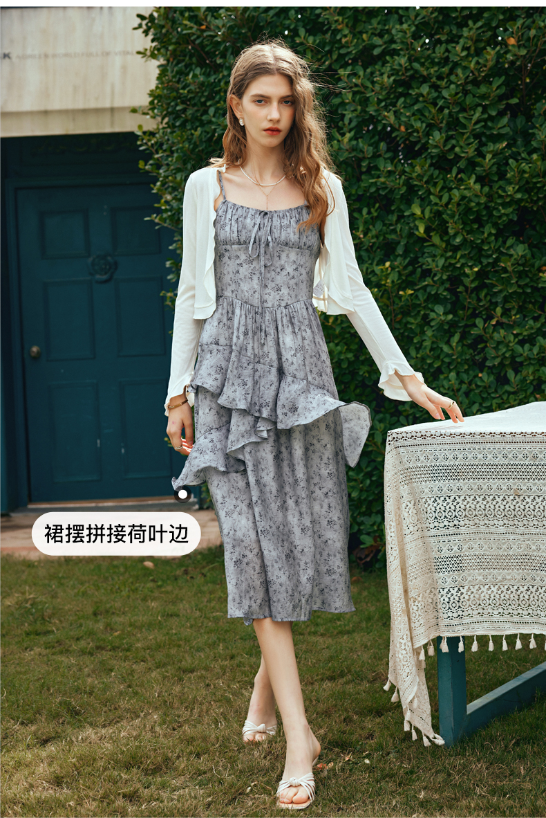 OLrain欧芮儿法式碎花吊带连衣裙女夏季2024年新款拼接荷叶边长裙