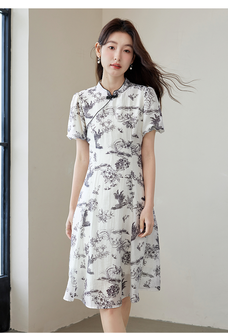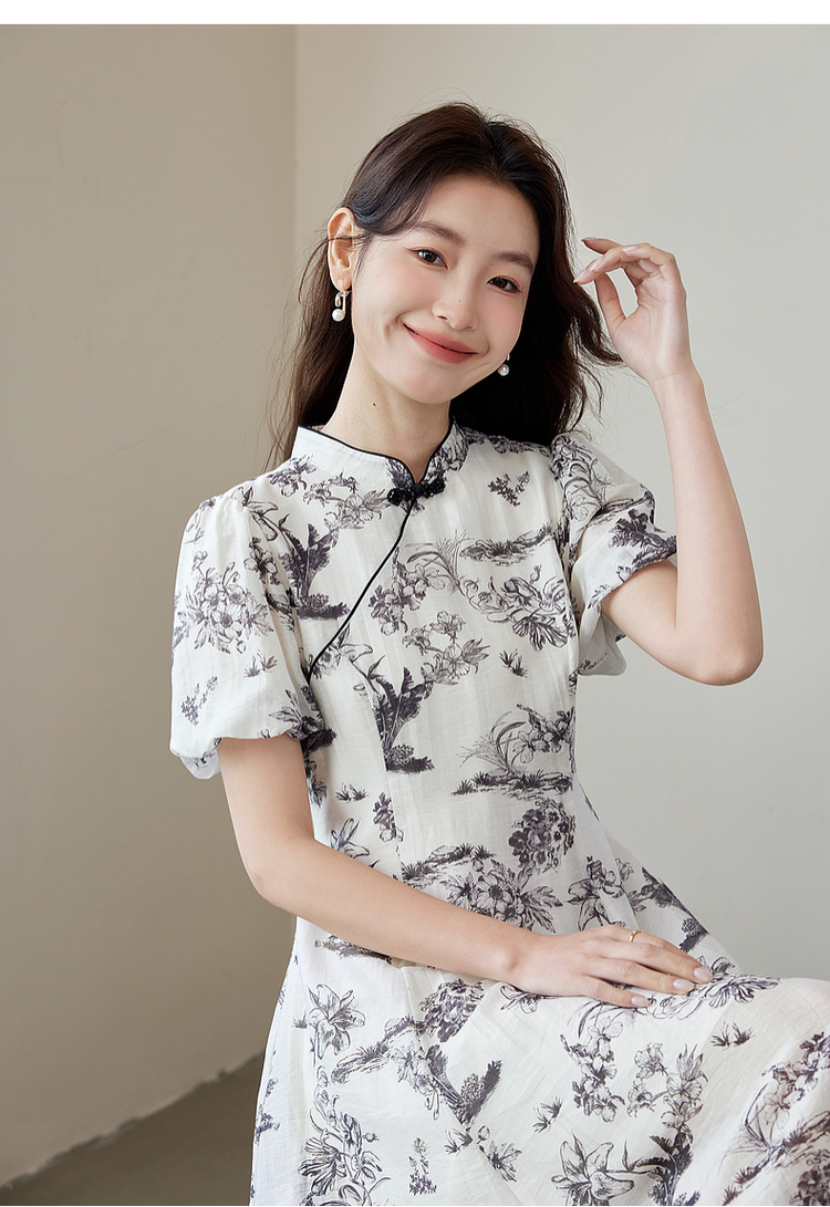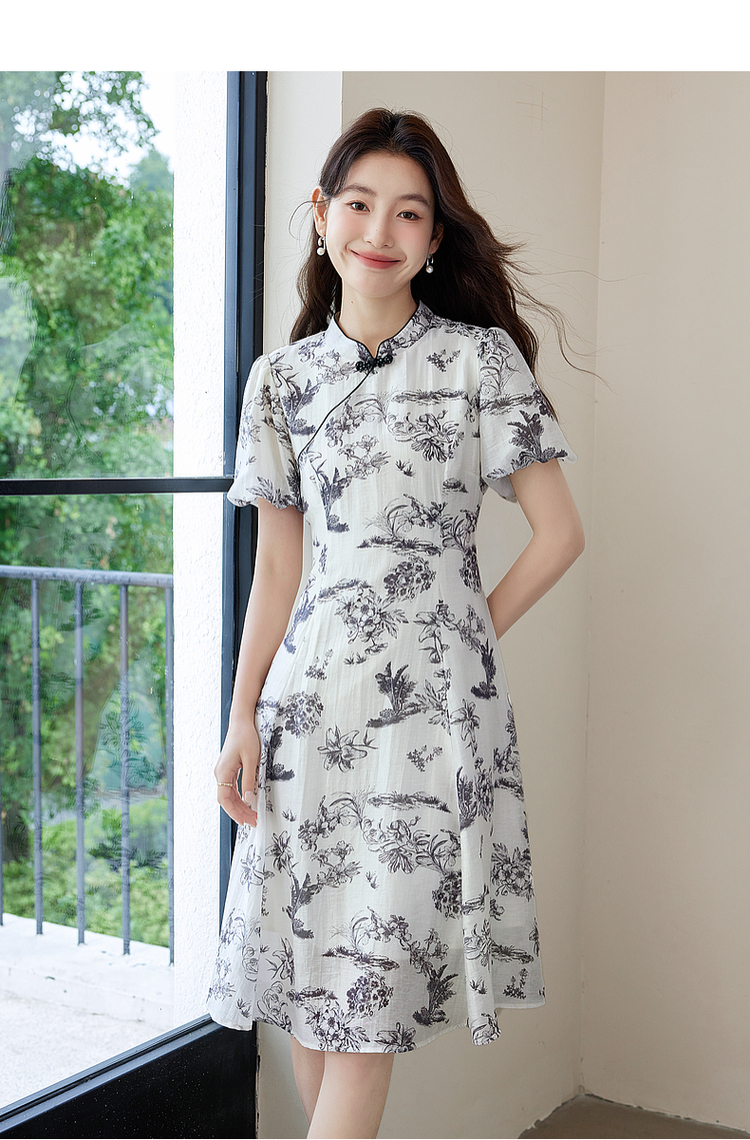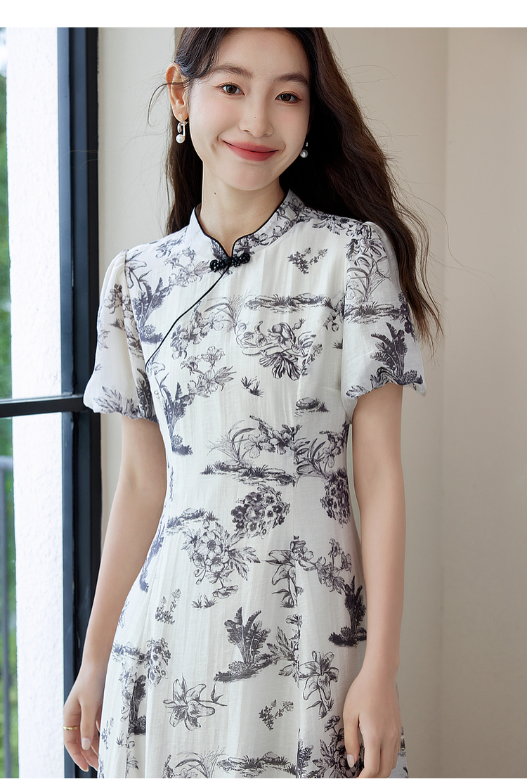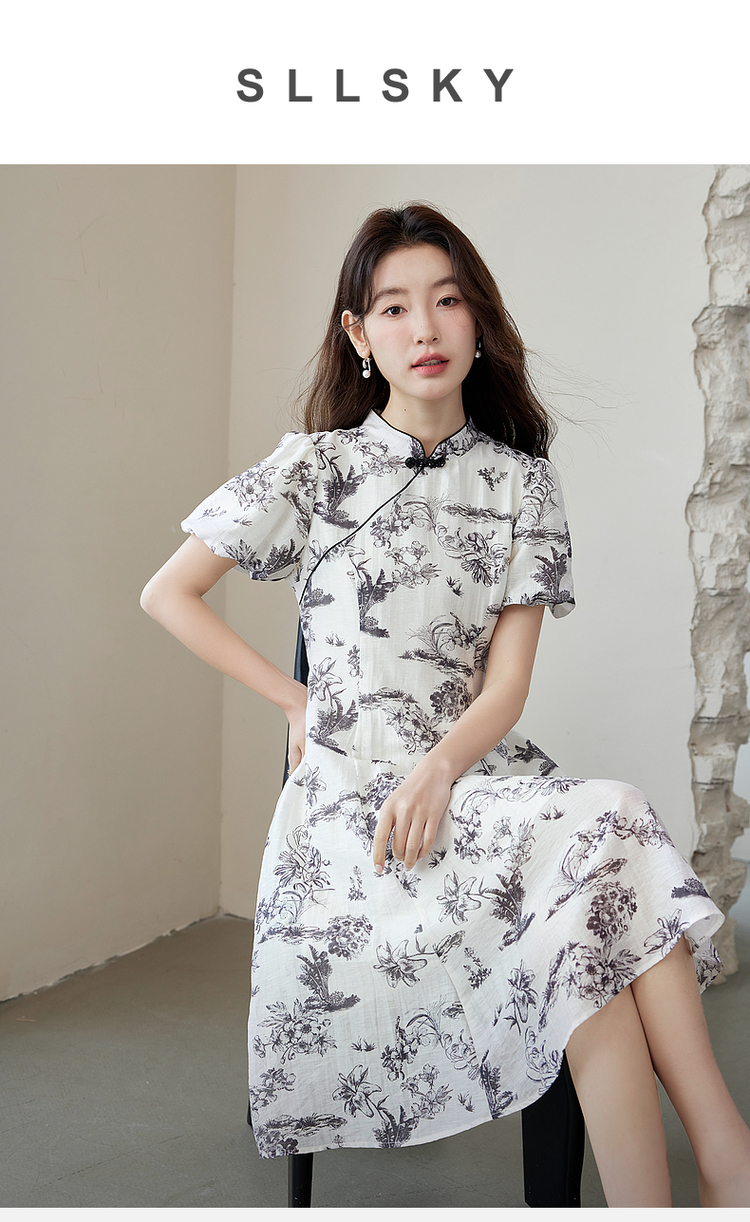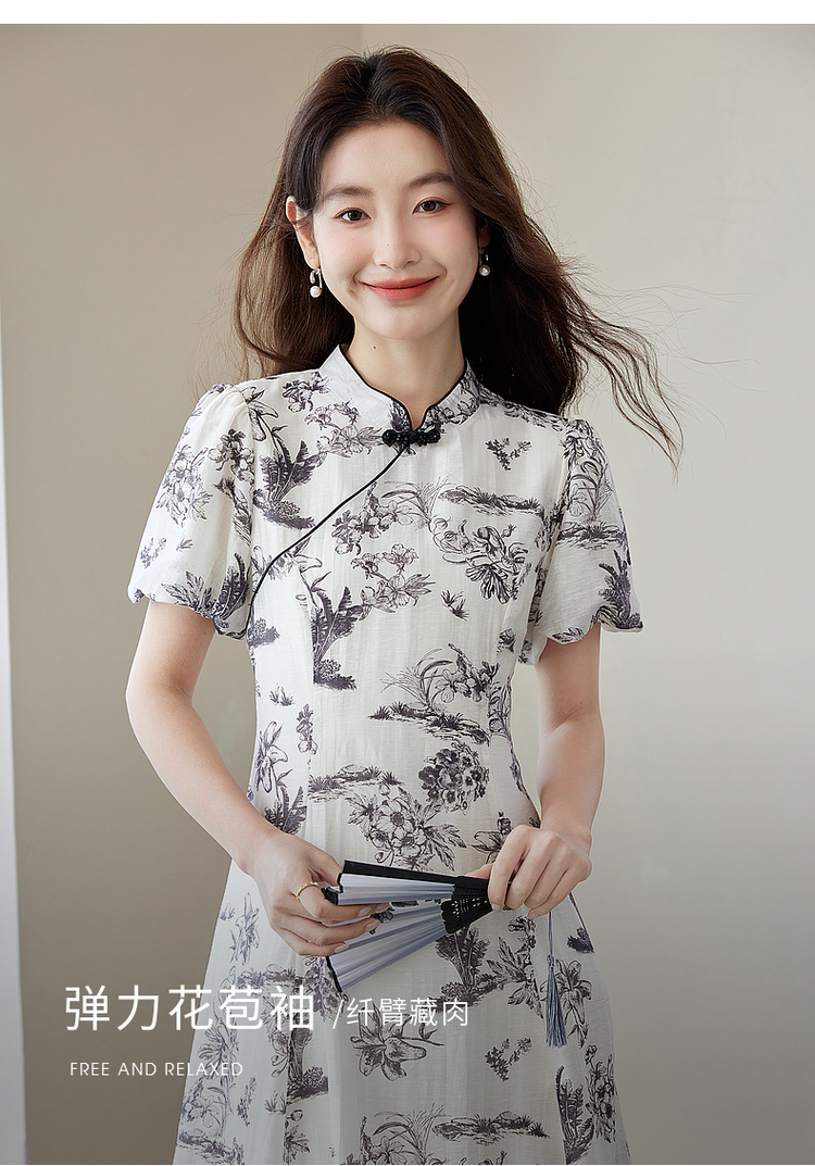 【专属特价】熙世界国风花卉水墨画旗袍裙2025夏季新款气质复古新中式连衣裙