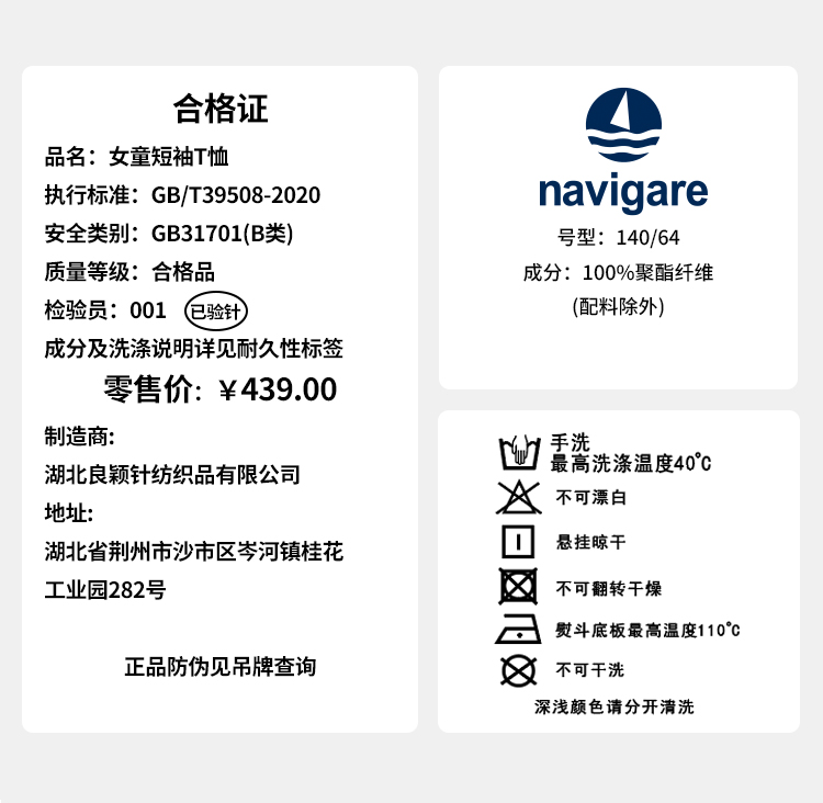 【纳维凯尔】【UPF50+速干】【120-165】Navigare意大利小帆船女童短袖T恤