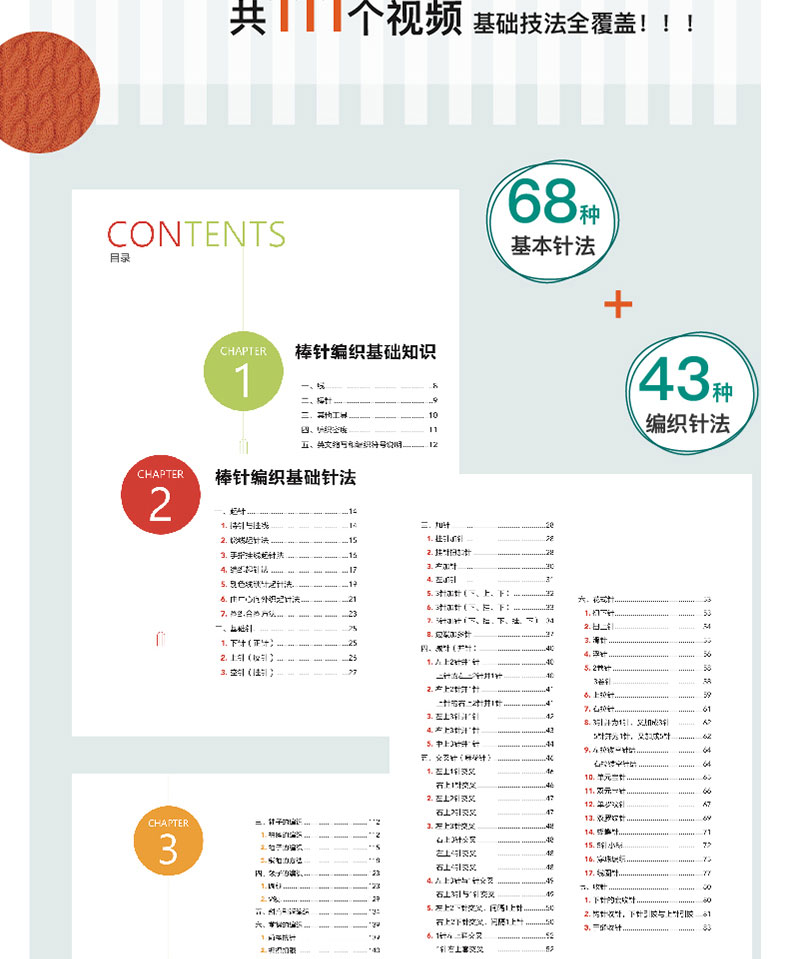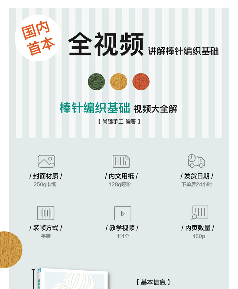 《棒针编织基础视频大全解》一书介绍了棒针编织的68种基本针法和43种基本编织技法,涵盖几乎所有棒针编织毛衣使用到的各种针法和衣片缝合、领袖减针、衣兜编织、钉纽扣、上拉链等编织技法。每种针法和技法都配有二维码,扫描二维码,可以观看该针法或技法的编织视频,实现一对一教学。本书是本全面的全视频讲解棒针编织基础的毛线编织书。