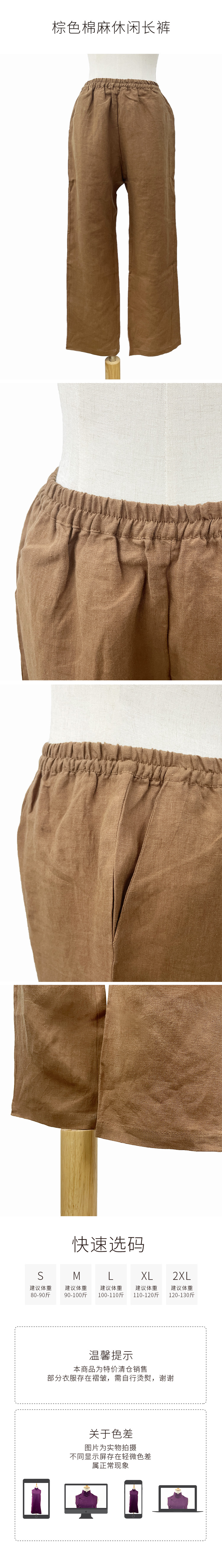 【下架】棕色棉麻休闲长裤 s码裤长82cm,m码裤长86cm