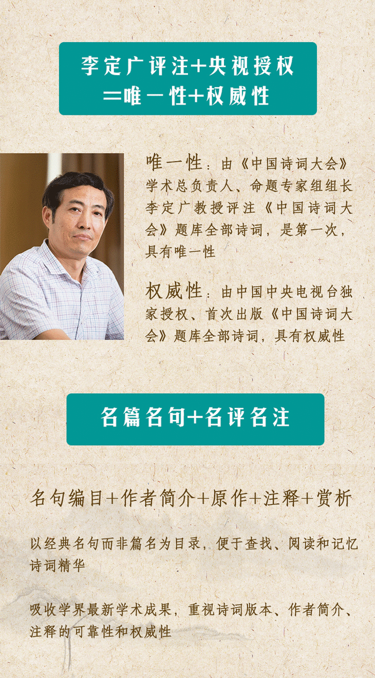 李定广,著名文史学者、文学博士、教授、博士生导师。兼任中国中央电视台热播节目《中国诗词大会》一季、二季、三季学术总负责人、命题专家组组长。《学术界》杂志2016年第8期封面人物。2003年复旦大学中国古代文学专业博士研究生毕业,2007年晋升教授。主要研究方向为唐宋诗词,已出版学术专著多部,在重要学术刊物发表高质量的学术论文数十篇。创办并主编国际学术刊物《中华诗学》中文版和英文版。