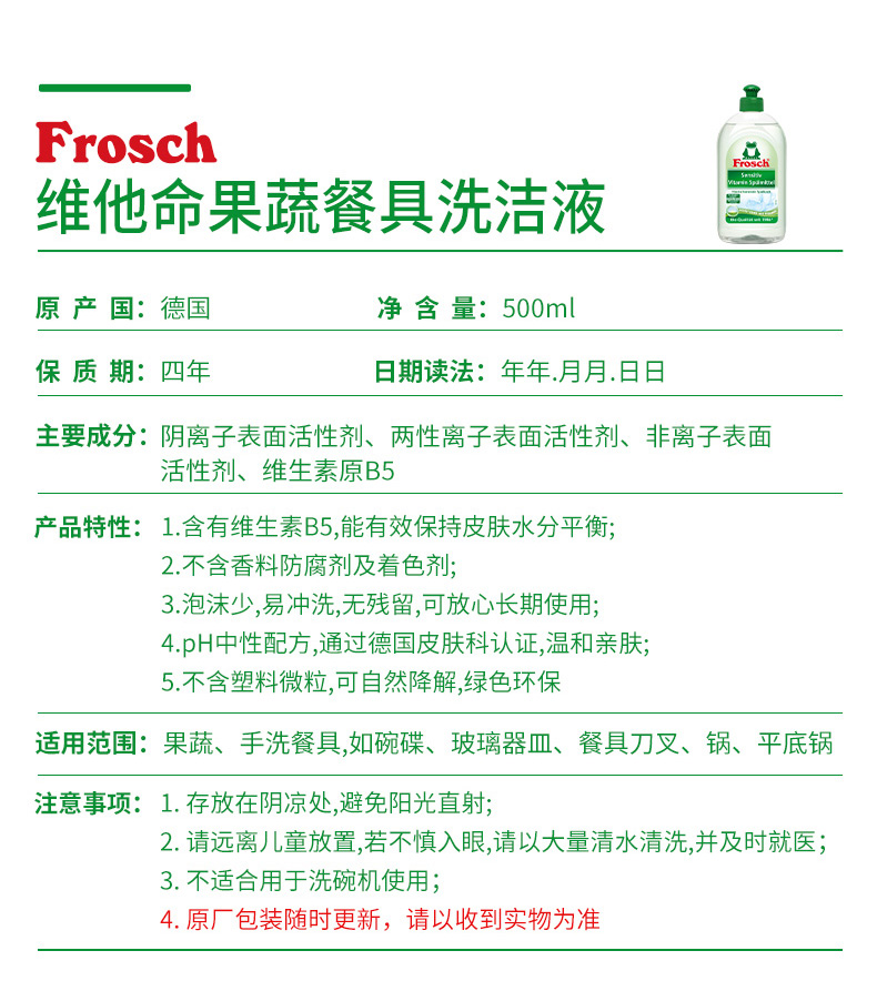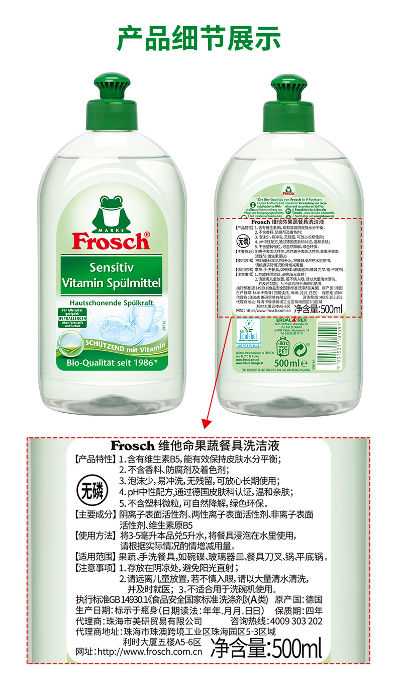500ml*2瓶 Frosch维他命浓缩餐具洗洁液【伊藤优选302209】