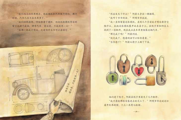 一年后,阿提再次来小镇度假时,阿明爷爷却不见了。但是他留给了阿提一样东西,是组装神奇汽车的图纸!