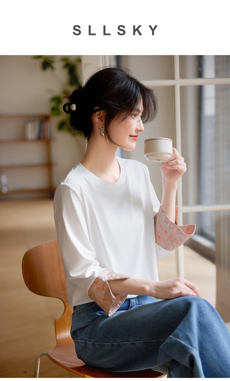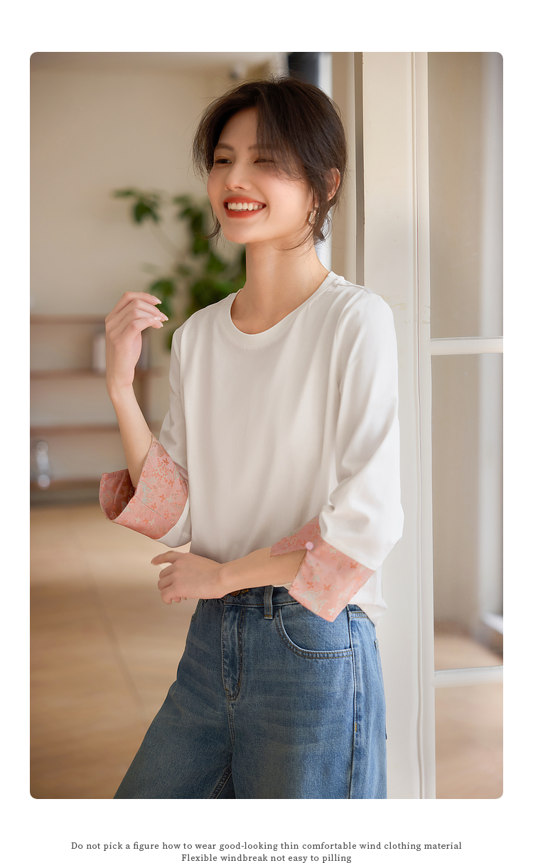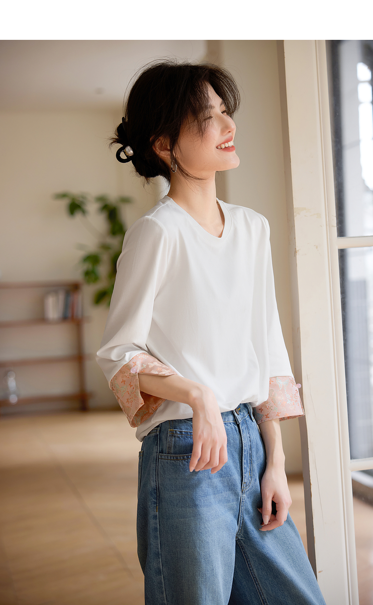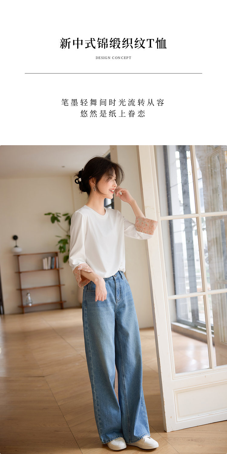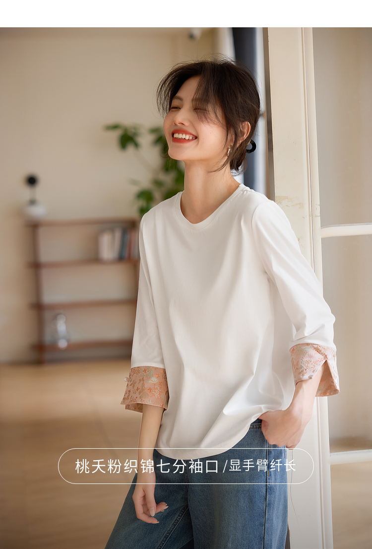 【春夏新品】熙世界新中式国风锦缎织纹七分袖T恤女2025年春季设计感休闲上衣