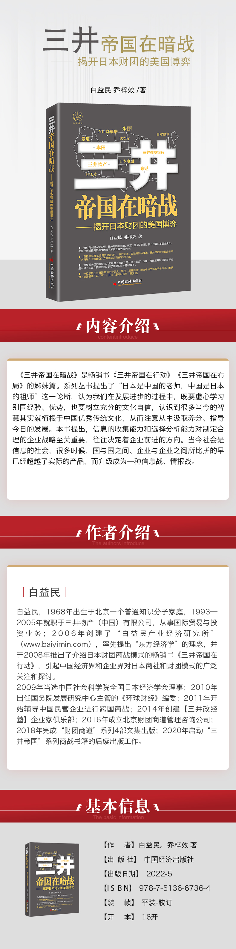 白益民,1968年出生于北京一个普通知识分子家庭,1993—2005年*职于三井物产(中国)有限公司,从事国际贸易与投资业务;2006年创建了“白益民产业经济研究所”(www.baiyimin.com),率先提出“东方经济学”的理念,并于2008年推出了介绍日本财团商战模式的*书《三井帝国在行动》,引起中国经济界和企业界对日本商社和财团模式的广泛关注和探讨。