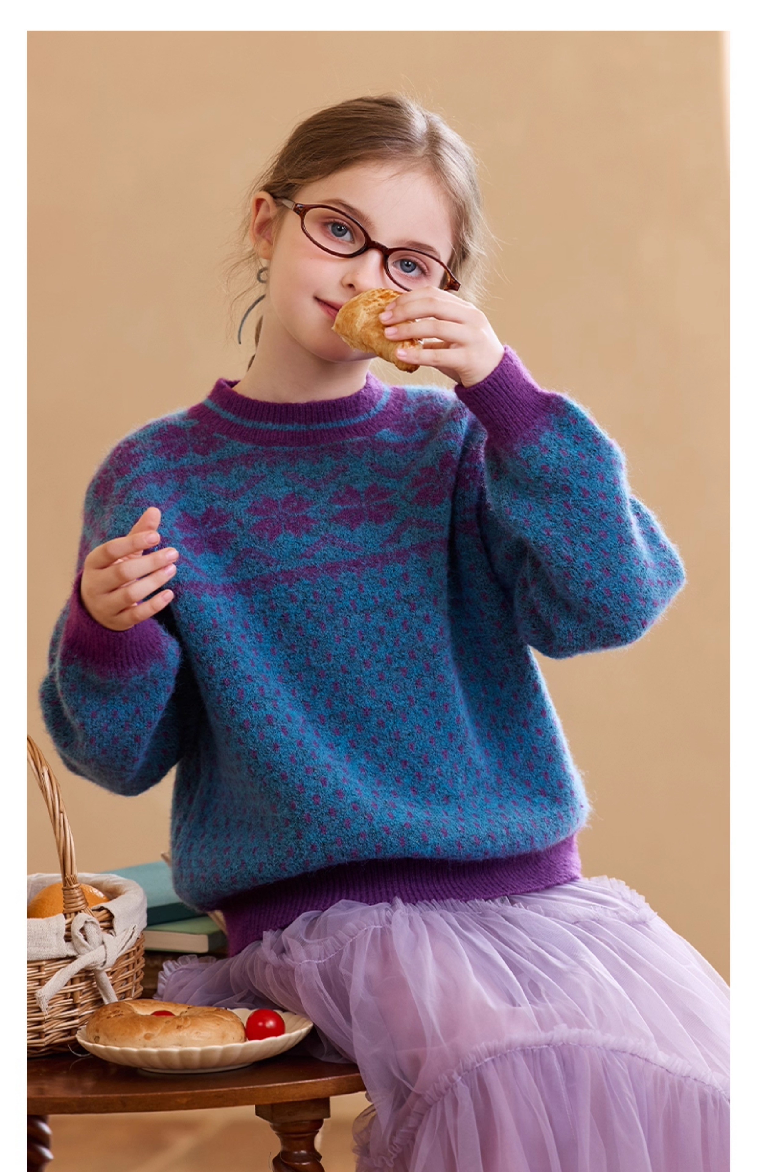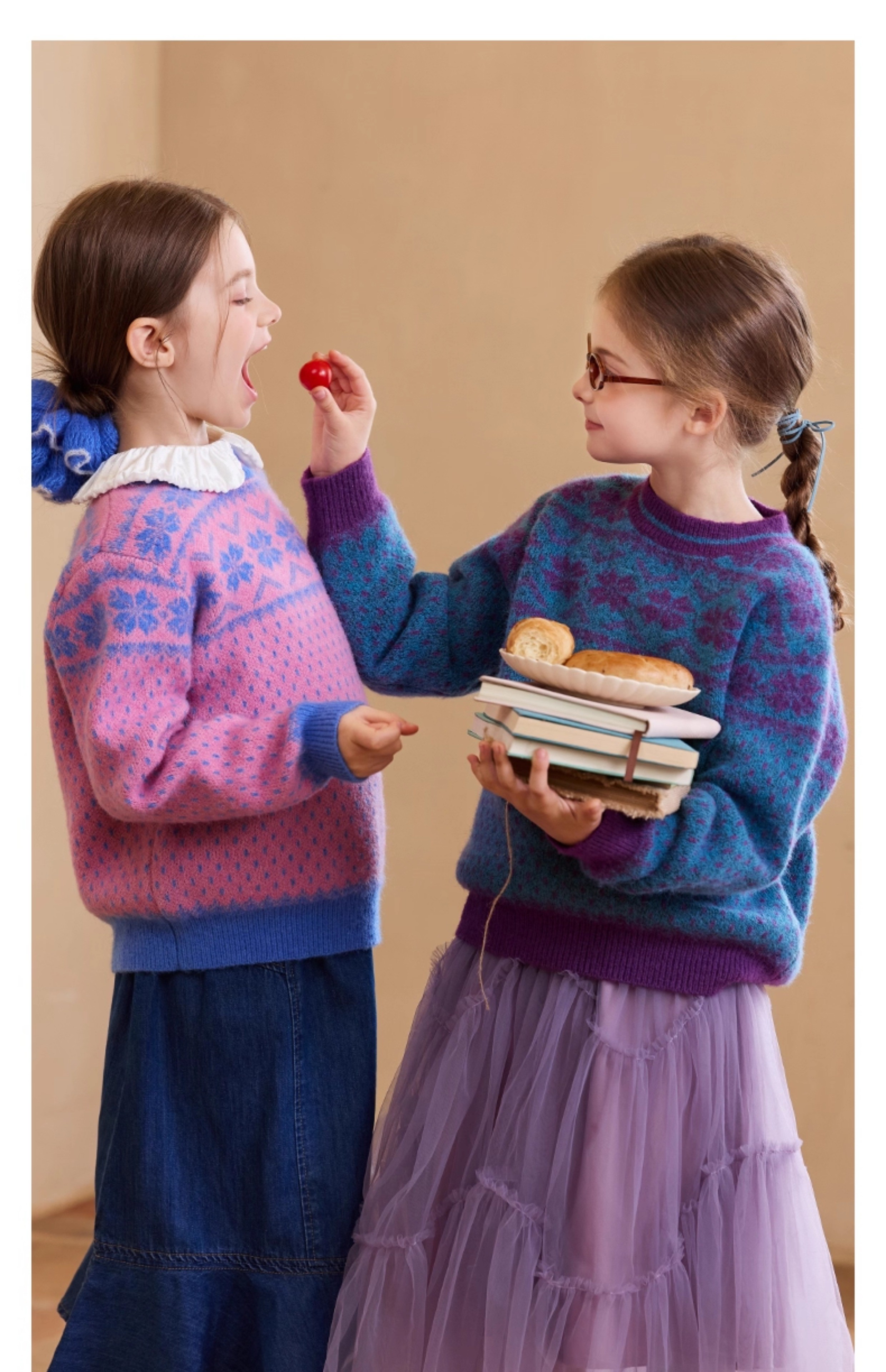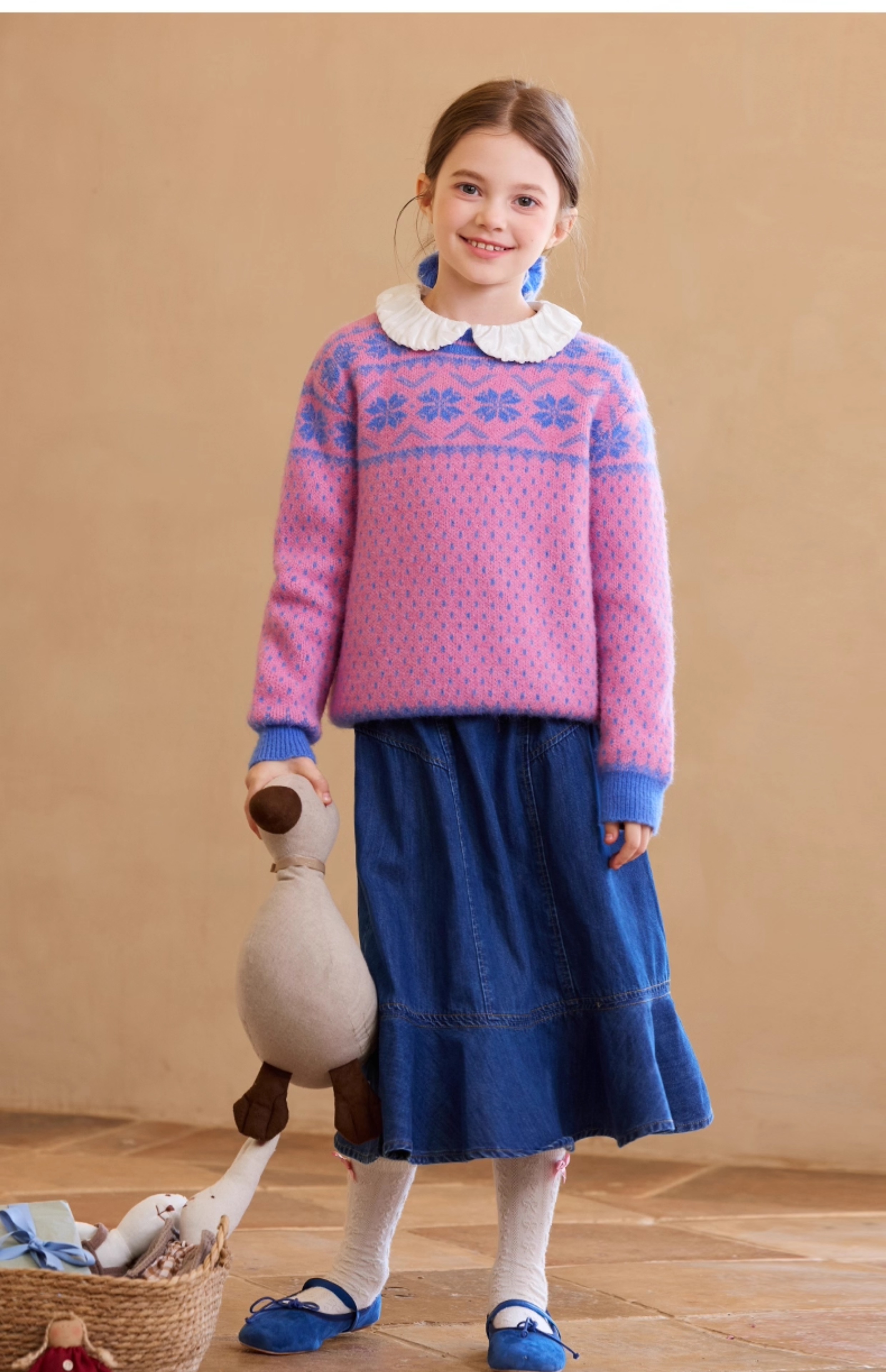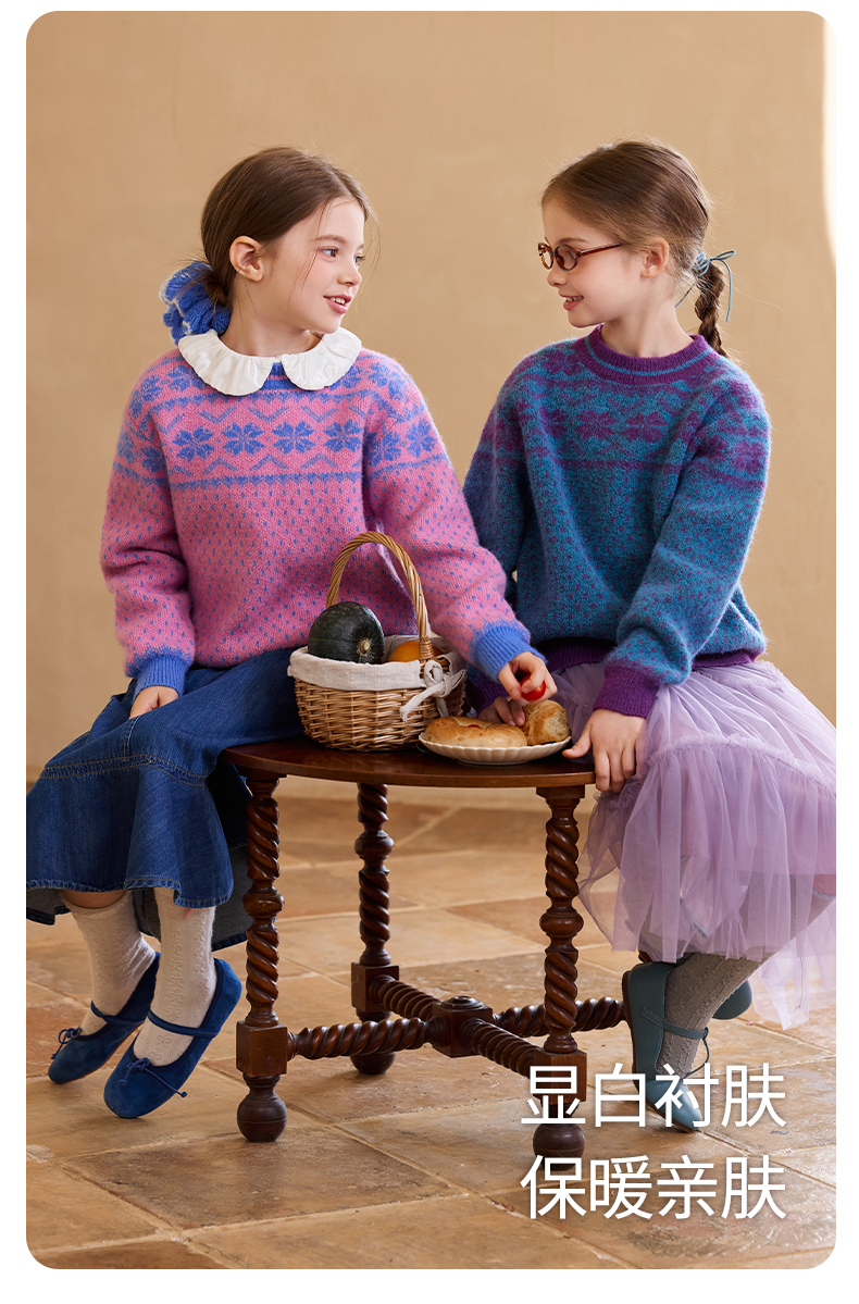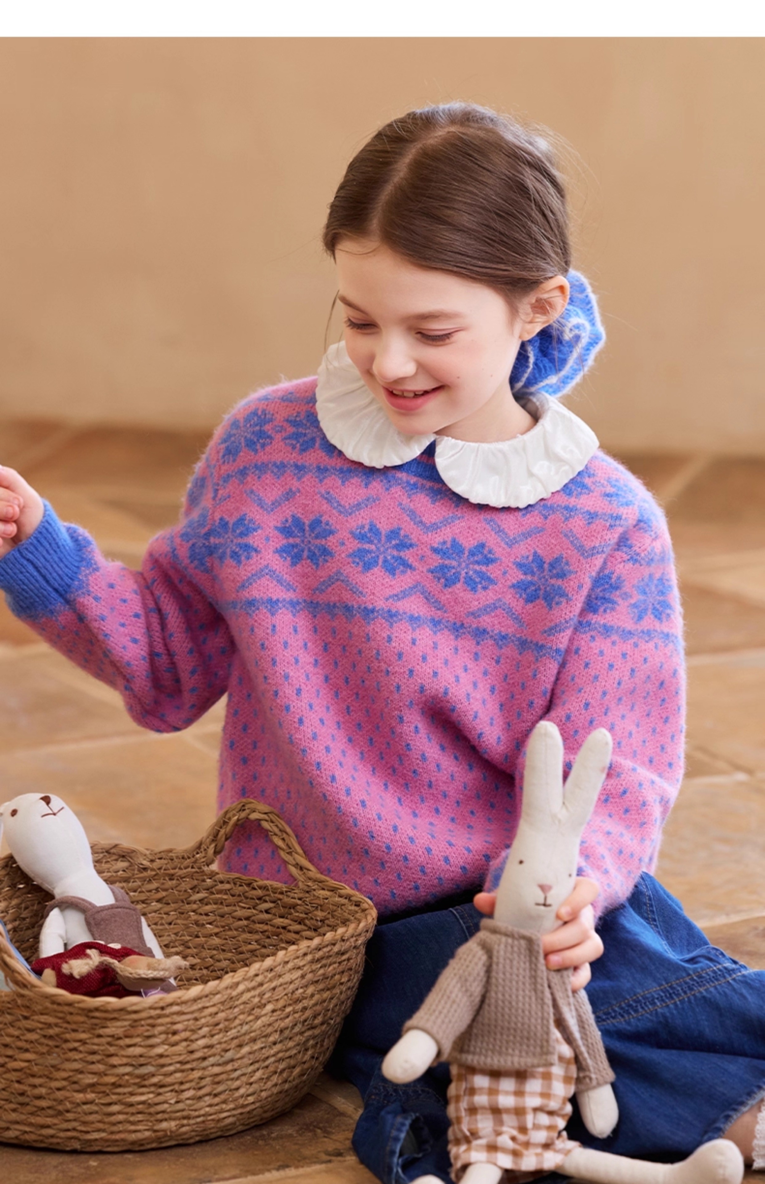 【云优选】Little Naive女童复古毛衣秋季新款撞色提花上衣儿童百搭套头毛衣