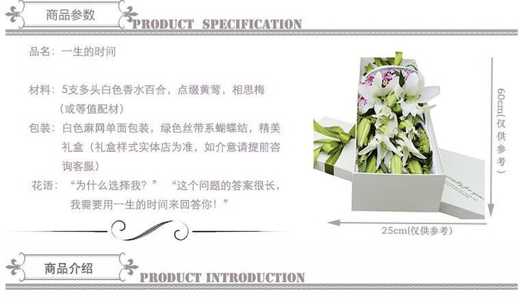花材:5支多头白色香水百合,点缀黄莺,相思梅 (或等值配材)