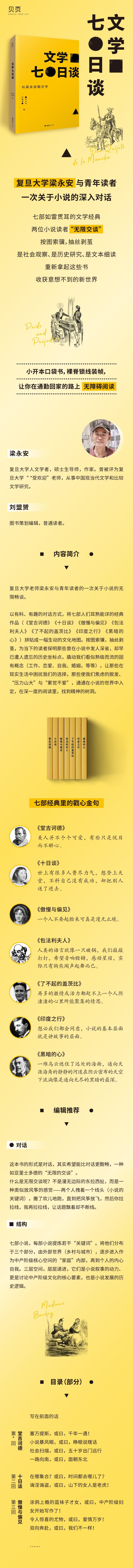 复旦大学老师梁永安与青年读者的一次关于小说的无限畅谈。以有料、有趣的对话方式,将七部人们耳熟能详的经典作品(《堂吉诃德》《十日谈》《傲慢与偏见》《包法利夫人》《了不起的盖茨比》《印度之行》《黑暗的心》)拼贴成一幅生动的文化地图。按图索骥,抽丝剥茧,为当下的读者探明那些曾在小说中发人深省,却早已遭人遗忘的历史坐标点,撬动我们看似熟极而流的固有概念(工作、恋爱、自我、婚姻,等等),让那些在现实生活中困扰我们的选择、那些使我们焦虑的脱发,“压力山大”与“累觉不爱”,通通在小说的世界中入定,在深一度的阅读里,找到精神的树洞。