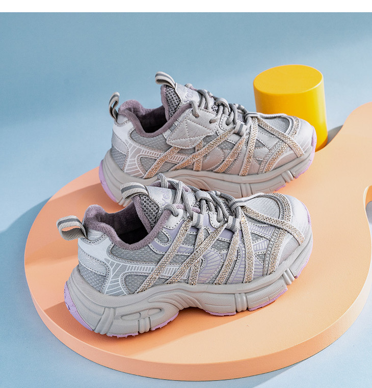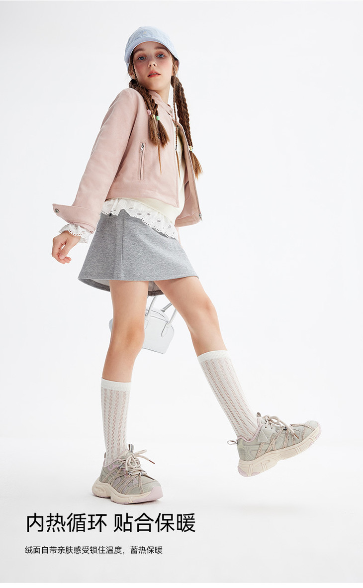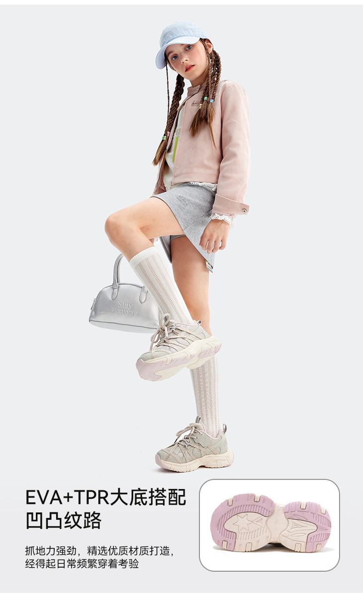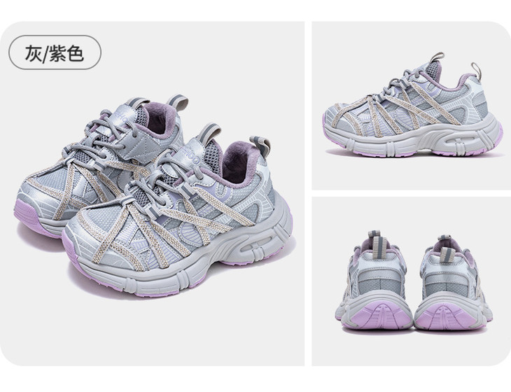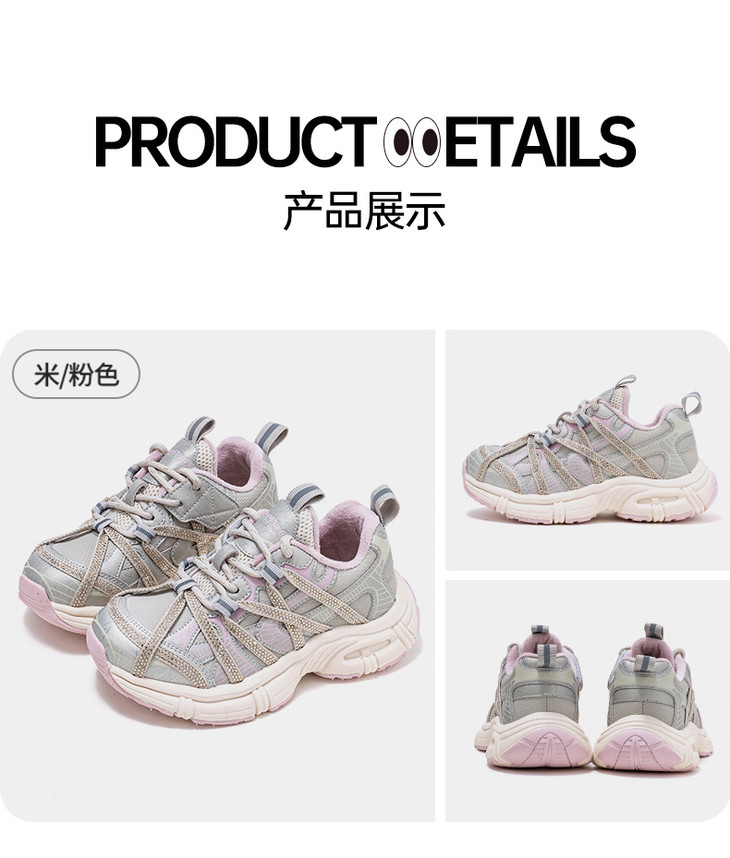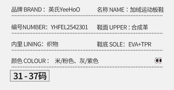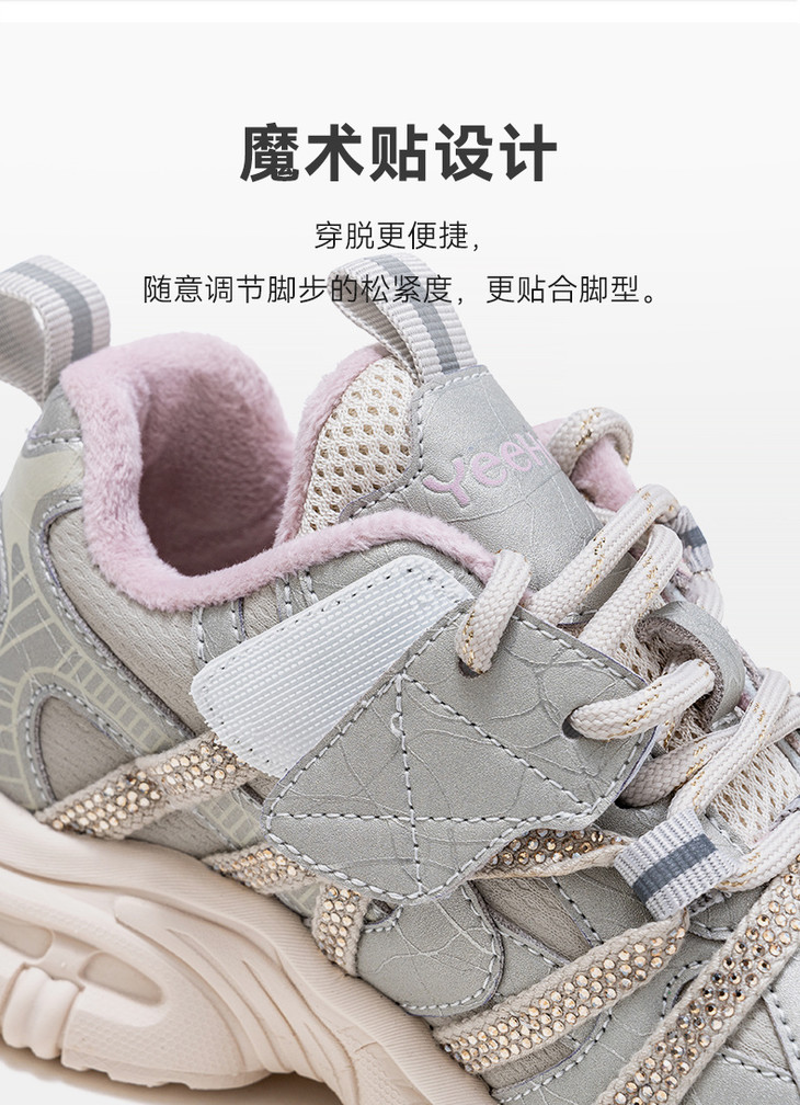 英氏YeeHo0童鞋冬季魔术贴运动鞋YHFEL2542301 货号:YHFEL2542301 颜色:米粉色、灰紫色 尺码:31-37 材质:鞋面 合成革;鞋底 EVA+TPR 这款运动鞋内部采用加厚毛绒内里,绒毛柔软细腻,能紧密贴合脚部,有效锁住热量,为孩子的双脚提供温暖呵护。 鞋底采用 EVA + TPR 材质,具有良好的弹性和柔韧性,能有效缓冲行走时的冲击力,减少对孩子脚部的伤害。 鞋身还设计有科学的弯折点,如 1/3 处弯折,符合人体工学原理,能让孩子的脚部自然弯曲,行走更加轻松舒适。 另外,鞋底的纹路设计合理,防滑性能出色,能让孩子在各种地面上都走得稳当。 鞋头部分一般采用了圆润包边或加固设计,能有效防止孩子在行走或奔跑时脚趾受到碰撞和挤压 这种设计不仅能保护孩子的脚趾安全,还能避免鞋子因频繁碰撞而损坏,延长鞋子的使用寿命。 后跟部分采用了加固设计,通常会内置硬质后跟杯,能为孩子的脚踝提供有力的支撑,有效固定脚踝位置,防止脚踝在运动中发生扭伤或变形。 同时,后跟处的材质也比较厚实,能减少鞋子对脚跟的摩擦,让孩子穿着更加舒适。