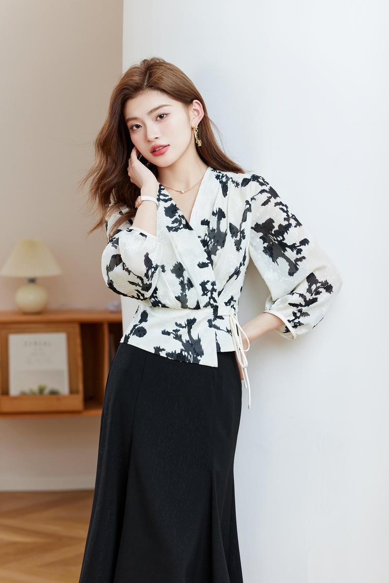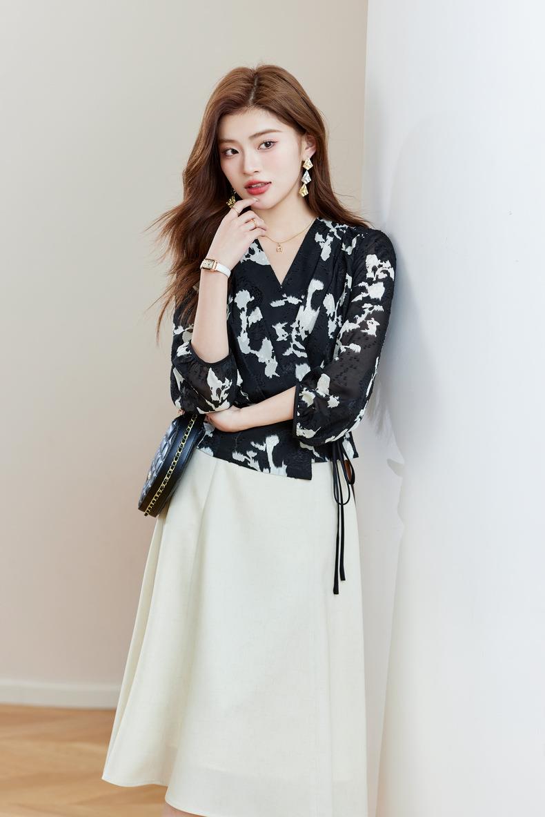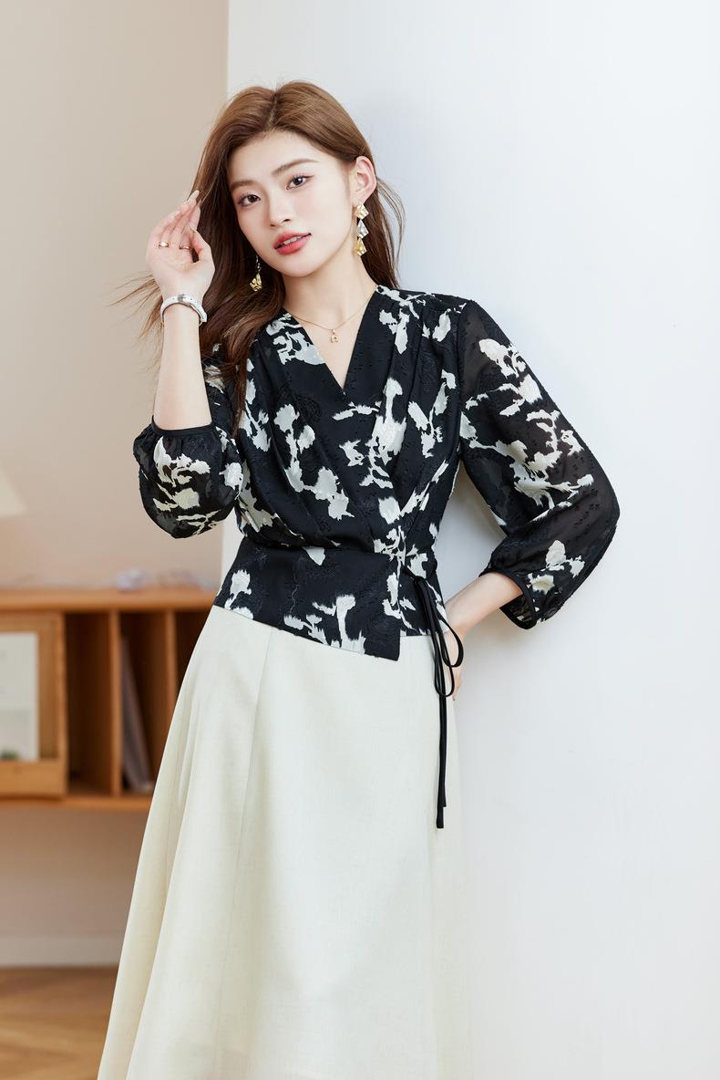 七分袖印花雪纺衫上衣2024春夏新款V领洋气小衫女衬衣1850
