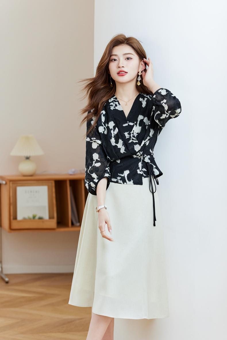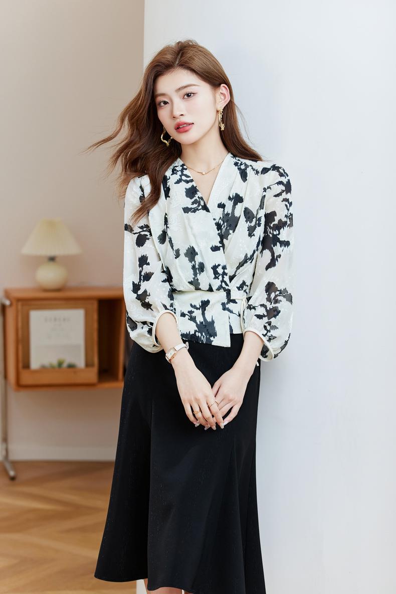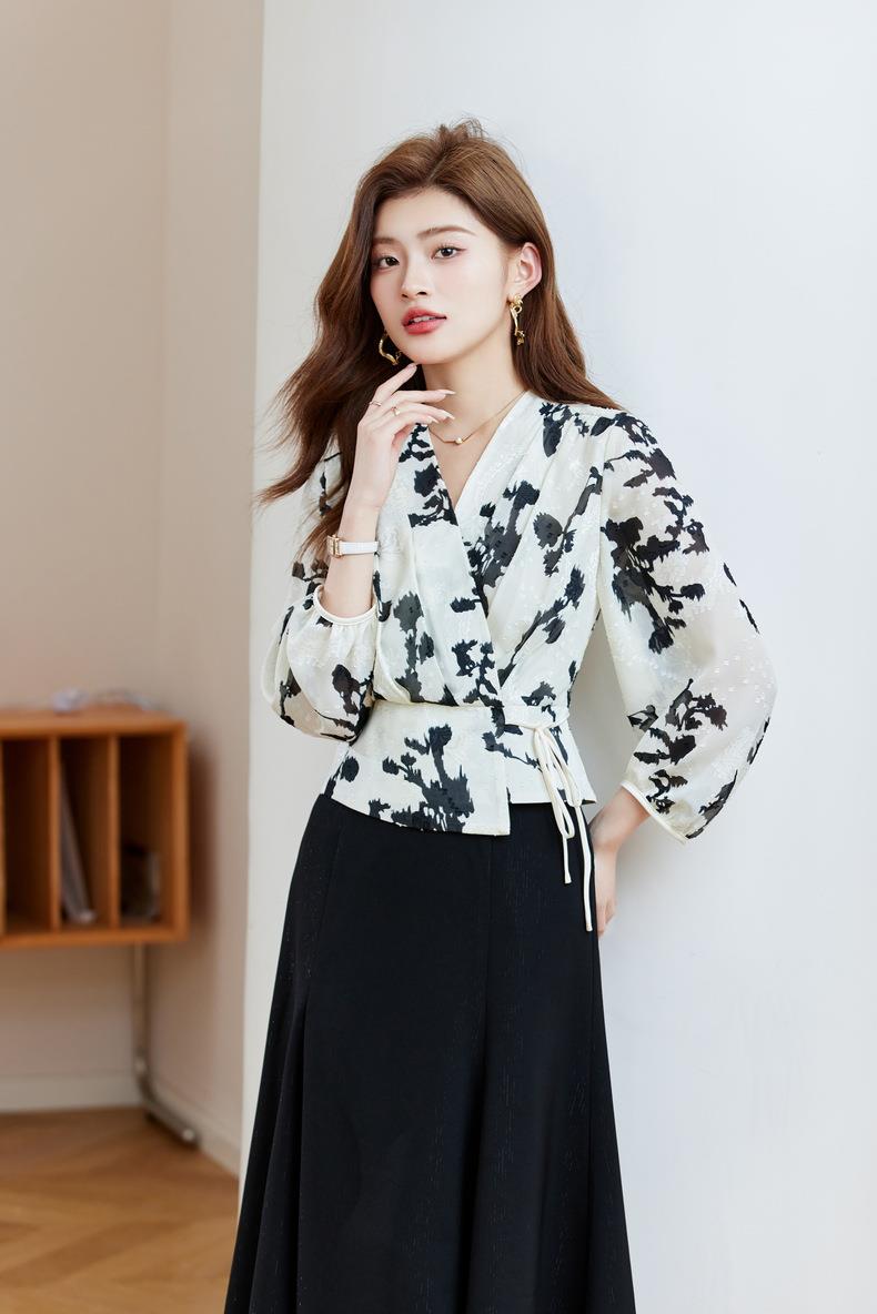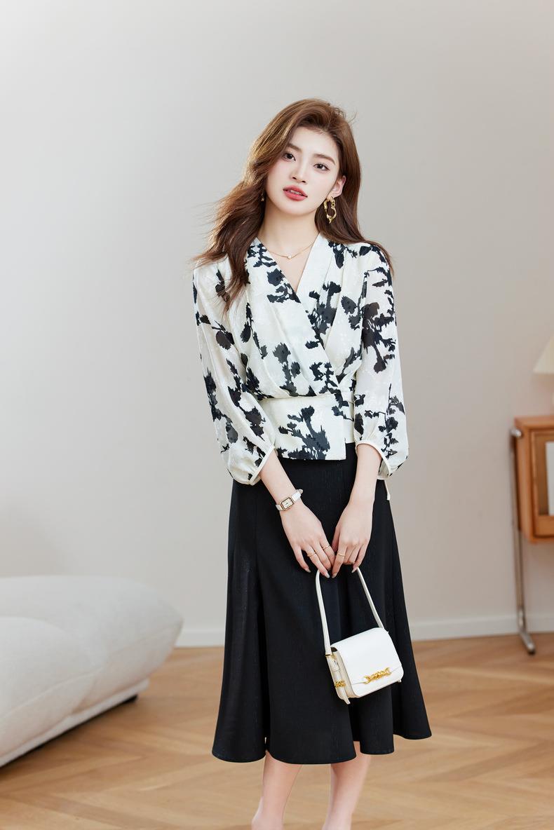 七分袖印花雪纺衫上衣2024春夏新款V领洋气小衫女衬衣1850