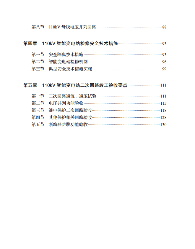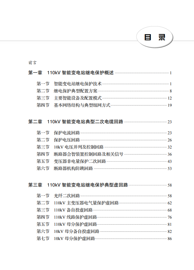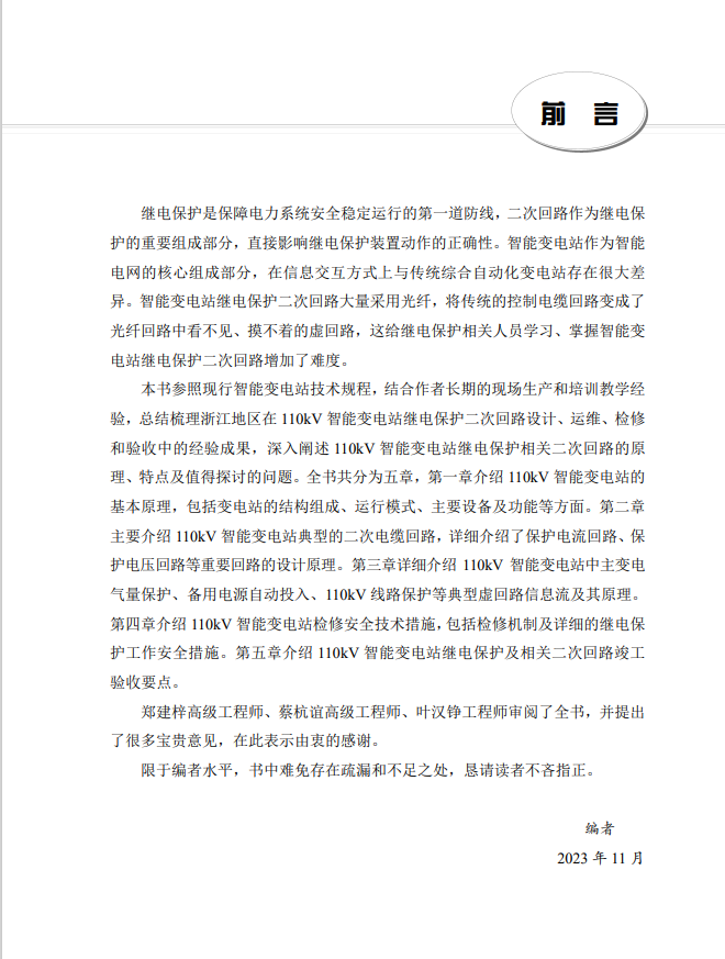 本书针对 110kV 智能变电站继电保护二次回路相关问题,参照工程现场实际图纸和 SCD 文件,选择 典型的继电保护二次电缆回路和虚回路,如电压电流回路、控制回路、主变保护回路、备自投回路等,结 合继电保护检修和二次回路验收工作,详细分析其技术要点、难点,帮助继电保护专业人员深入了解、掌 握 110kV 智能变电站的继电保护二次回路的相关知识。 本书可供电力系统继电保护从业人员,特别是运维、检修人员学习参考,也可作为继电保护二次回路 方面的培训教材。