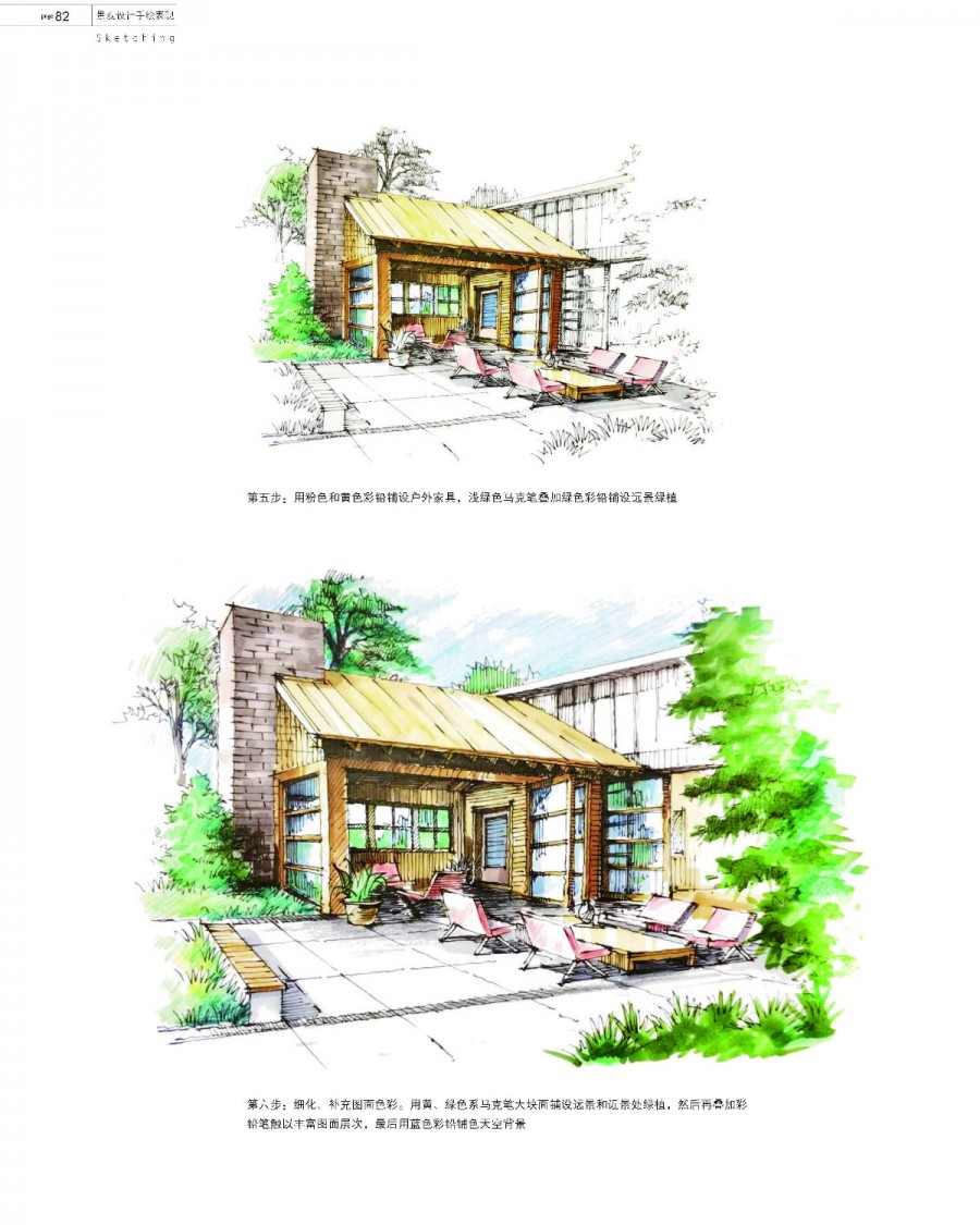 同时,本书配备了完整的手绘教学视频,将手绘表现的常态直观地展现给读者,便于综合学习、参考和应用。读者对于手绘表现的学习应是一个从整体到局部再到整体的过程,本教材即在遵循这一规律的基础上编排各部分的内容。首先对手绘表现的相关原理性基础知识进行阐释,对读者应知应会的基础理论知识,如透视原理、色彩关系、明暗层次等通过图文结合的方式展开较系统的讲解;其次,为了便于读者的情境式学习,对于钢笔、马克笔、彩铅等材料技法的表现也全部采用原创的步骤图展示,从最初始的笔触示范、排笔到结合图面主次、虚实等关系进行笔触的叠加与综合运用,再到对完整的画面绘制全过程,以步骤图展示并辅以文字剖析,使初学者既能深入系统地理解景观设计手绘表现的基本原理和规范要求,又能快速准确地通过手绘表现景观设计方案。