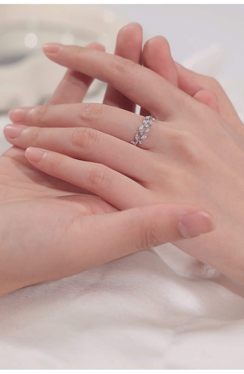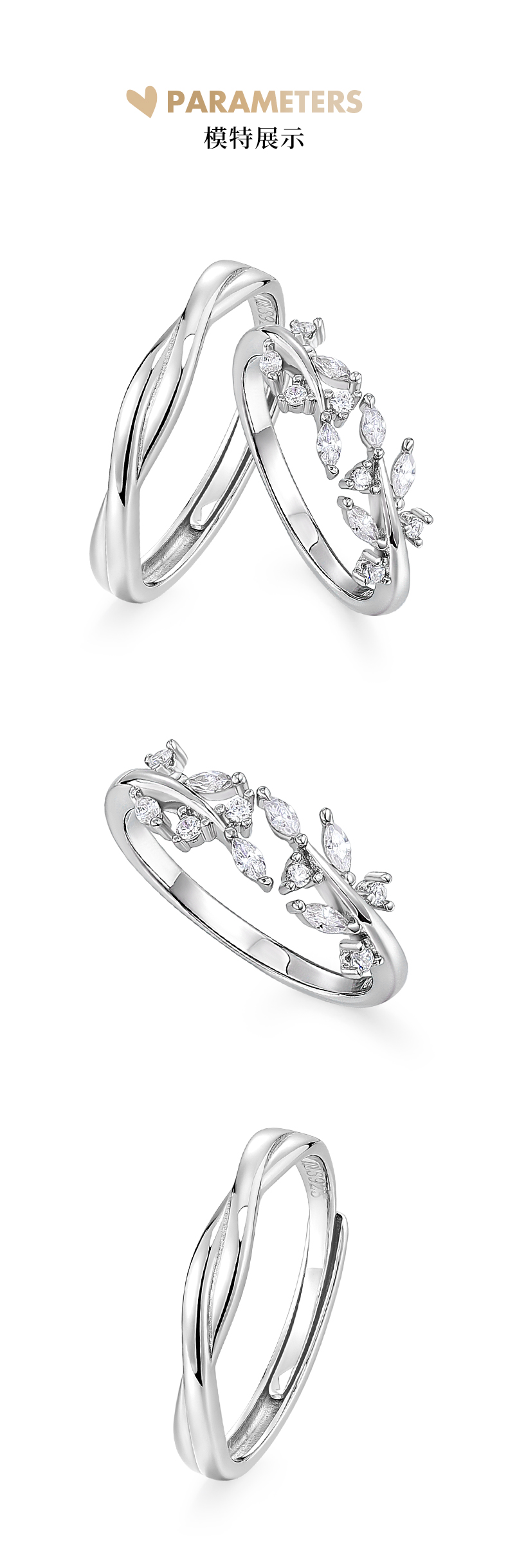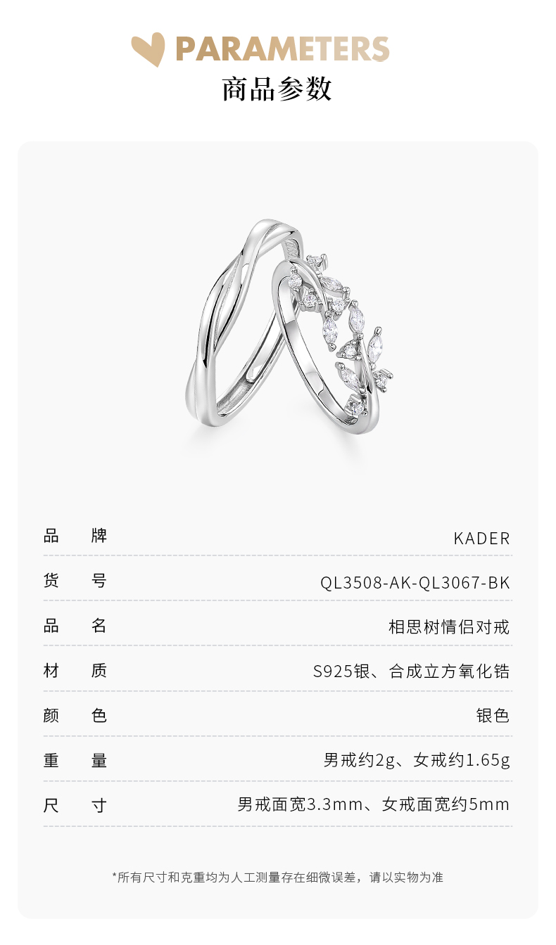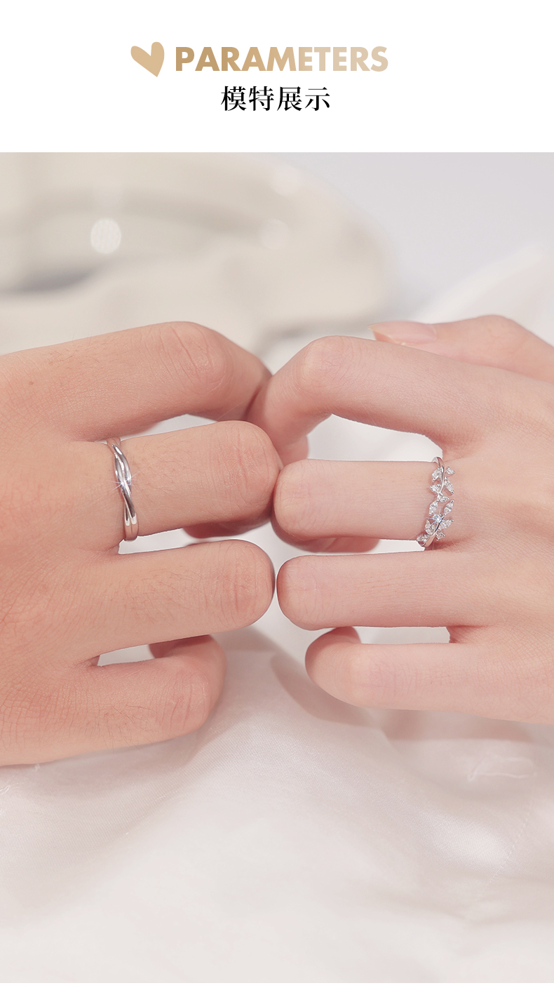 卡蒂罗KADER 相思树情侣对戒 925银闪锆错落点缀树叶造型设计开口可调节男女友戒一对 精致百搭浪漫爱情