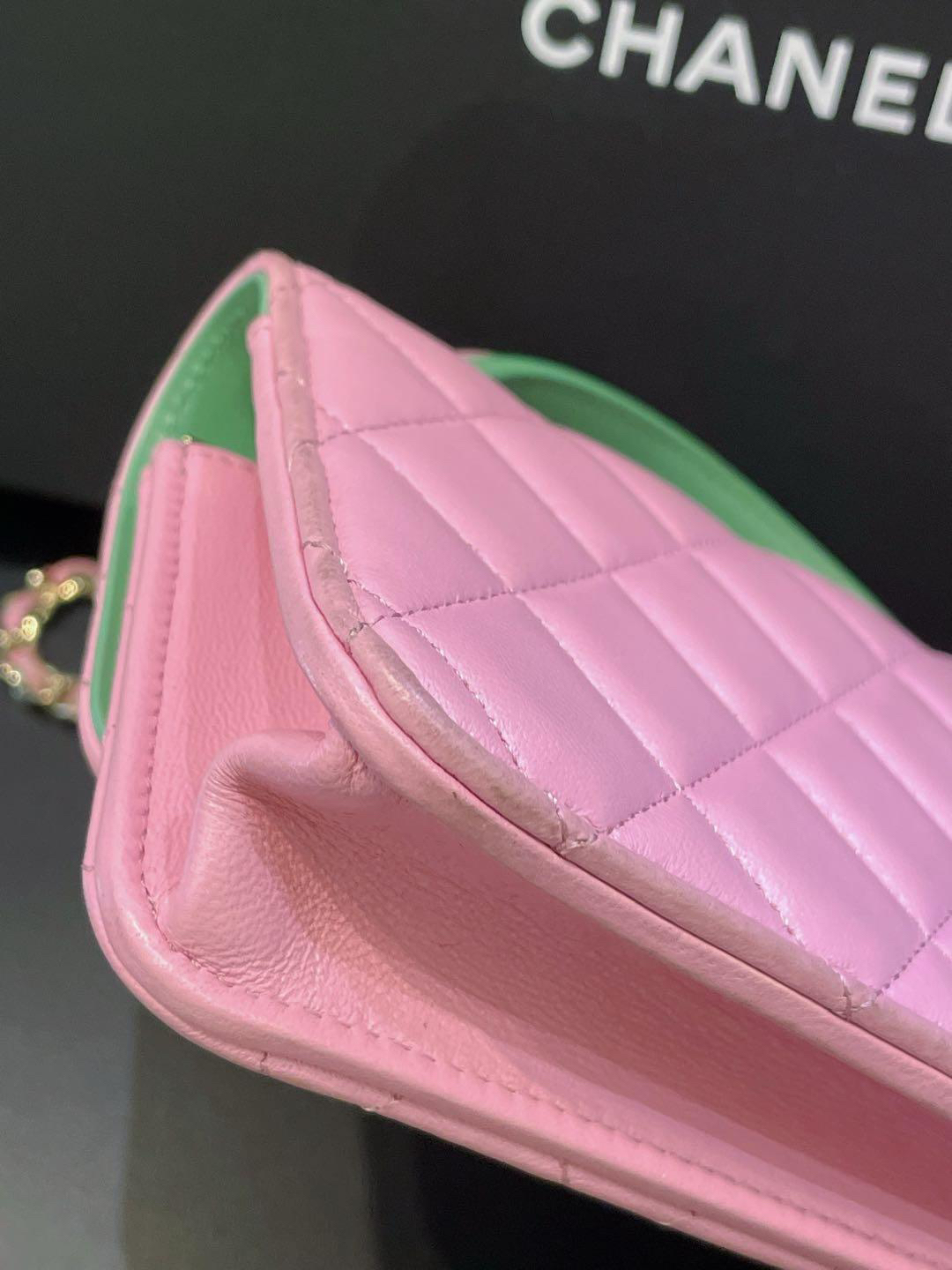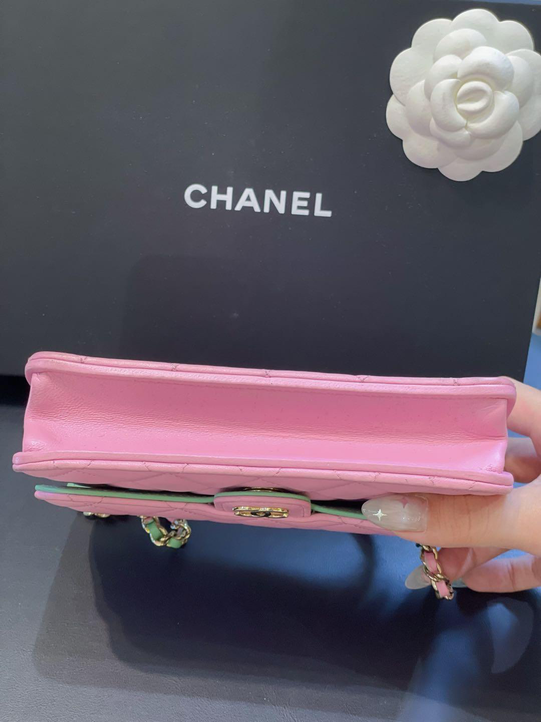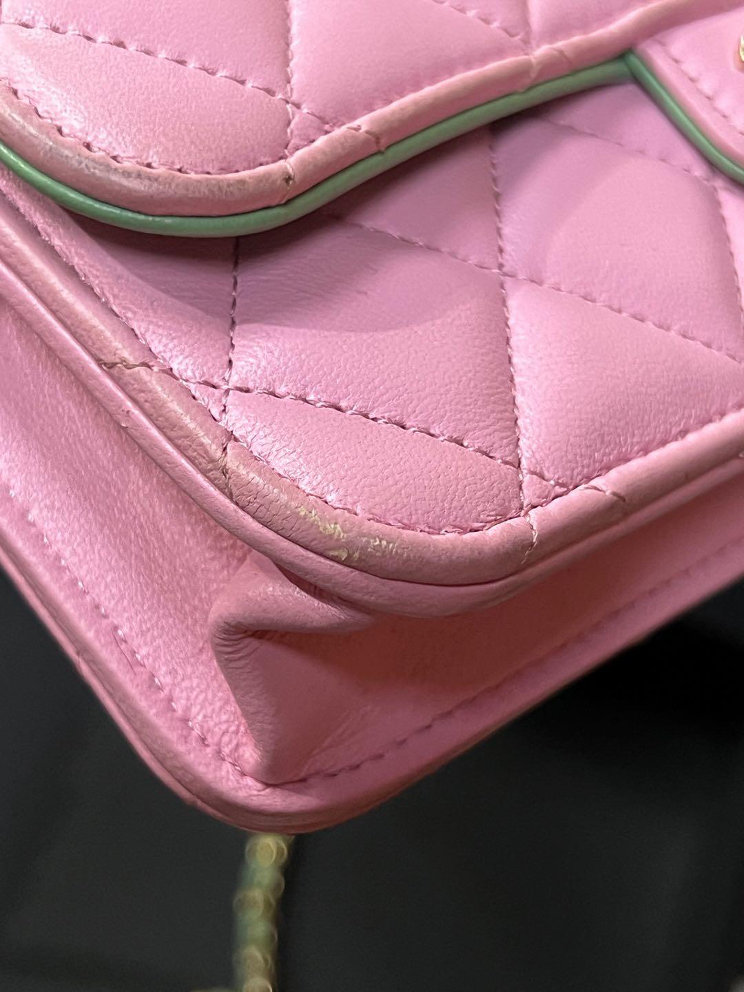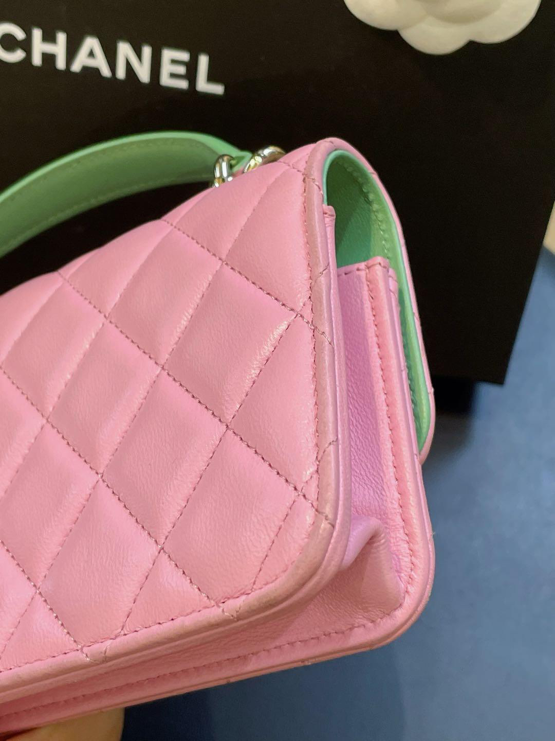【商品詳情】正品二手 Chanel cf 23p mini 手柄 羊皮 粉拼绿 链条包🐠95新 17*10 芯片款 大全套配件:票 说明书 防尘袋 盒子。边角正常使用感。精致可爱!