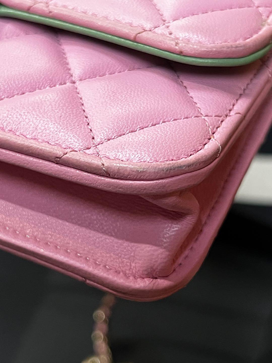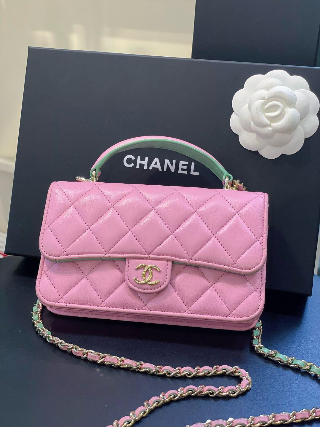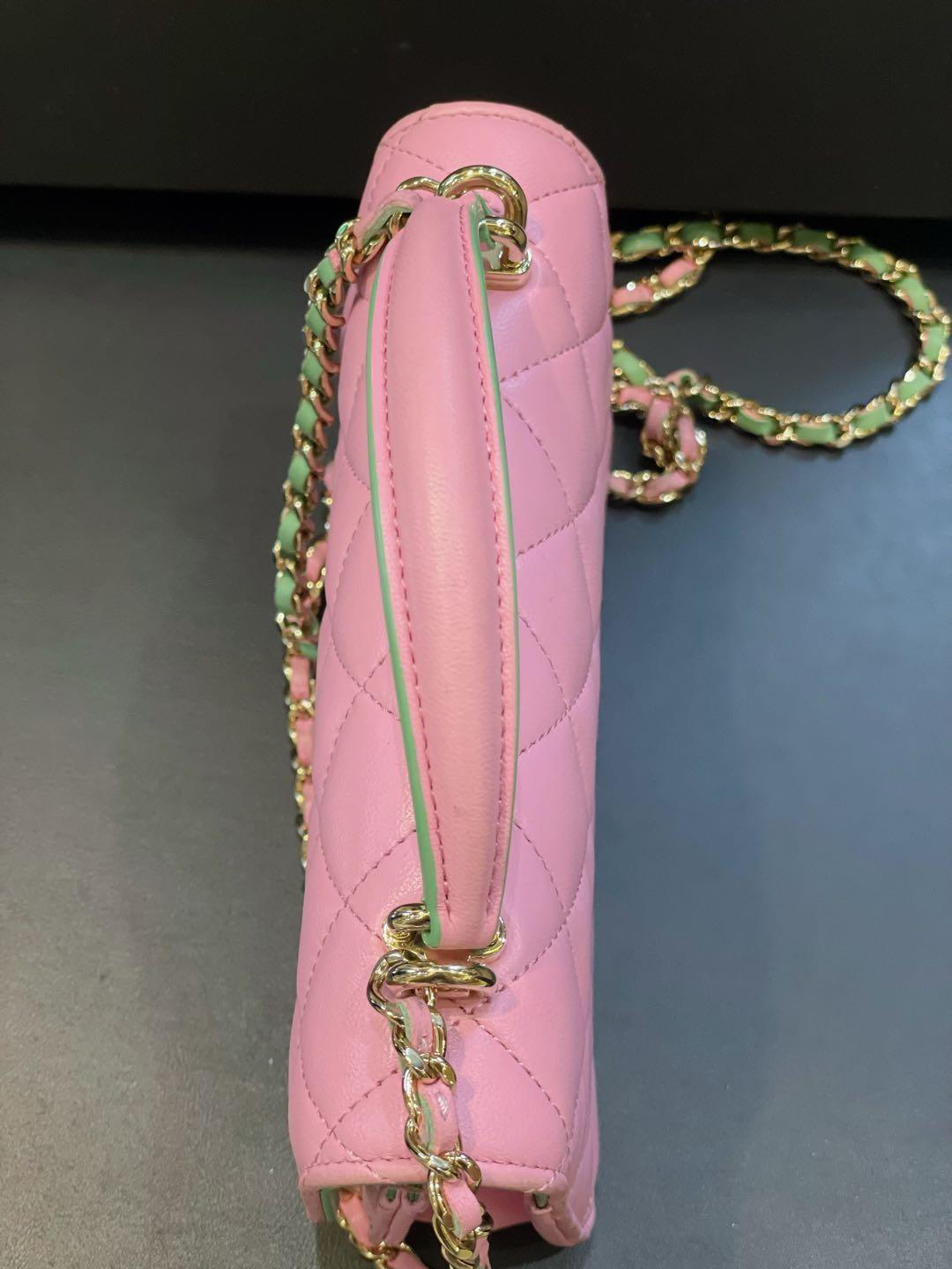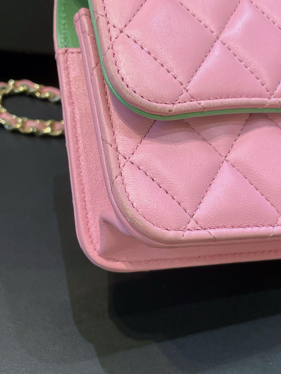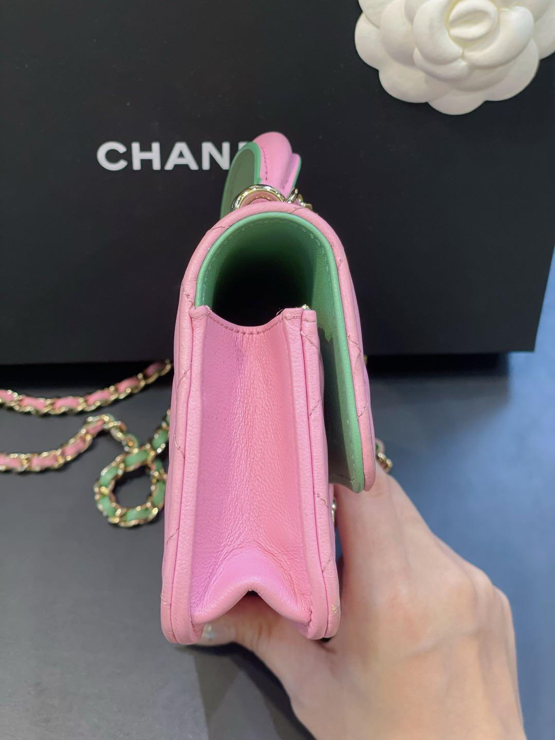 【商品詳情】正品二手 Chanel cf 23p mini 手柄 羊皮 粉拼绿 链条包🐠95新 17*10 芯片款 大全套配件:票 说明书 防尘袋 盒子。边角正常使用感。精致可爱!