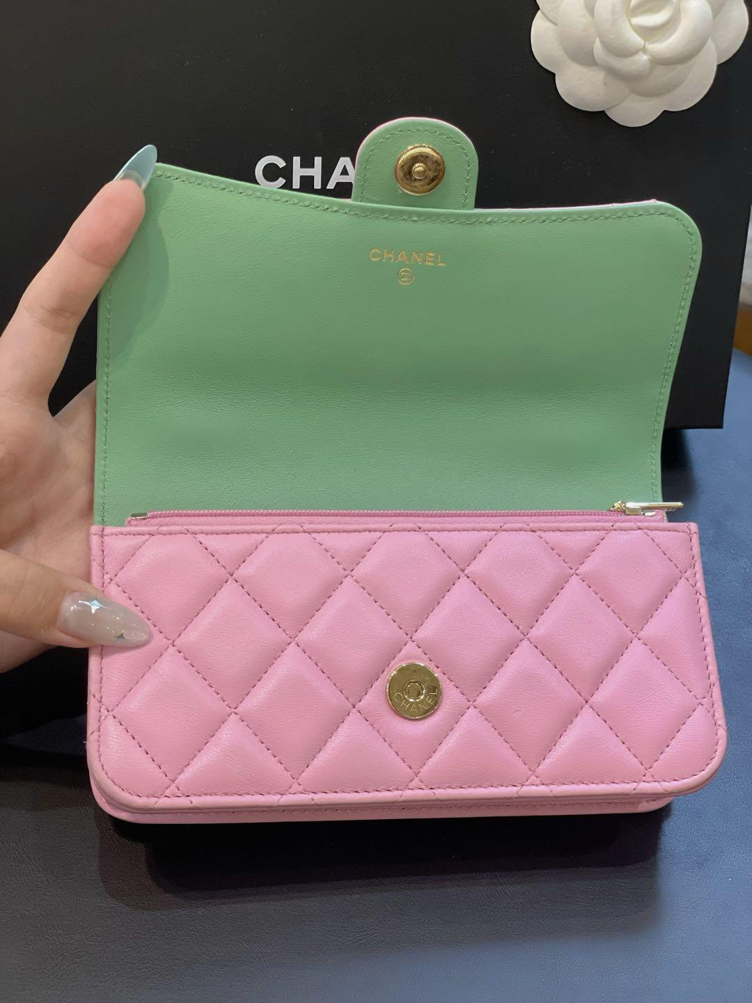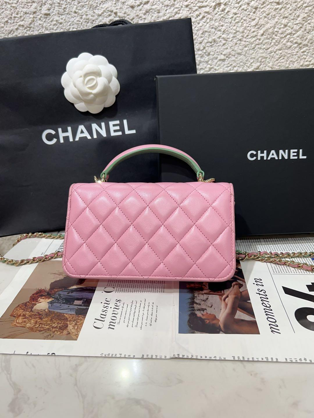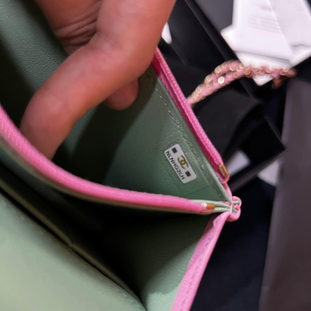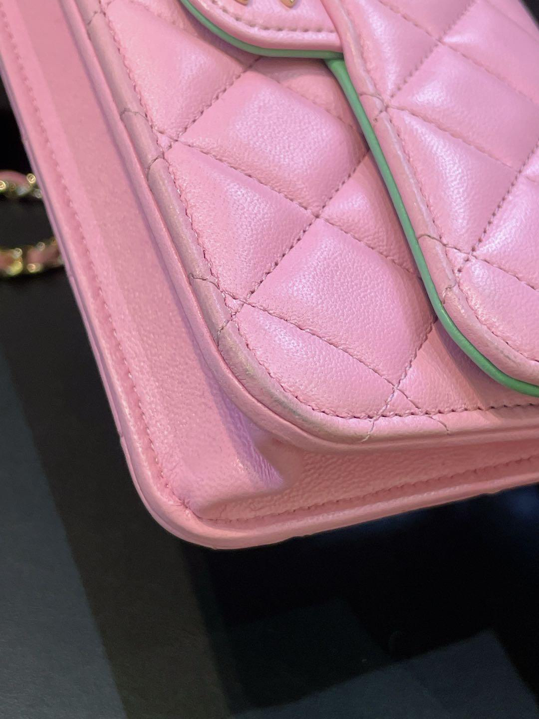 【商品詳情】正品二手 Chanel cf 23p mini 手柄 羊皮 粉拼绿 链条包🐠95新 17*10 芯片款 大全套配件:票 说明书 防尘袋 盒子。边角正常使用感。精致可爱!