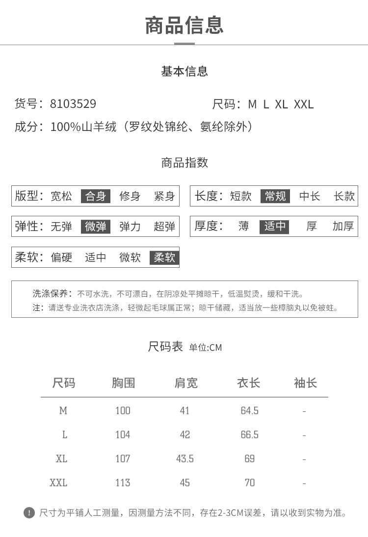 | 羊绒含量: 95%以上 | 尺码: 105/170/M 110/175/L 115/180/XL 120/185/XXL |