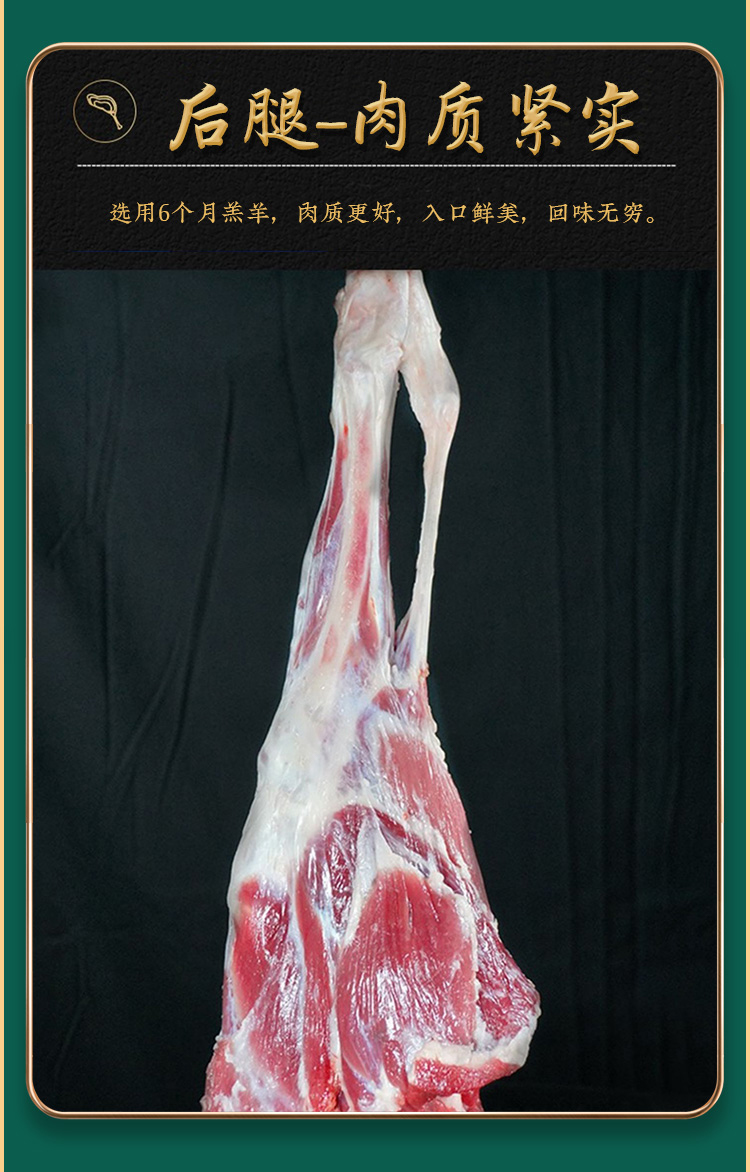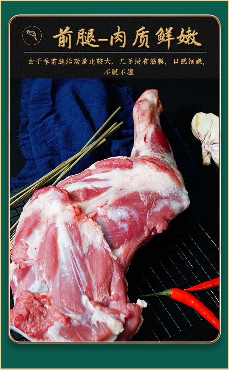 前腿肥瘦均匀、口感细嫩,适合制作手抓饭、烤羊腿;后腿瘦肉多、肥油少,可炖可炒。