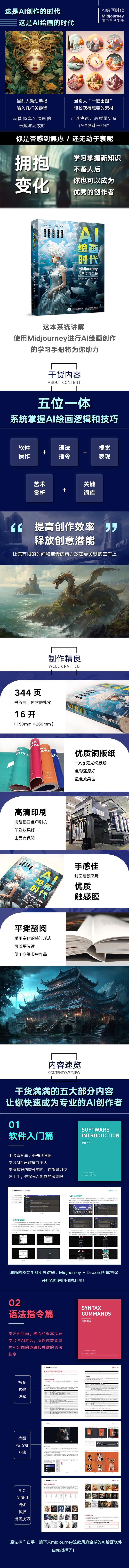 软件操作+语法指令+视觉表现+艺术赏析+关键词库,Midjourney AI绘画一站式学习。 介绍Discord安装与Midjourney注册的方法,以及语法指令的使用技巧。 贴心地为读者提供了大量的AI绘画案例,让读者在实践中掌握AI的应用方法和技巧。 提供了大量的关键词,可以为读者的AI绘画创作做准备。 展示的一些艺术家的作品可供读者赏析。 在AI的世界中激发新的创作灵感,开拓新的思路,将AI绘画技术应用到实际工作中,提高设计水平。