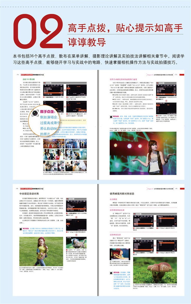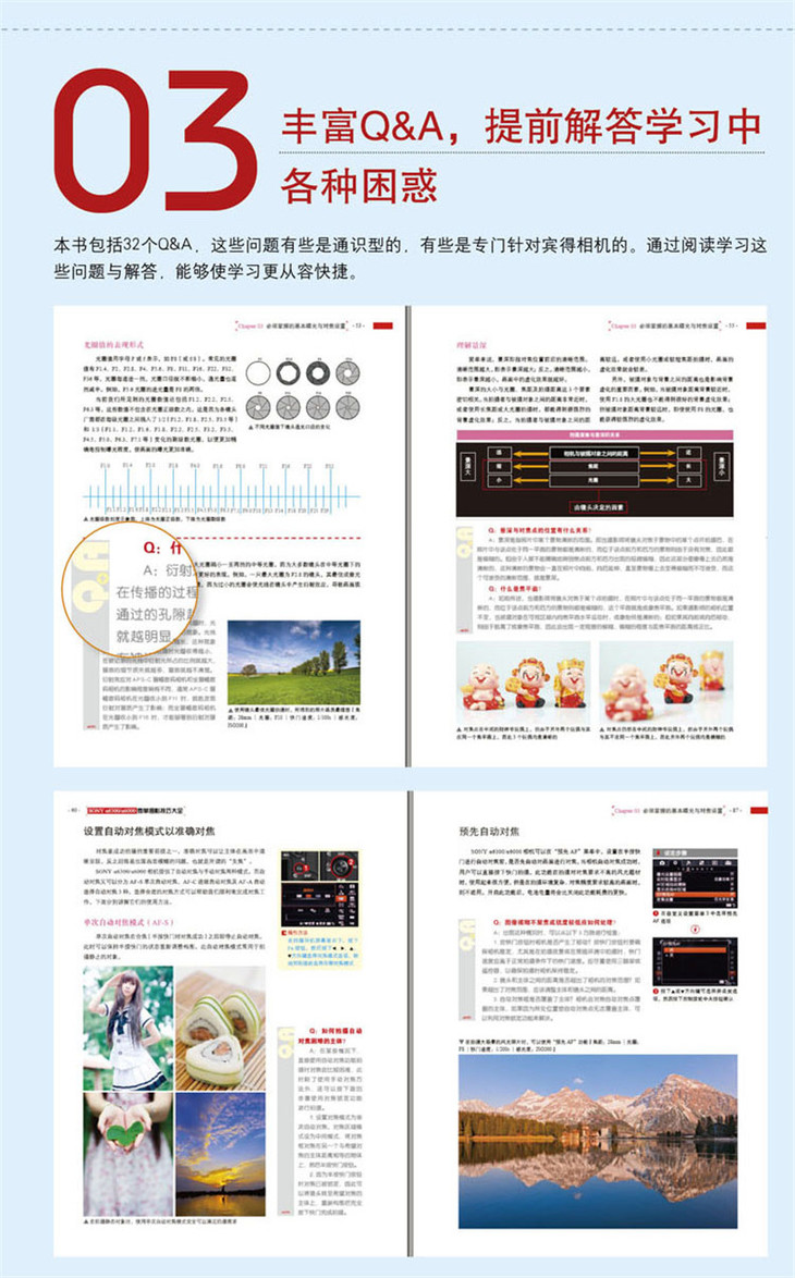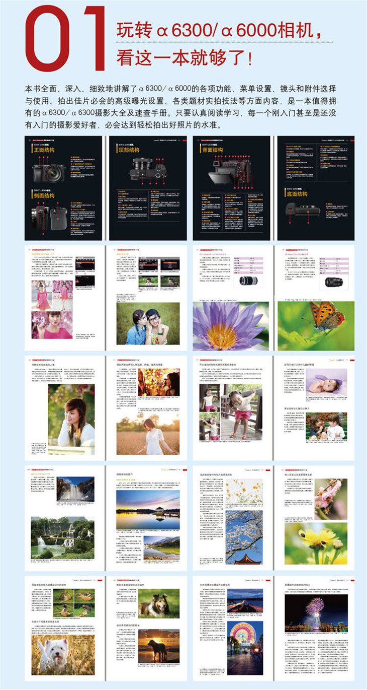 在相机功能及拍摄参数设置方面,本书不仅针对α6300/α6000相机结构、菜单功能以及光圈、快门速度、白平衡、感光度、曝光补偿、测光模式、对焦模式、拍摄模式等设置技巧进行了详细的讲解,更有详细的菜单操作图示,即使是没有任何摄影基础的初学者也能够根据这样的图示,玩转相机的菜单及功能设置。