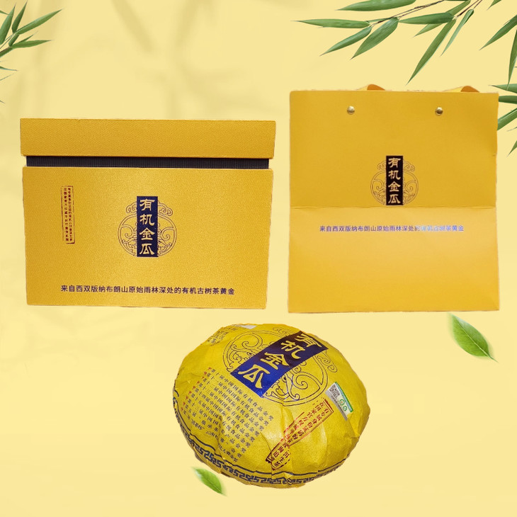 有机金瓜古树普洱生茶精选有机古树茶园百年树龄的古树茶,以2021年采摘的云南乔木大叶种纯料古树茶为原料,在有机干仓内历时两年的有机转化,2023年有机食品生产专线压制而成。